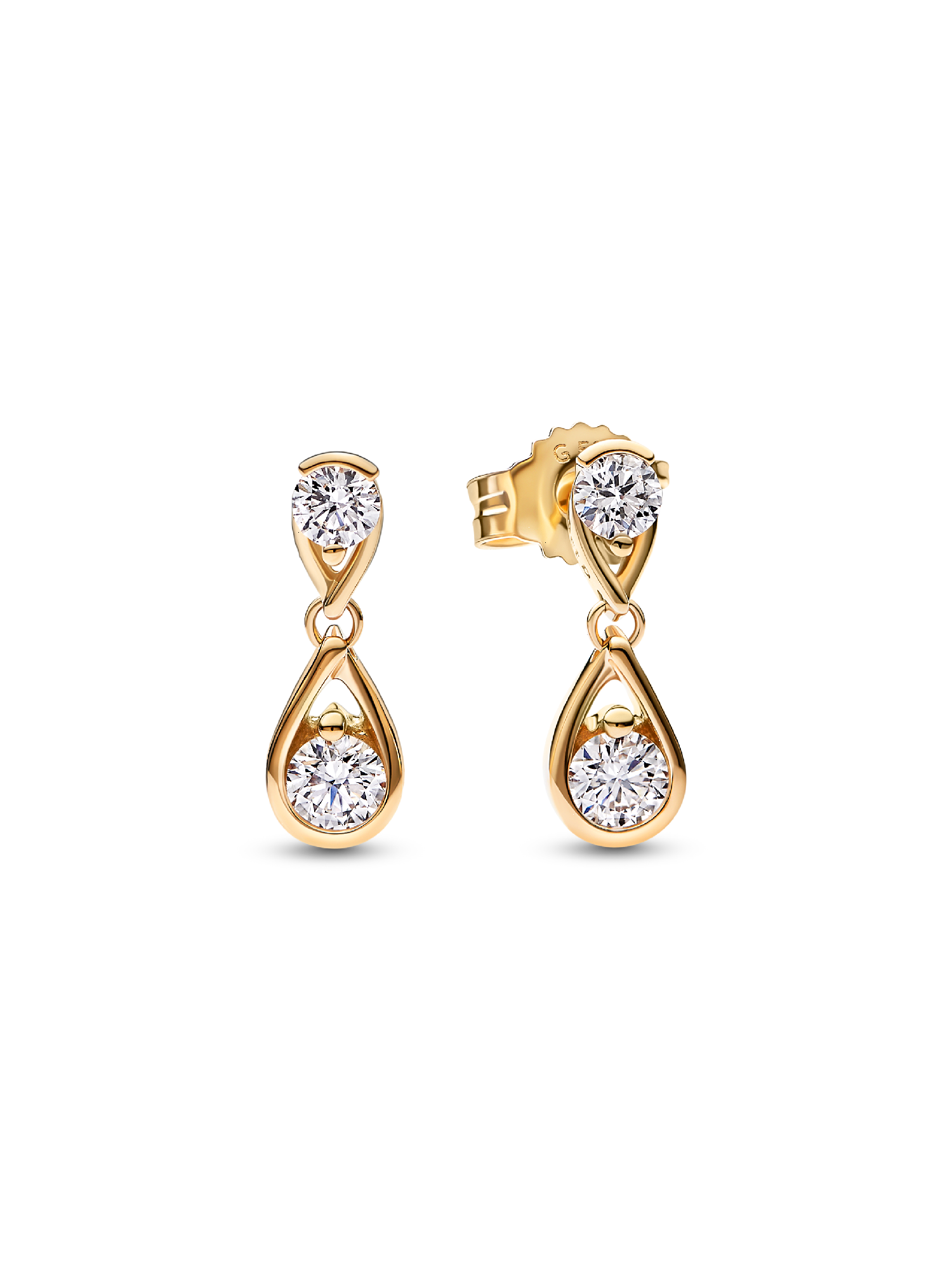 Celebrate your infinite potential with our Pandora Infinite 14k Gold Double Lab-grown Diamond Drop Earrings. Hand-set in solid 14k gold, each earring features two round brilliant excellent cut lab-grown diamonds linked together to create an elegant drop style. A 0.10 carat lab-grown diamond is placed on the stud inside an infinity loop, appearing to float weightlessly in a prong-and-partial-bezel setting. A 0.15 carat lab-grown diamond dangles beneath, also encased inside an infinity loop. The modern design flows seamlessly around the stones, totaling 0.50 carat, to represent your eternal bonds. Each Pandora Lab-grown diamond is treated with a post-growth color enhancement called annealing.