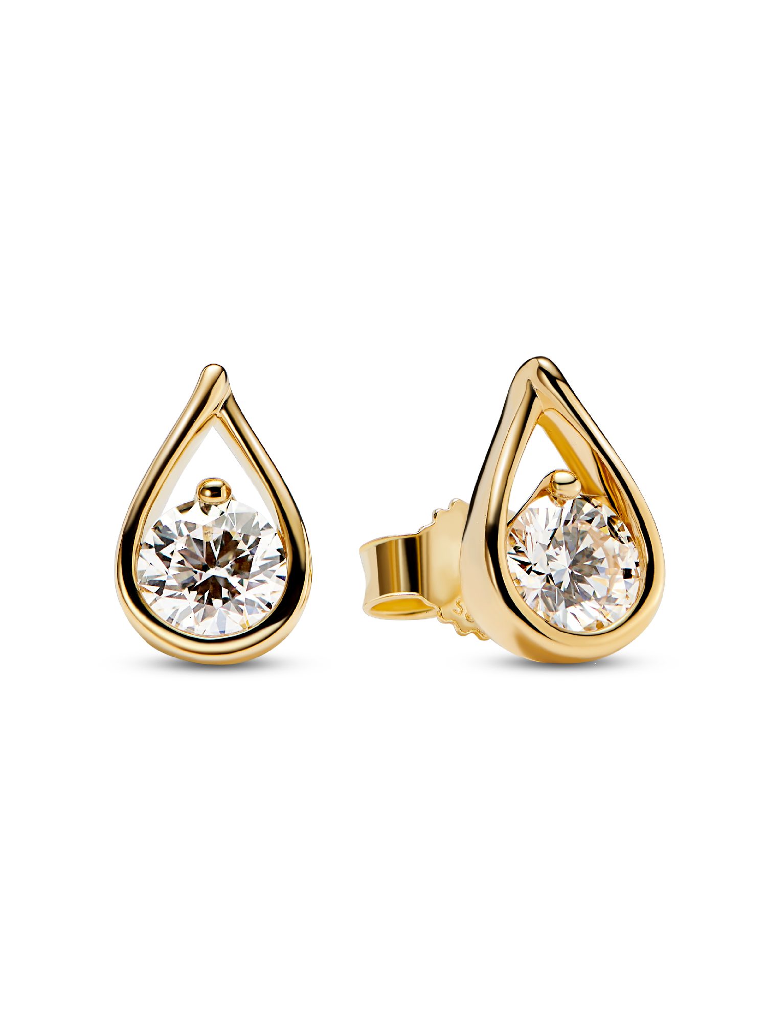 A pair of solid 14k yellow gold stud earrings each hand set with a 0.50 carat lab-grown diamond. A sparkling celebration of the infinite potential within all of us, these earrings feature a radiant round brilliant excellent cut lab-grown diamond suspended in our modern infinity setting. Pandora Infinite lab-grown diamonds at and above 0.50 carat are certified by IGI. Each Pandora Lab-grown diamond is treated with a post-growth color enhancement called annealing.