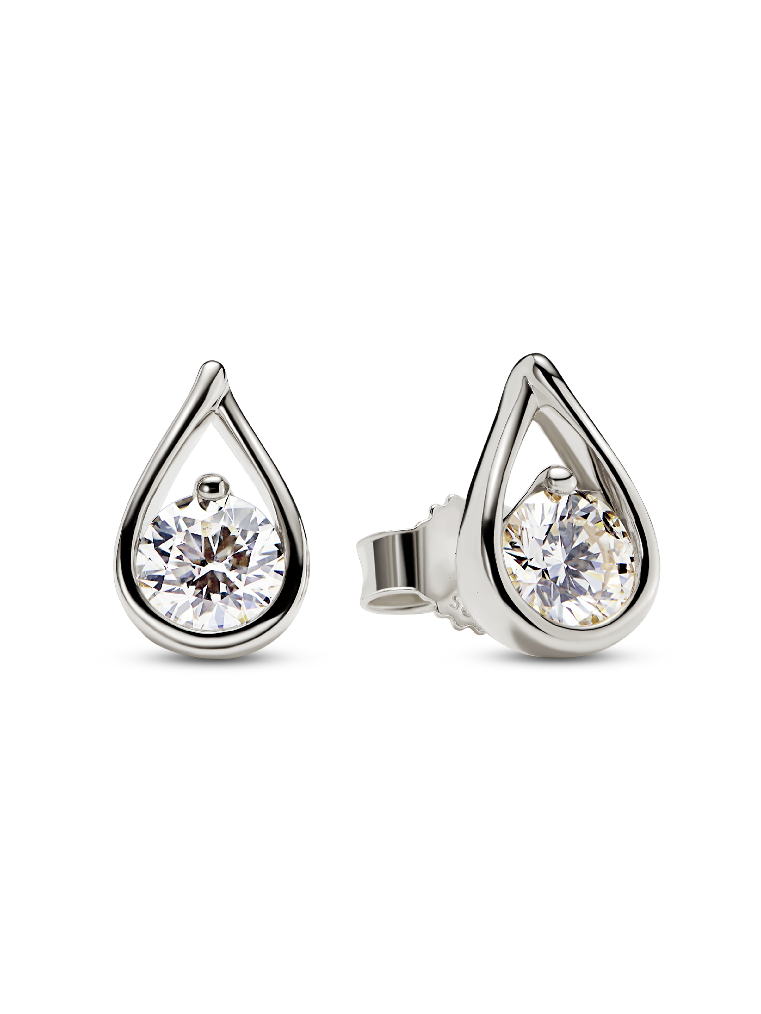 A pair of solid 14k white gold stud earrings each hand set with a 0.50 carat lab-grown diamond. A sparkling celebration of the infinite potential within all of us, these earrings feature a radiant round brilliant excellent cut lab-grown diamond suspended in our modern infinity setting. Pandora Infinite lab-grown diamonds at and above 0.50 carat are certified by IGI. Each Pandora Lab-grown diamond is treated with a post-growth color enhancement called annealing.