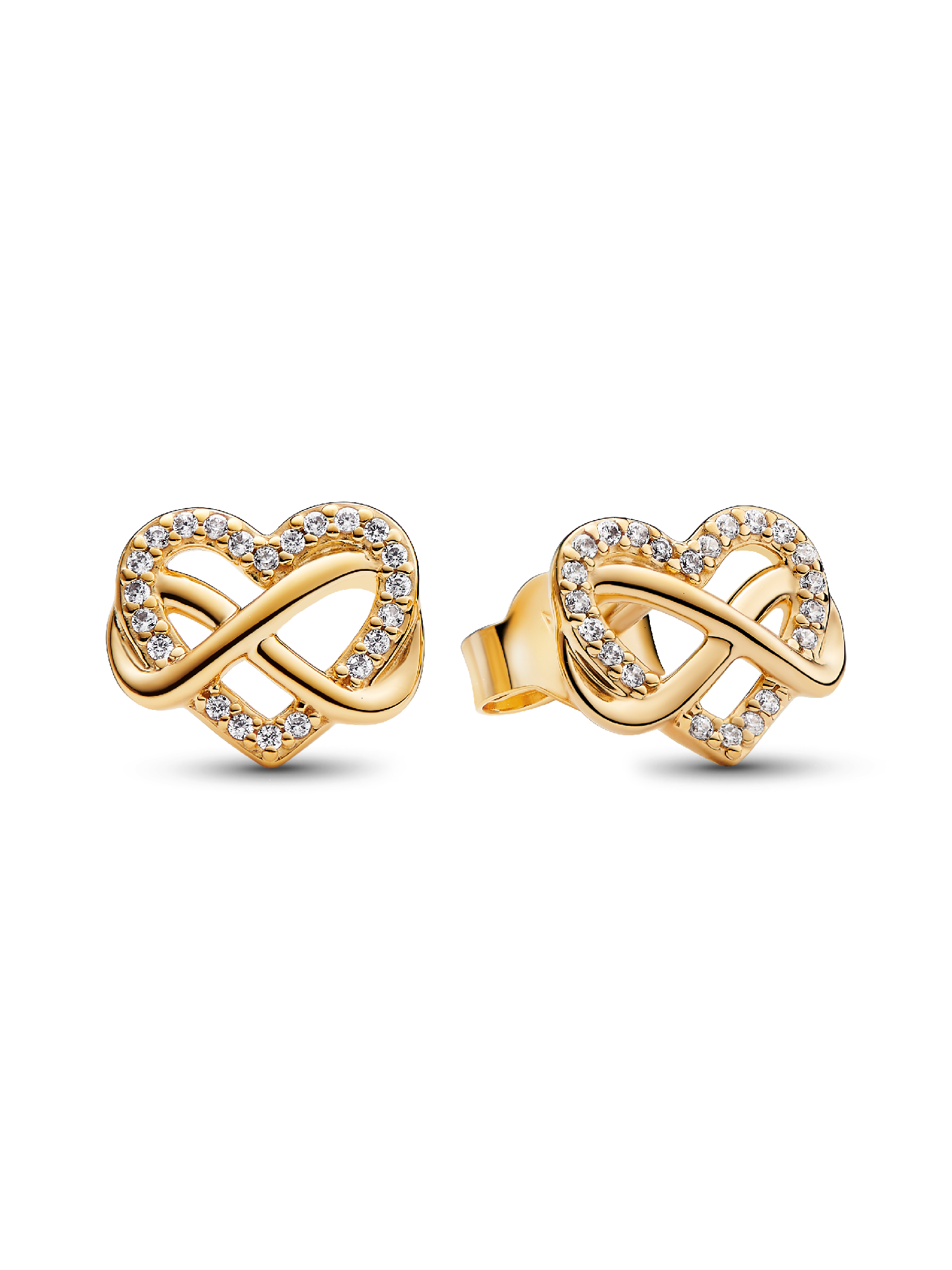 Embodying timeless love, our Sparkling Infinity Heart Stud Earrings from the Pandora Moments collection fuse elegance with symbolism. Crafted from a unique 14k gold-plated blend, the openwork heart, adorned with 44 micro bead-set cubic zirconia, cradles an asymmetric infinity symbol. Not just earrings, but a poetic dance of eternal connection. Notice the intricate mirrored design; each pair tells a story of immeasurable love, binding souls together in a beautifully crafted reminder of deep, infinite bonds.