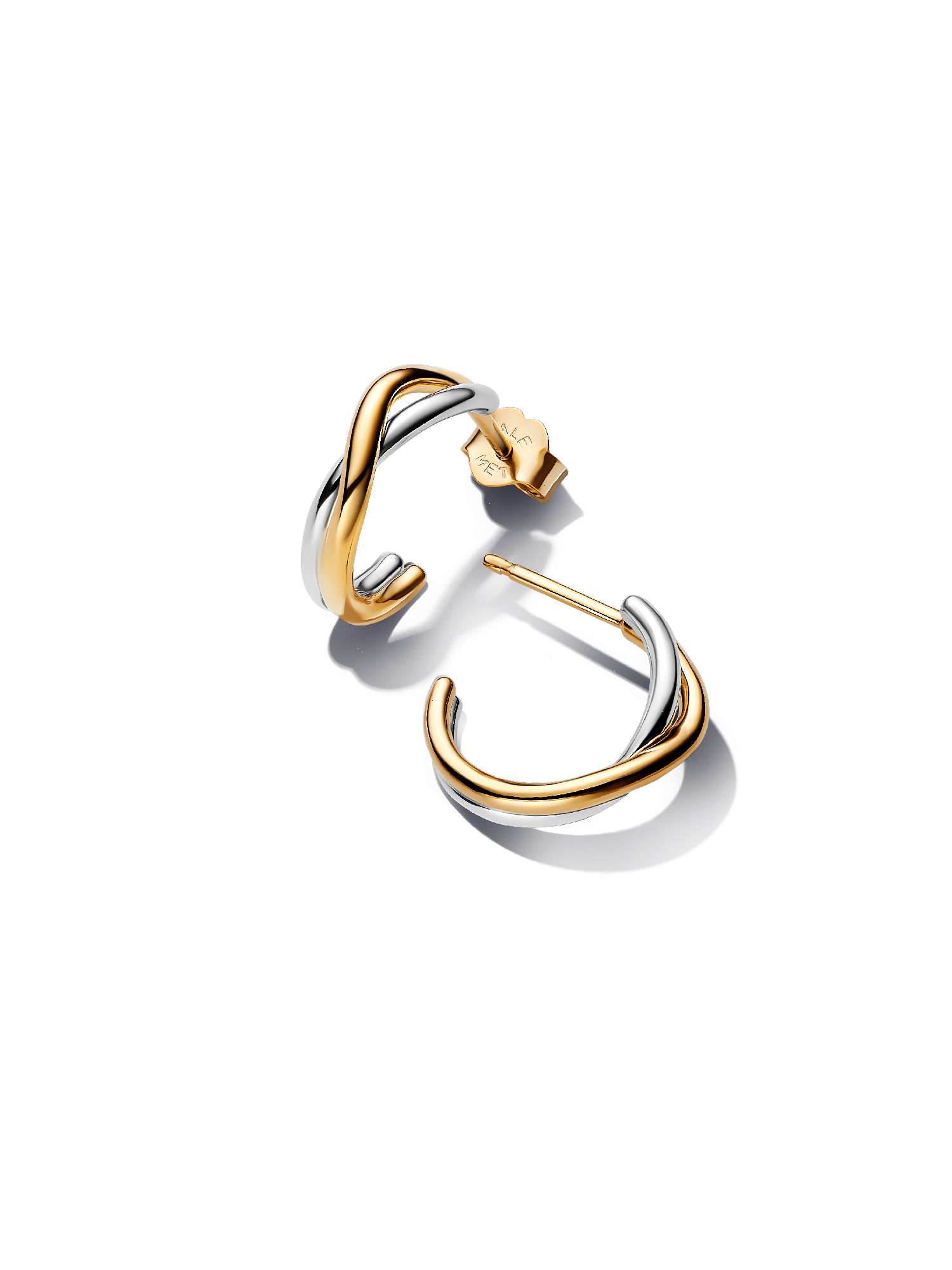 Discover the beauty of imperfection with these organically shaped hoop earrings. Featuring crossover lines in different metals, they add a touch of boldness to any outfit.