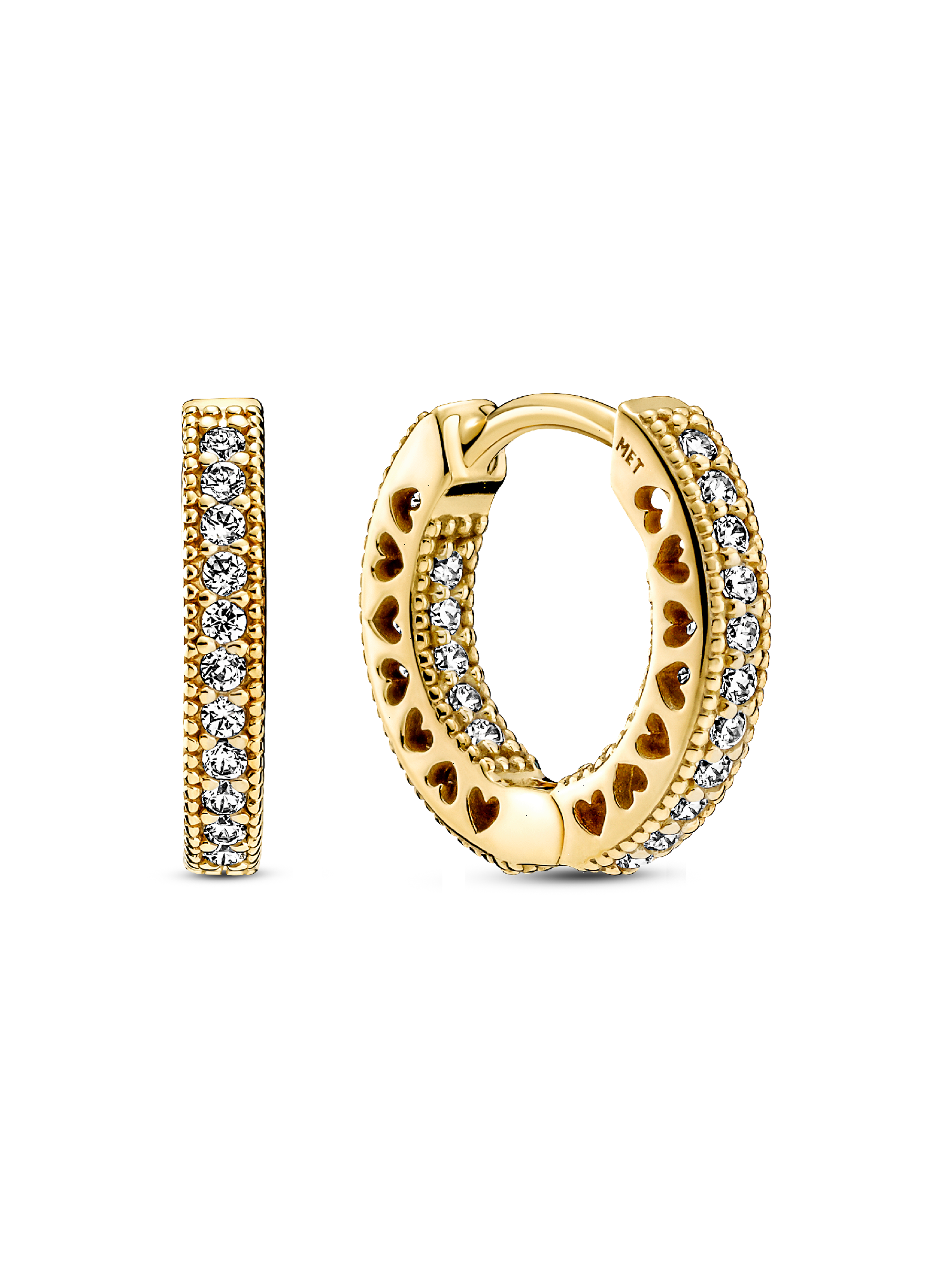 Frame your face with these warm-toned Pavé Heart Hoop Earrings. These 14k gold-plated hoops are hand-finished and embellished with sparkling clear cubic zirconia pavé and micro-beading inside and outside the hoop, along with cut-out hearts on the sides. Geometric, sophisticated and versatile, these hoops will be just as stylish when worn with a simple daytime look or dressed up for a special occasion.