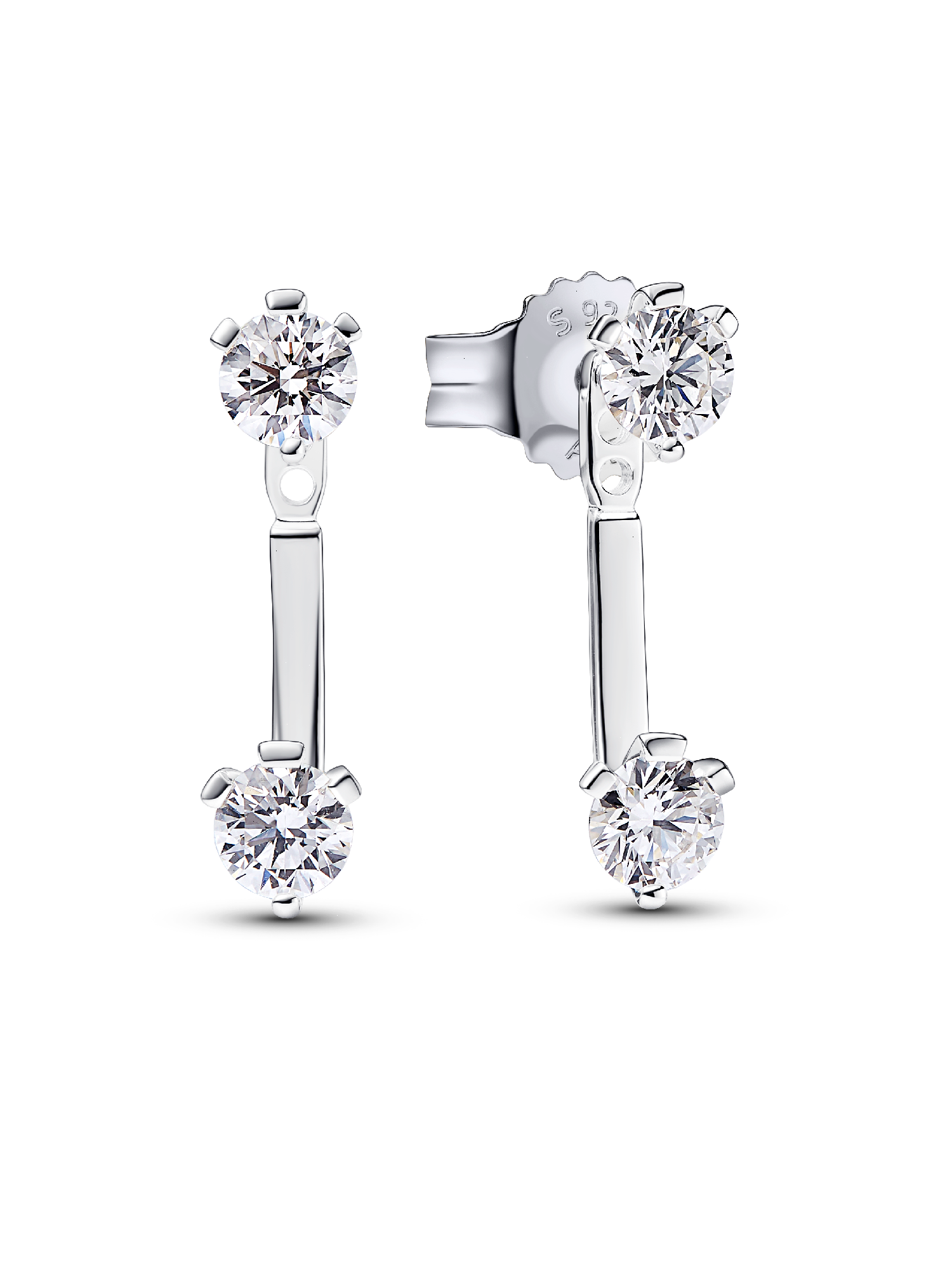 Shine in the Pandora Nova Sterling Silver Lab-grown Diamond Stud Drop Jacket Earrings. Inspired by the illusion of capturing and holding a precious fragment of light, these sterling silver stud earrings are sold as a pair and feature four lab-grown diamonds with a total carat weight of 1.00. A unique asymmetrical prong setting frames each stone, letting the light shine through to amplify its sparkle. Each earring has a detachable jacket that can be added behind the ear, so the lab-grown diamond sits just below the earlobe. Style them with or without the earring jacket to take your look from classic to contemporary. Each Pandora Lab-grown diamond is treated with a post-growth color enhancement called annealing.