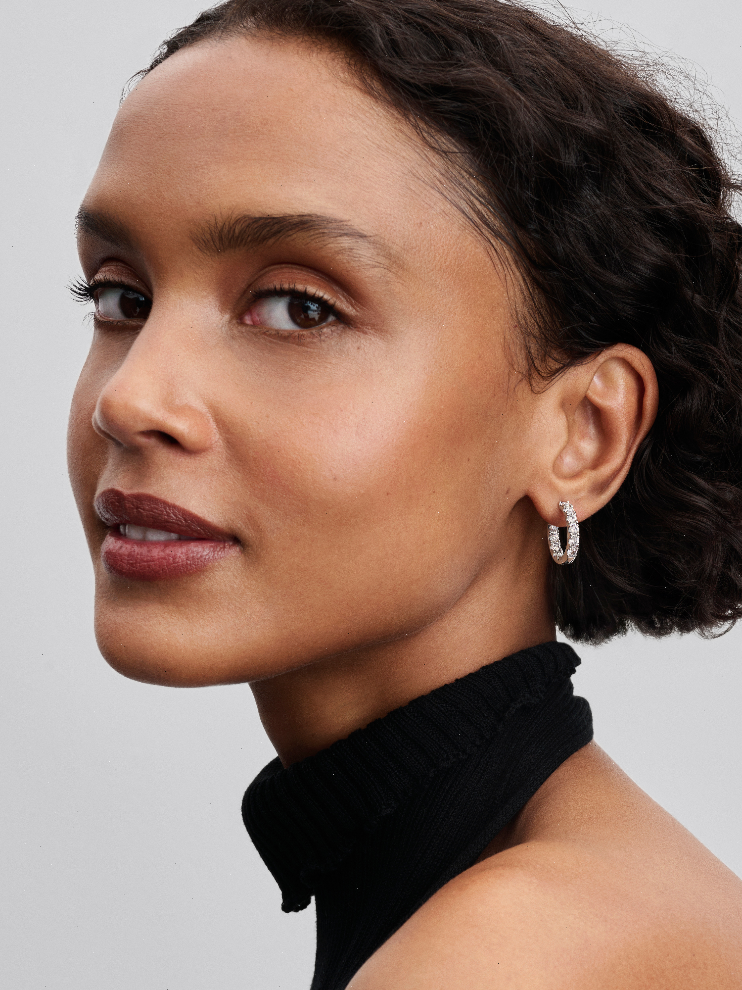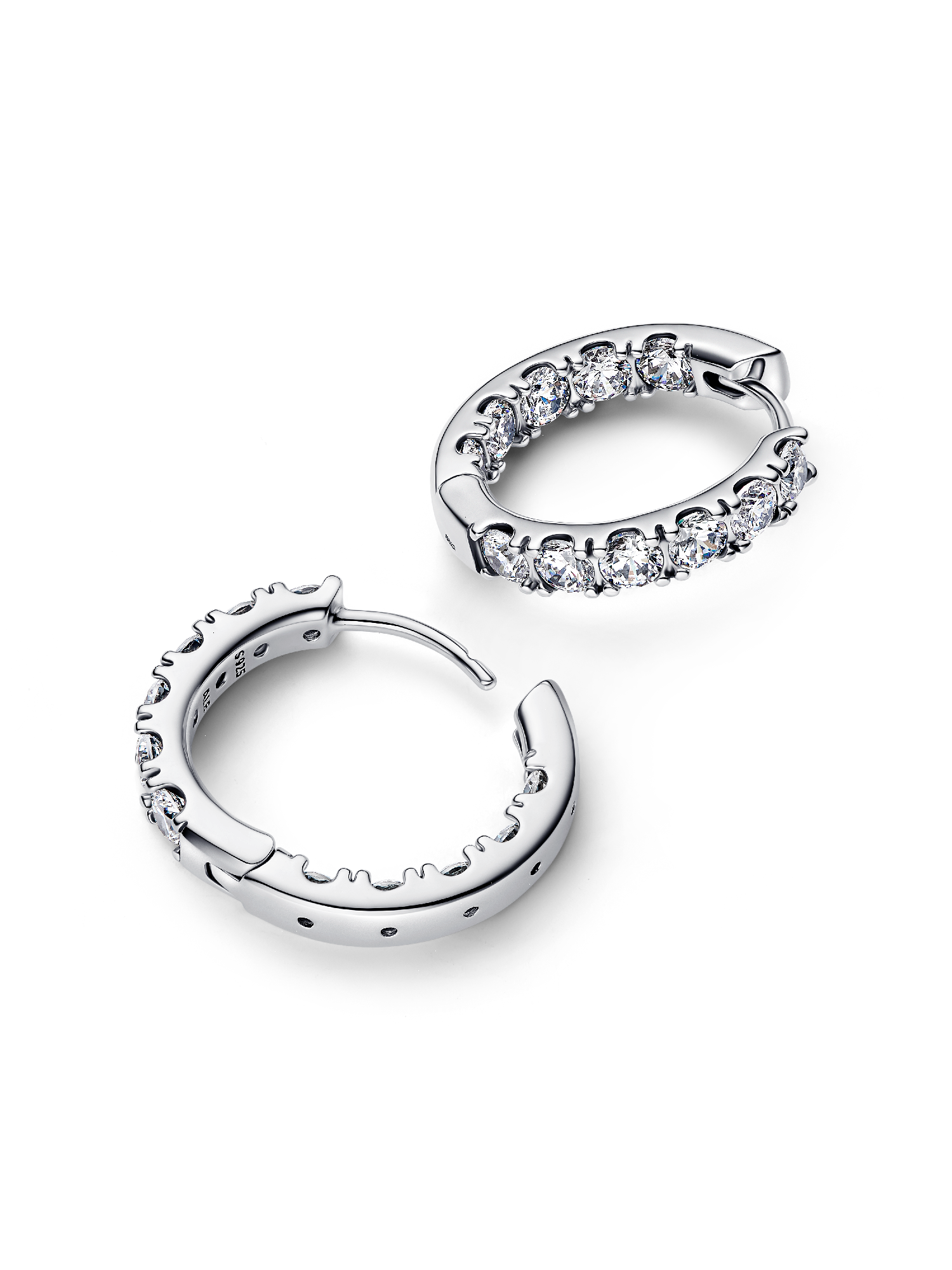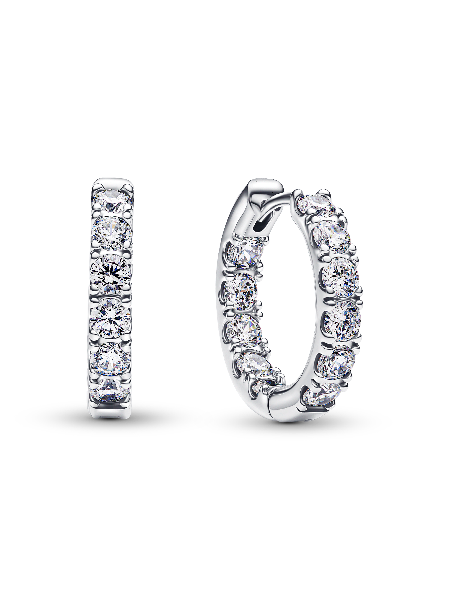 Select a versatile classic with the Sparkling Row Eternity Hoop Earrings. These sterling silver hoop earrings feature a squared profile, a row of sparkling stones and a polished back side. Simple yet striking, sparkling hoops are a staple of any collection. Stack them along with other sparkling styles on your ear or wear them alone to let them steal the show. These ultra-versatile hoops are equally appropriate with jeans as they are with an evening look.