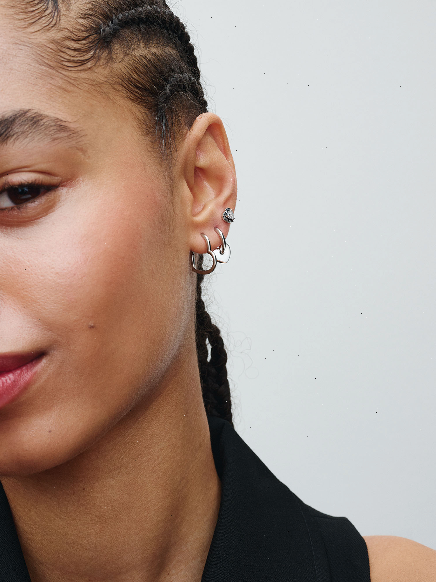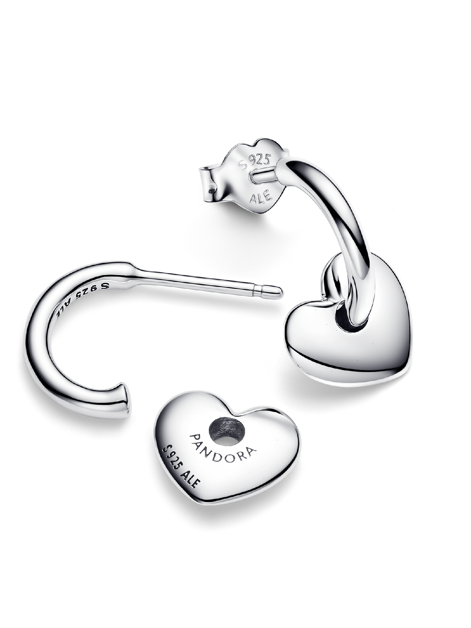 These earrings are a reminder to face the world with love. The sterling silver hoops feature a moveable heart dangle that faces forward, making a bold statement. Style yours with more heart-shaped hoops from Pandora Moments, to double up on love, or wear them as part of a personalized stack of your own.