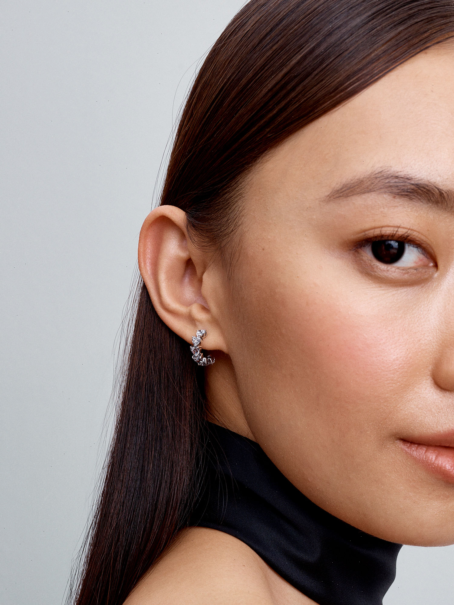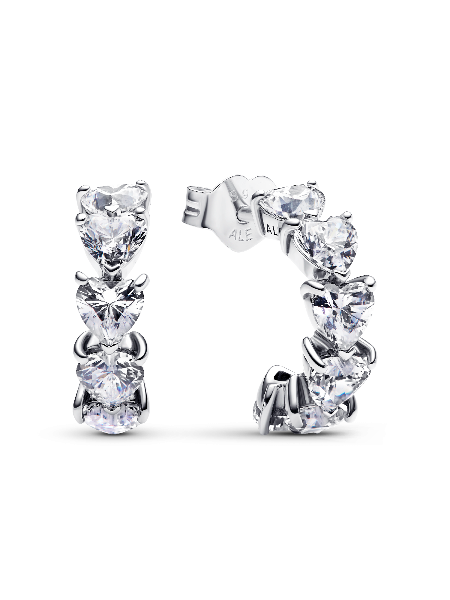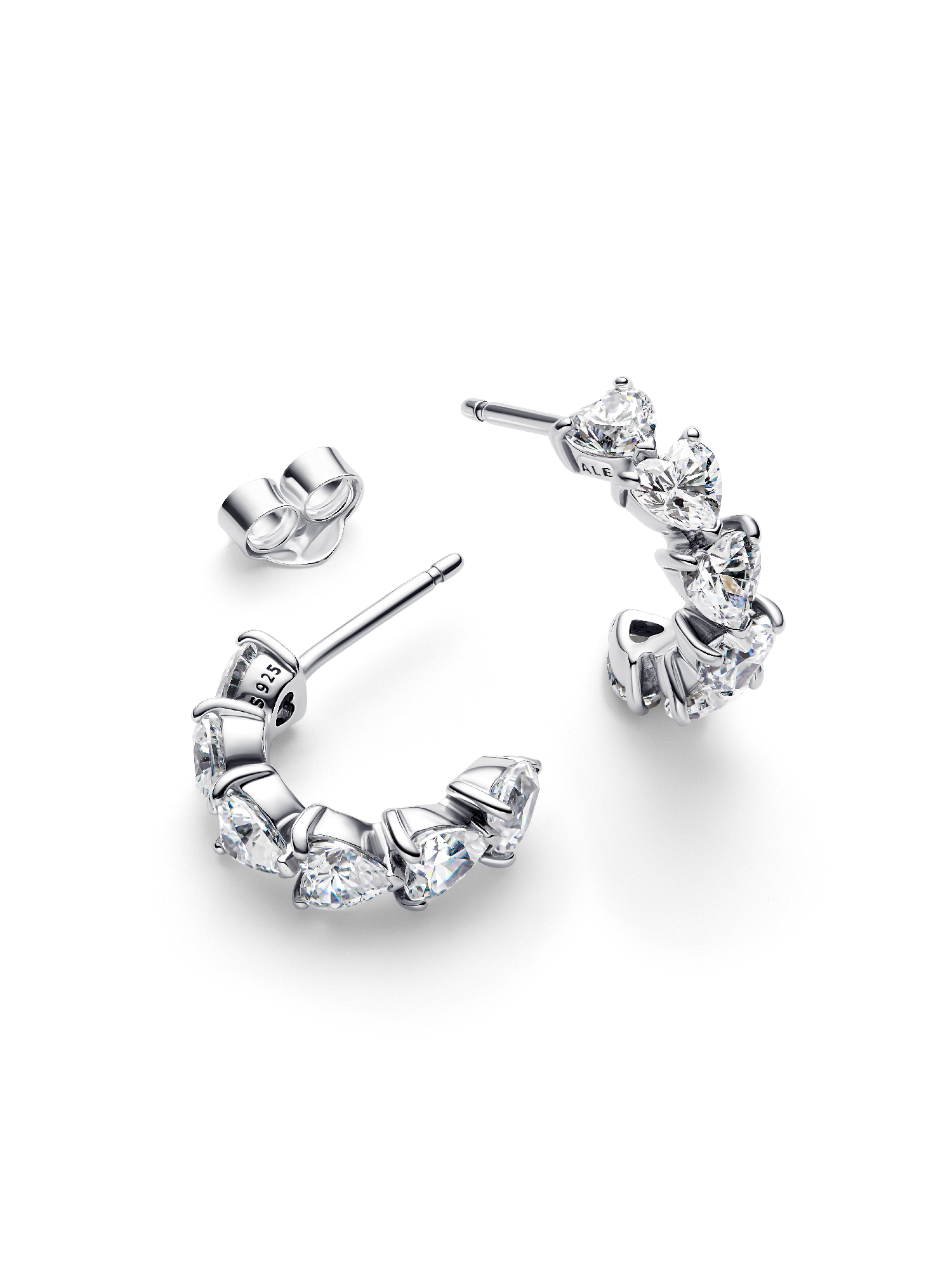 Listen with your hearts. Crafted in sterling silver, these sparkling open hoop earrings feature 12 heart-shaped cubic zirconia. Inspired by the profound bond of connected love, they make a meaningful gift for the special someone in your life. Style with more heart-shaped earrings to load up on love or wear them alone as a romantic statement.
