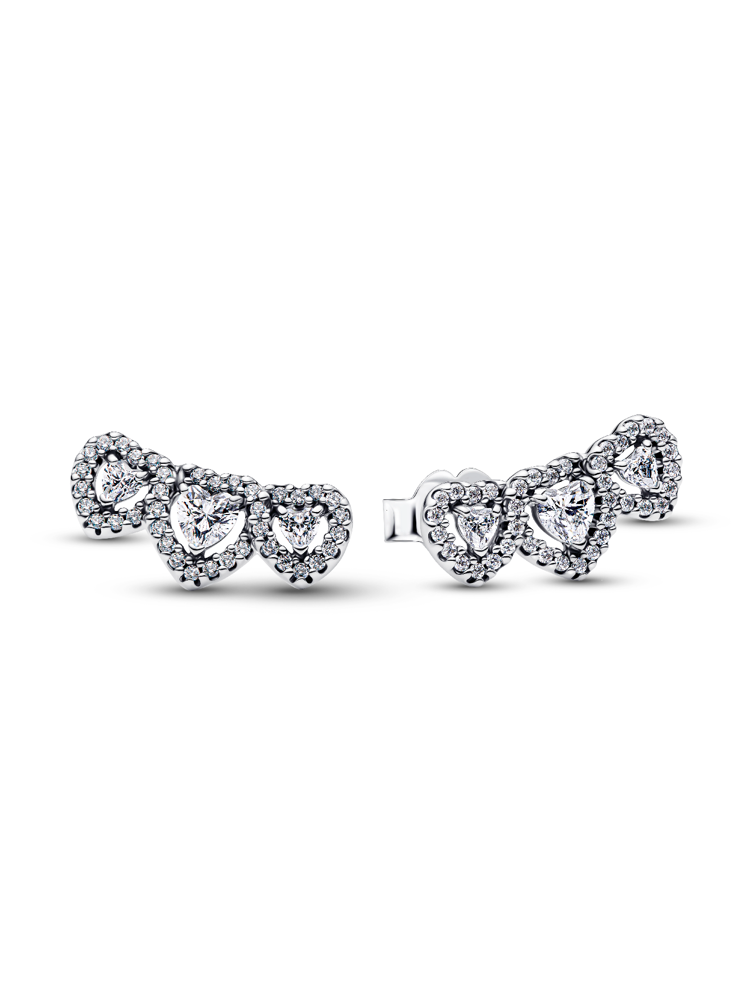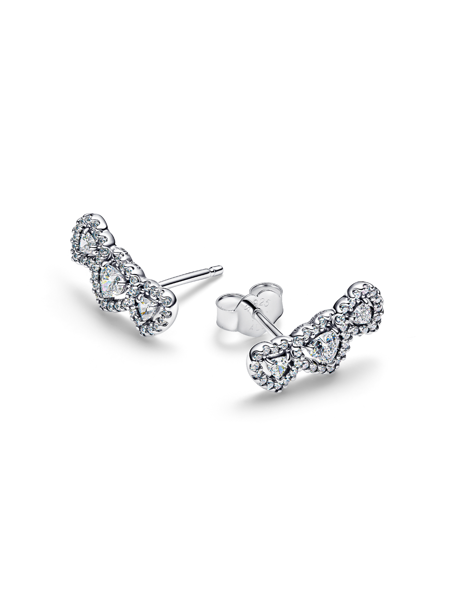 Radiate love Sold as a pair, these sterling silver stud earrings feature three heart-shaped stones connected by a halo of sparkling pavé. the perfect gift for yourself or someone special.