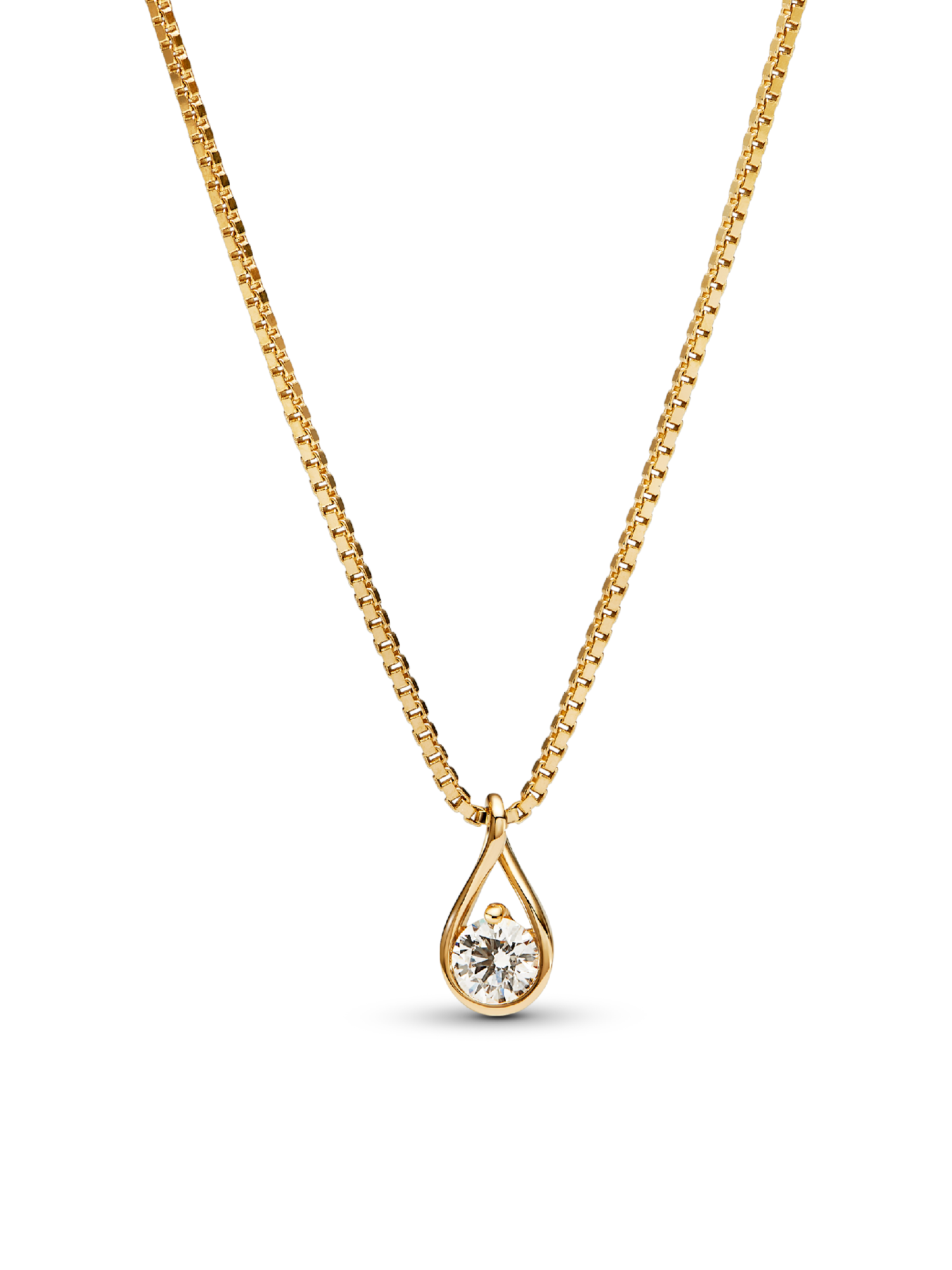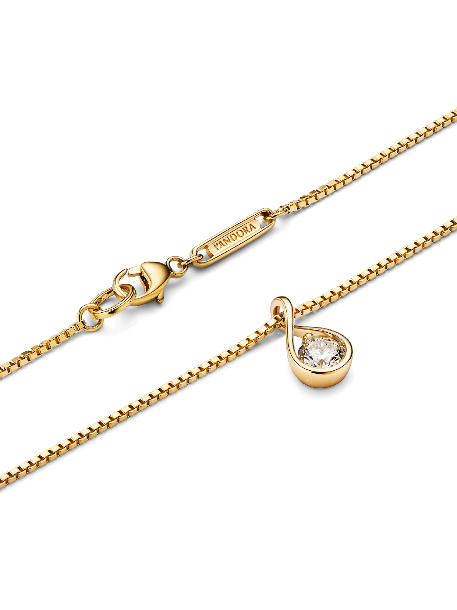 This 14k gold pendant is hand-set with a radiant 0.25 carat lab-grown diamond on a matching 14k gold box chain necklace. A powerful reminder of all we are, all we can be and the infinite possibility the future holds, this pendant features a round brilliant excellent cut lab-grown diamond in a modern infinity setting that flows around the stone and suspends it in mid-air. An elevated piece that will shine on any neckline. Each Pandora Lab-grown diamond is treated with a post-growth color enhancement called annealing.