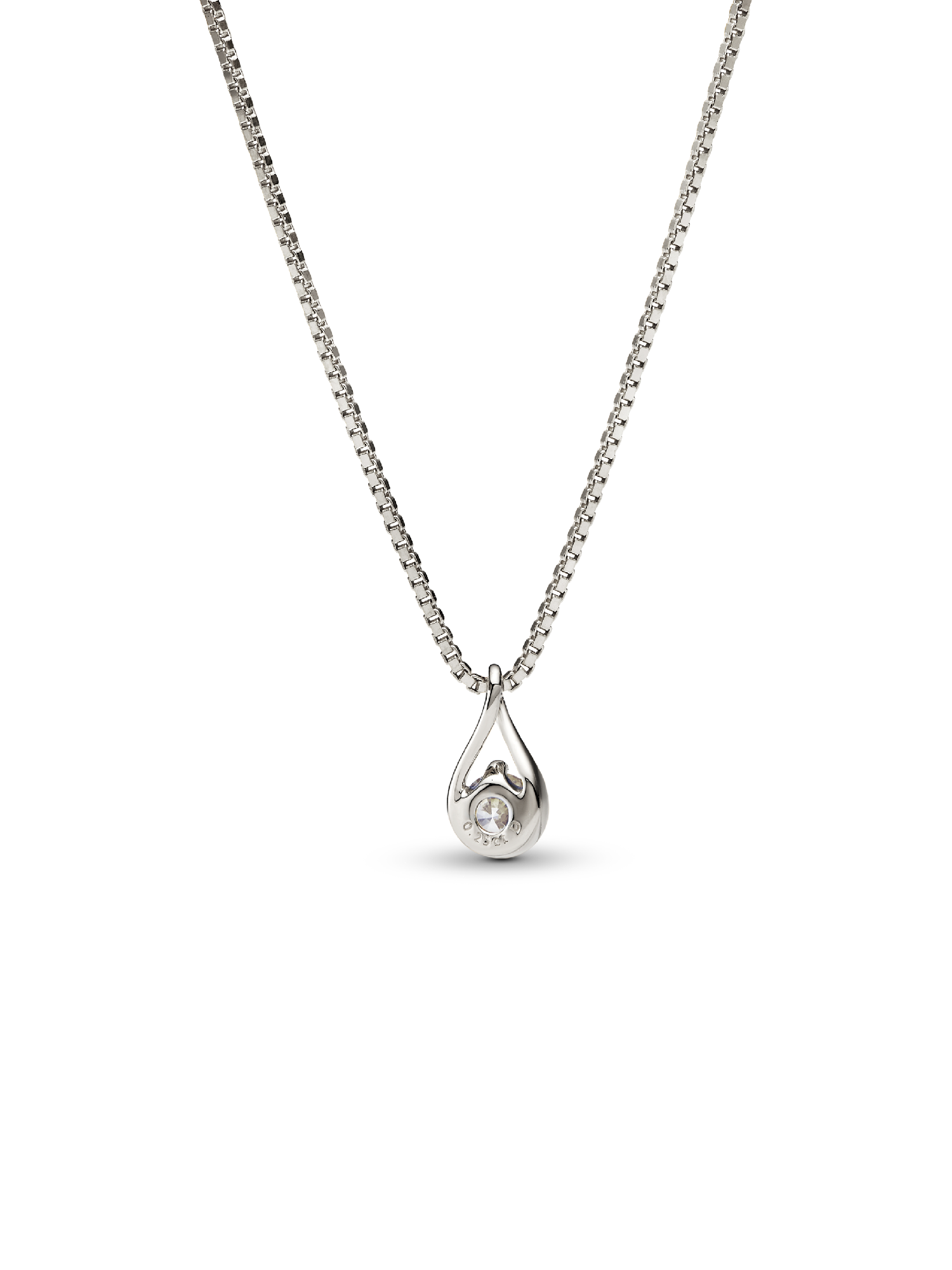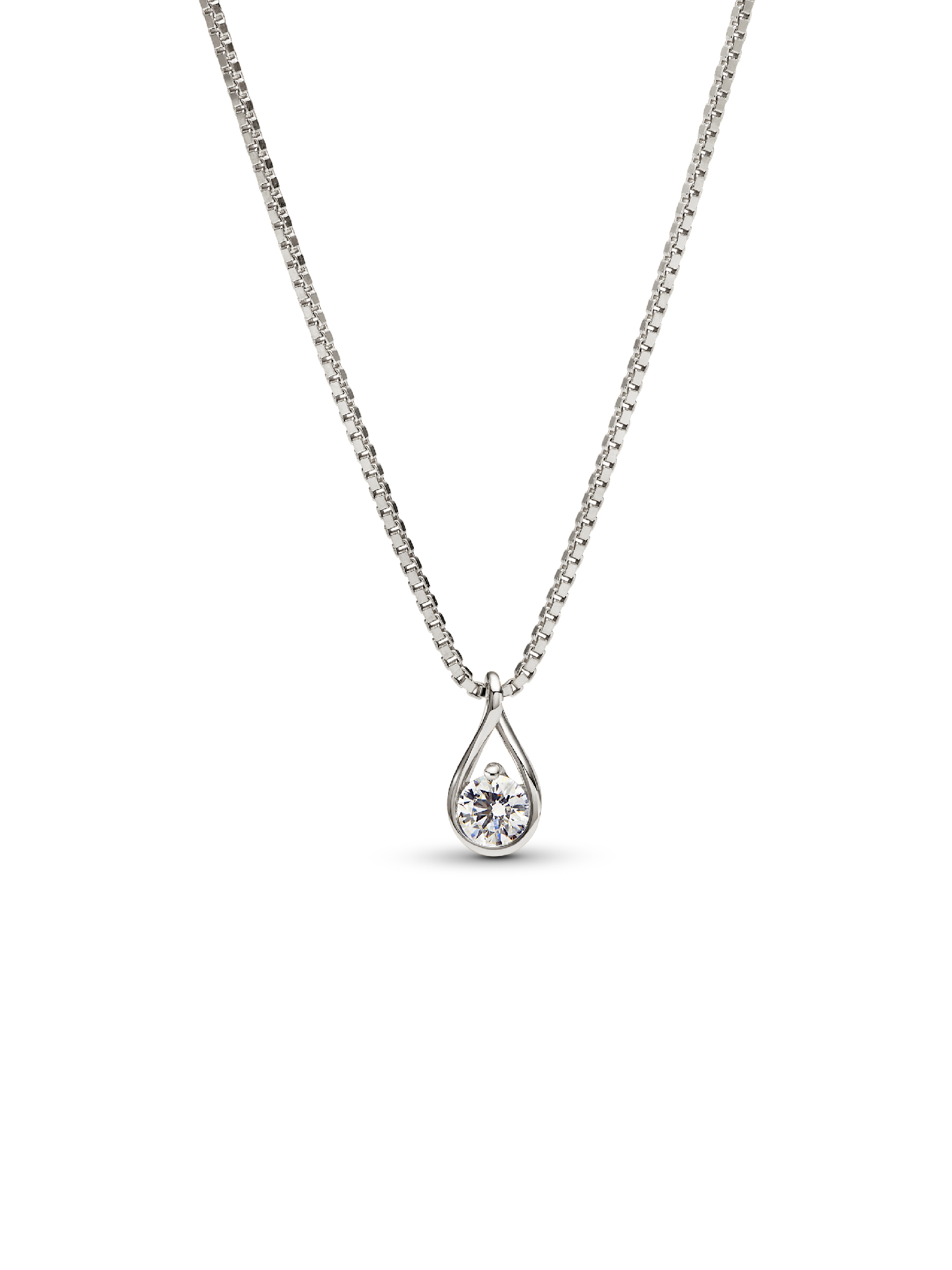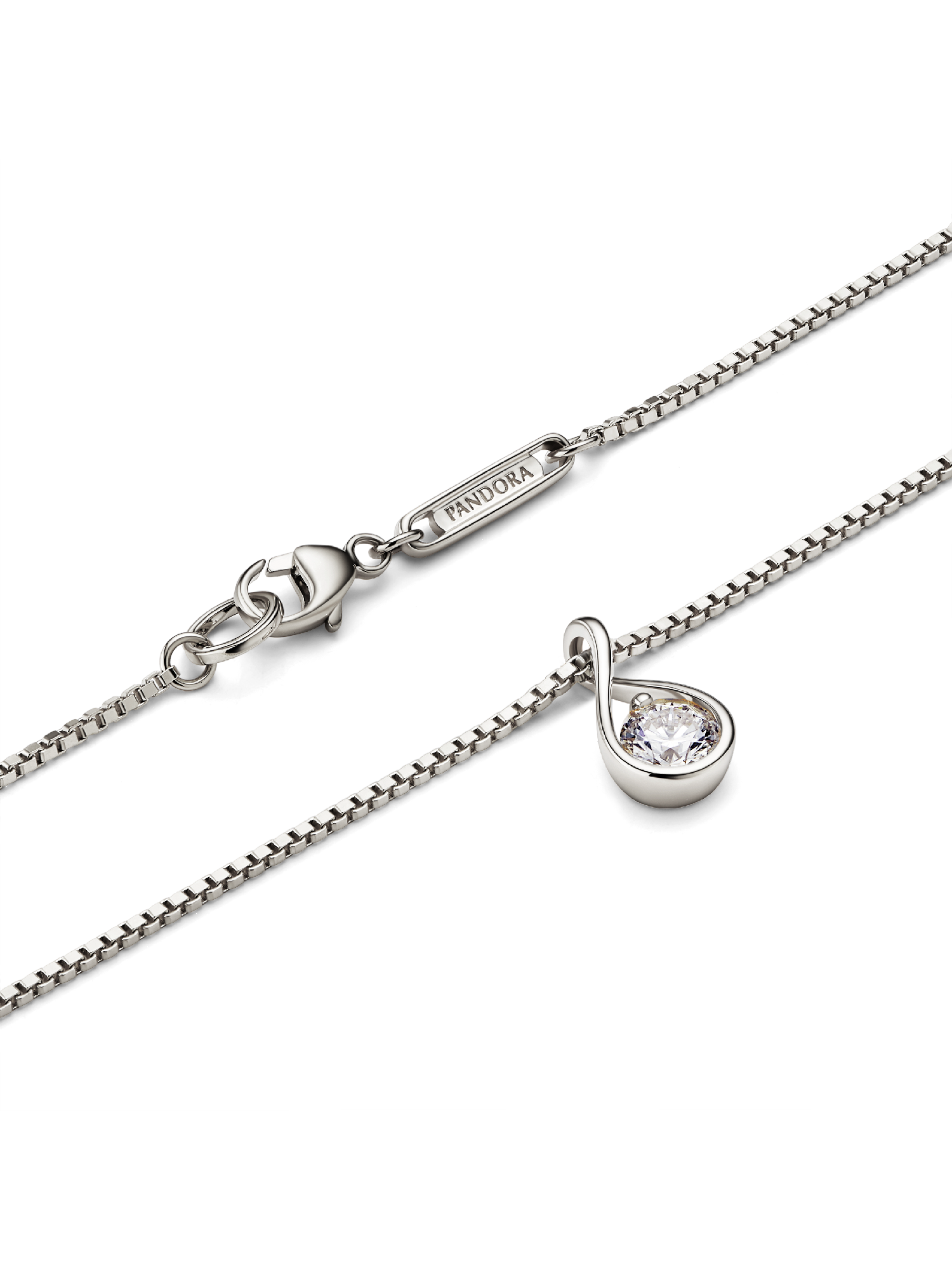 This 14k white gold pendant is hand-set with a radiant 0.25 carat lab-grown diamond on a matching 14k white gold box chain necklace. A powerful reminder of all we are, all we can be and the infinite possibility the future holds, this pendant features a round brilliant excellent cut lab-grown diamond in a modern infinity setting that flows around the stone and suspends it in mid-air. An elevated piece that will shine on any neckline. Each Pandora Lab-grown diamond is treated with a post-growth color enhancement called annealing.