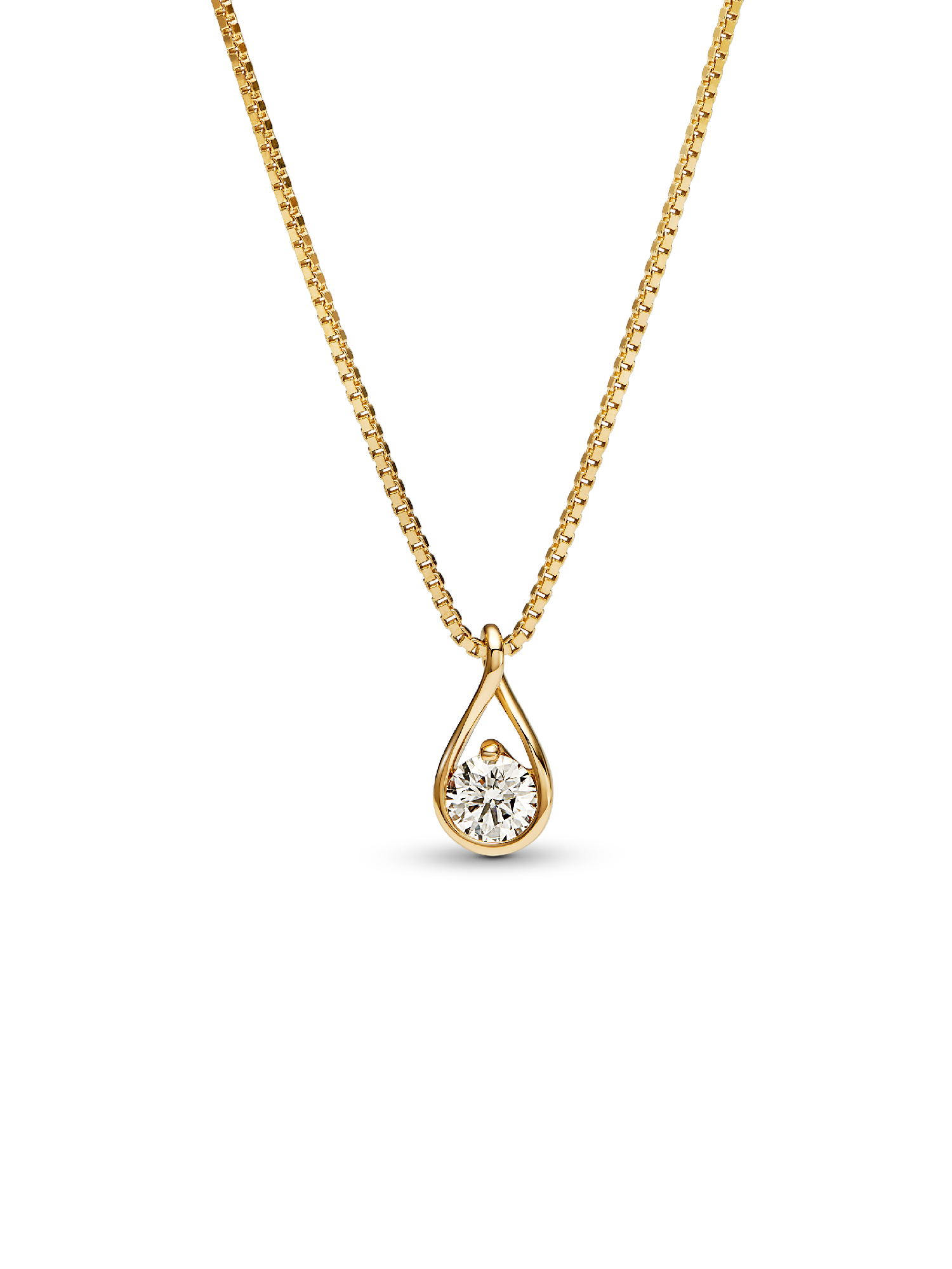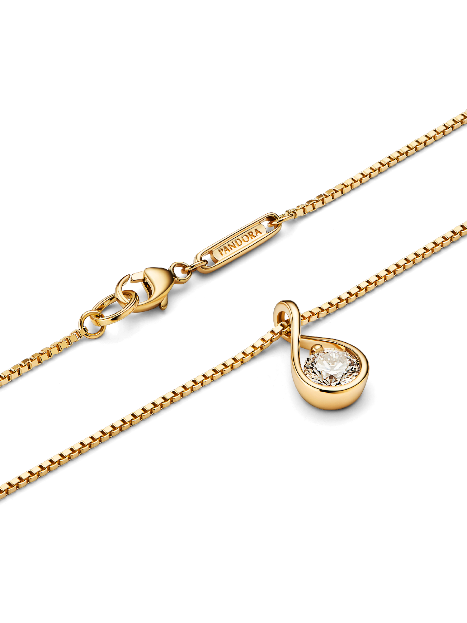 This 14k gold pendant is hand-set with a radiant 0.50 carat lab-grown diamond on a matching 14k gold box chain necklace. A powerful reminder of all we are, all we can be and the infinite possibility the future holds, this pendant features a round brilliant excellent cut lab-grown diamond in a modern infinity setting that flows around the stone and suspends it in mid-air. An elevated piece that will shine on any neckline. Pandora Infinite lab-grown diamonds at and above 0.50 carat are certified by IGI. Each Pandora Lab-grown diamond is treated with a post-growth color enhancement called annealing.