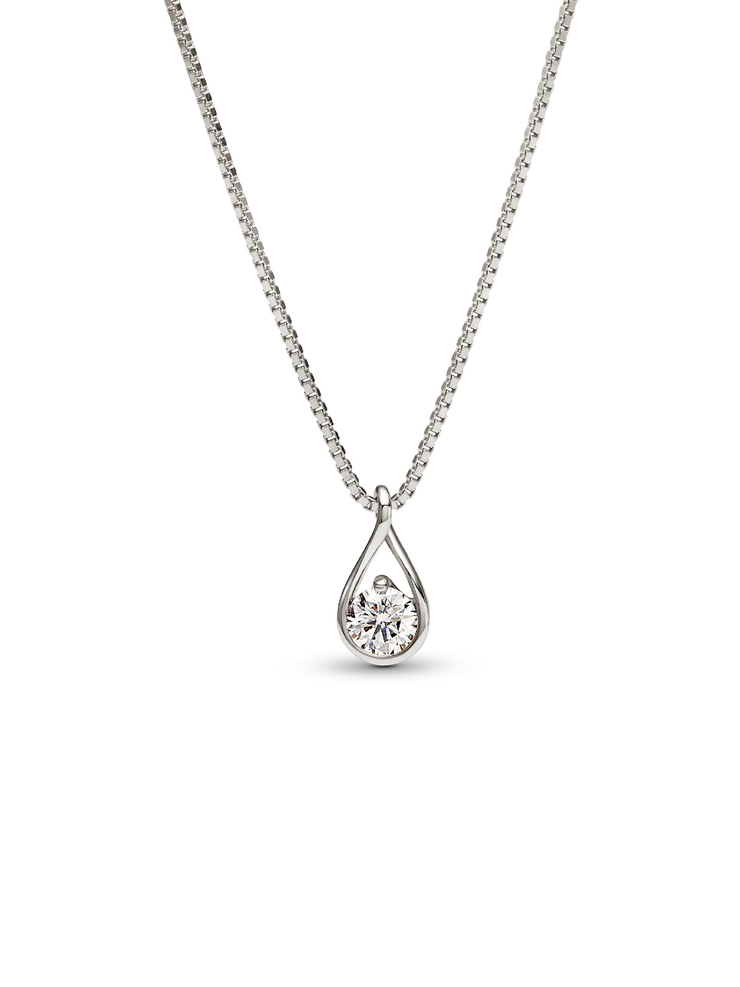 This 14k white gold pendant is hand-set with a radiant 0.50 carat lab-grown diamond on a matching 14k white gold box chain necklace. A powerful reminder of all we are, all we can be and the infinite possibility the future holds, this pendant features a round brilliant excellent cut lab-grown diamond in a modern infinity setting that flows around the stone and suspends it in mid-air. An elevated piece that will shine on any neckline. Pandora Infinite lab-grown diamonds at and above 0.50 carat are certified by IGI. Each Pandora Lab-grown diamond is treated with a post-growth color enhancement called annealing.