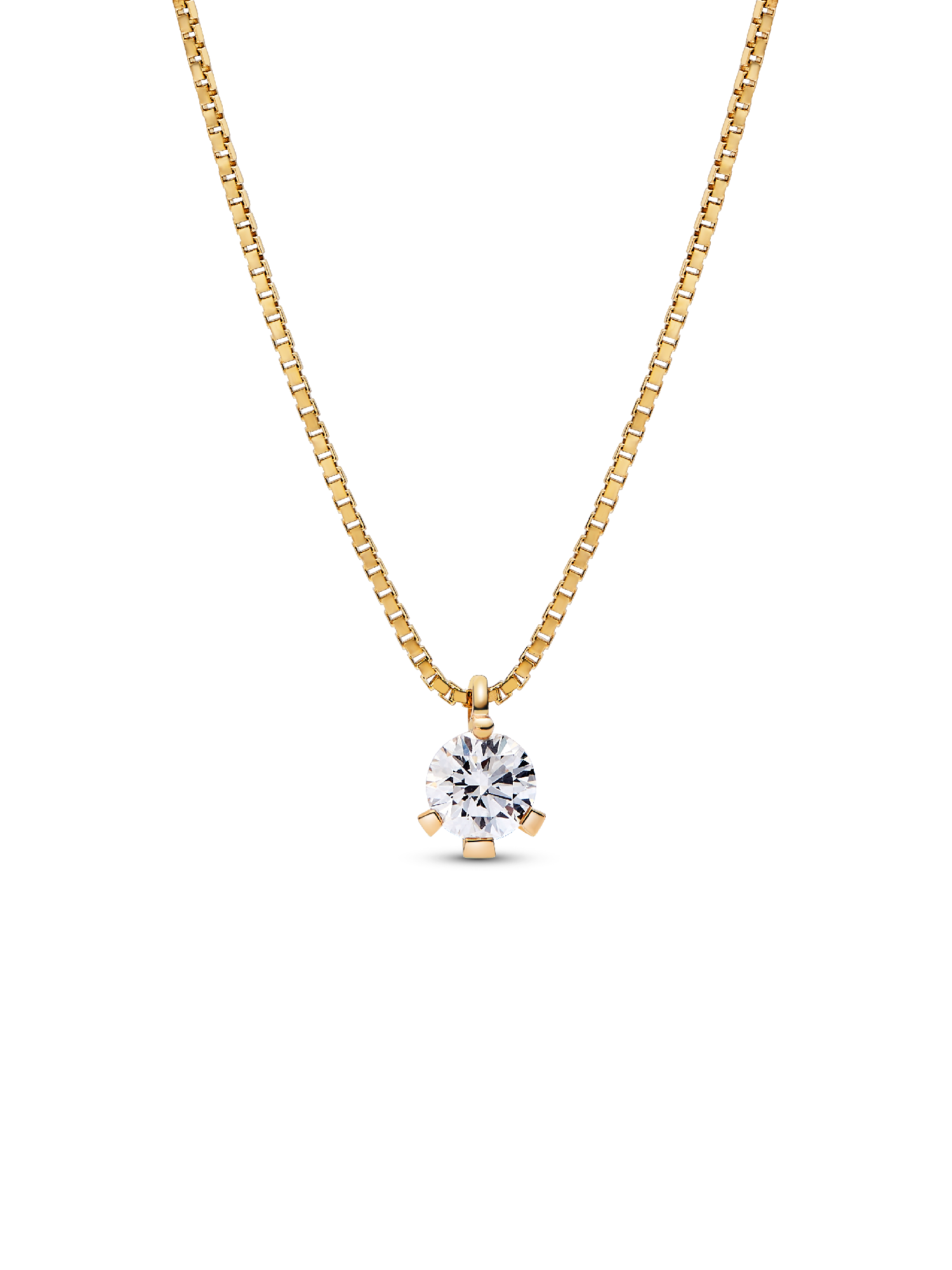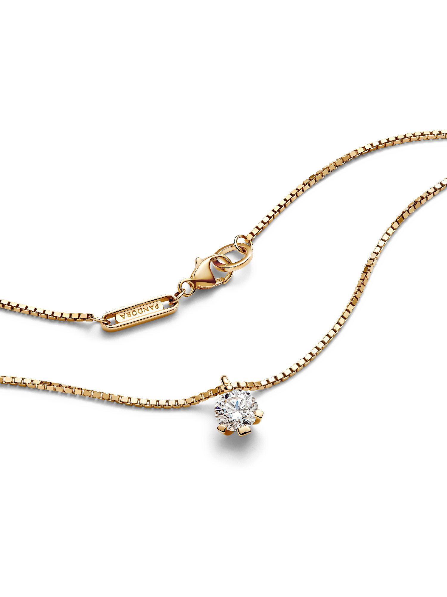 Shine in the Pandora Nova 14k Gold Lab-grown Diamond Pendant Necklace. Inspired by the illusion of capturing and holding a precious fragment of light, this luminous lab-grown diamond necklace features a 0.50 carat round brilliant excellent cut lab-grown diamond set in 14k gold. An asymmetrical prong setting frames the stone and is attached to the chain with a hidden jump ring, making the pendant appear to float on the neckline. The 14k gold necklace chain is adjustable to two lengths. Wear it as a symbol of the unique light within all of us. Each Pandora Lab-grown diamond is treated with a post-growth color enhancement called annealing.