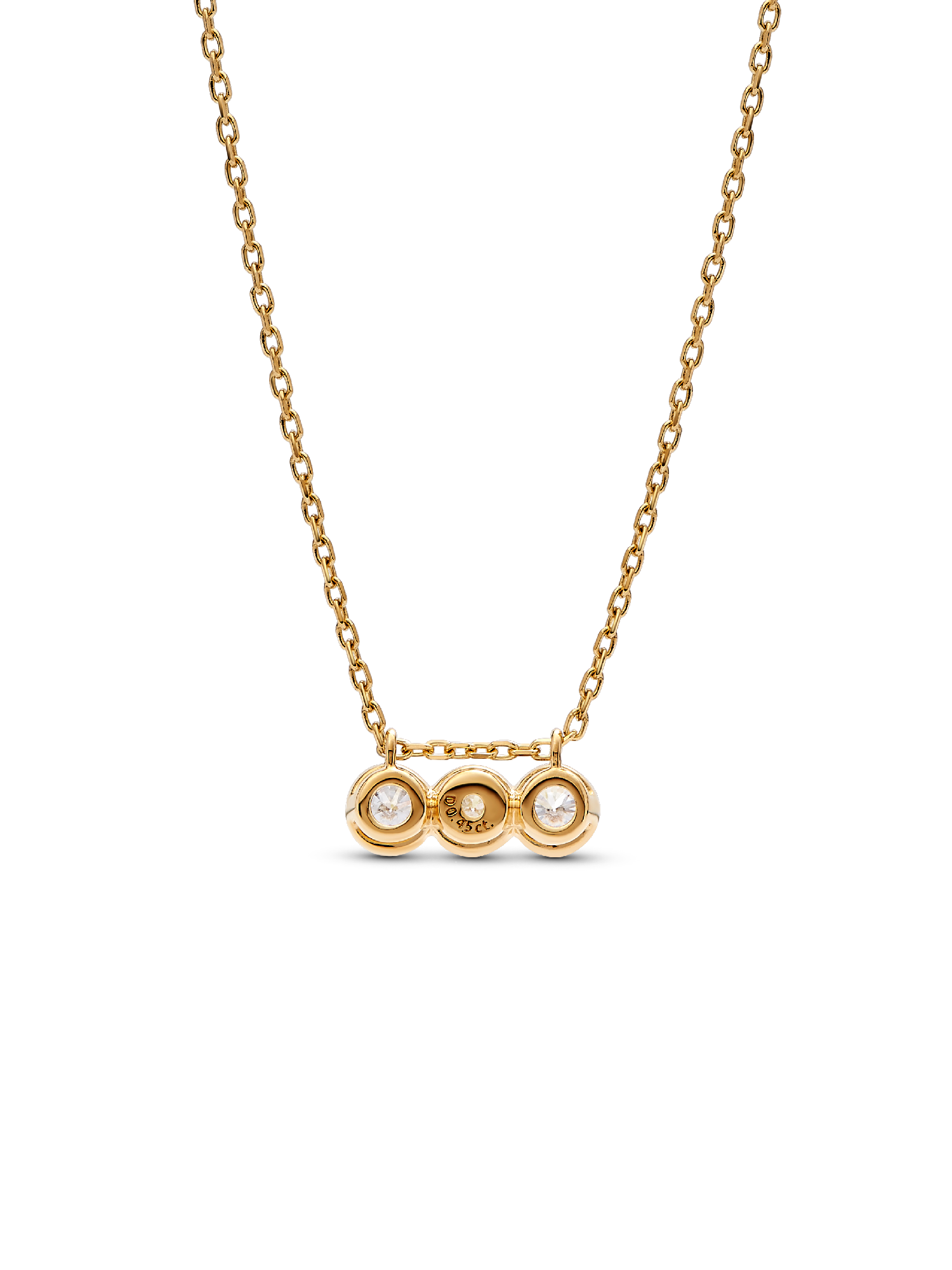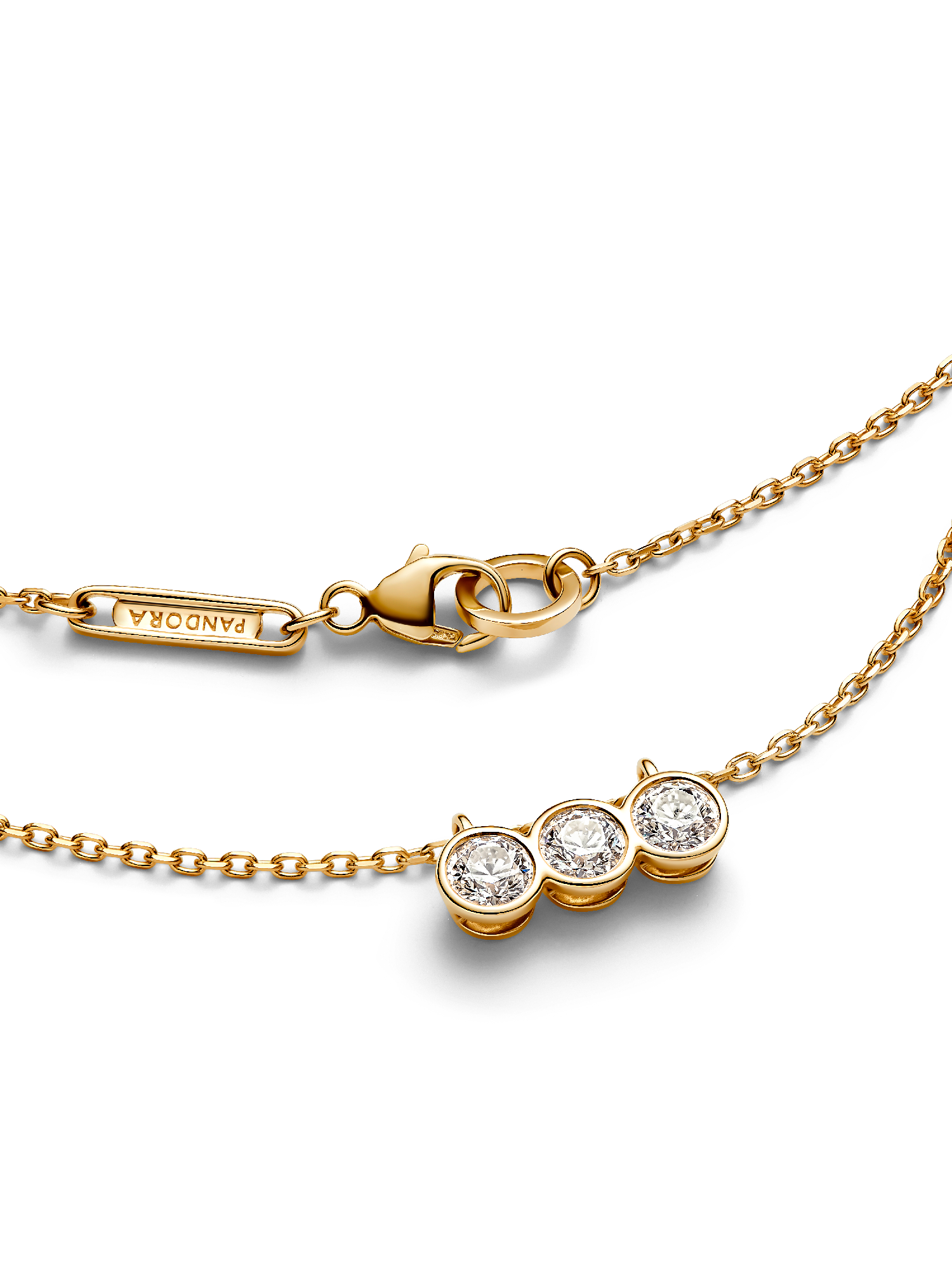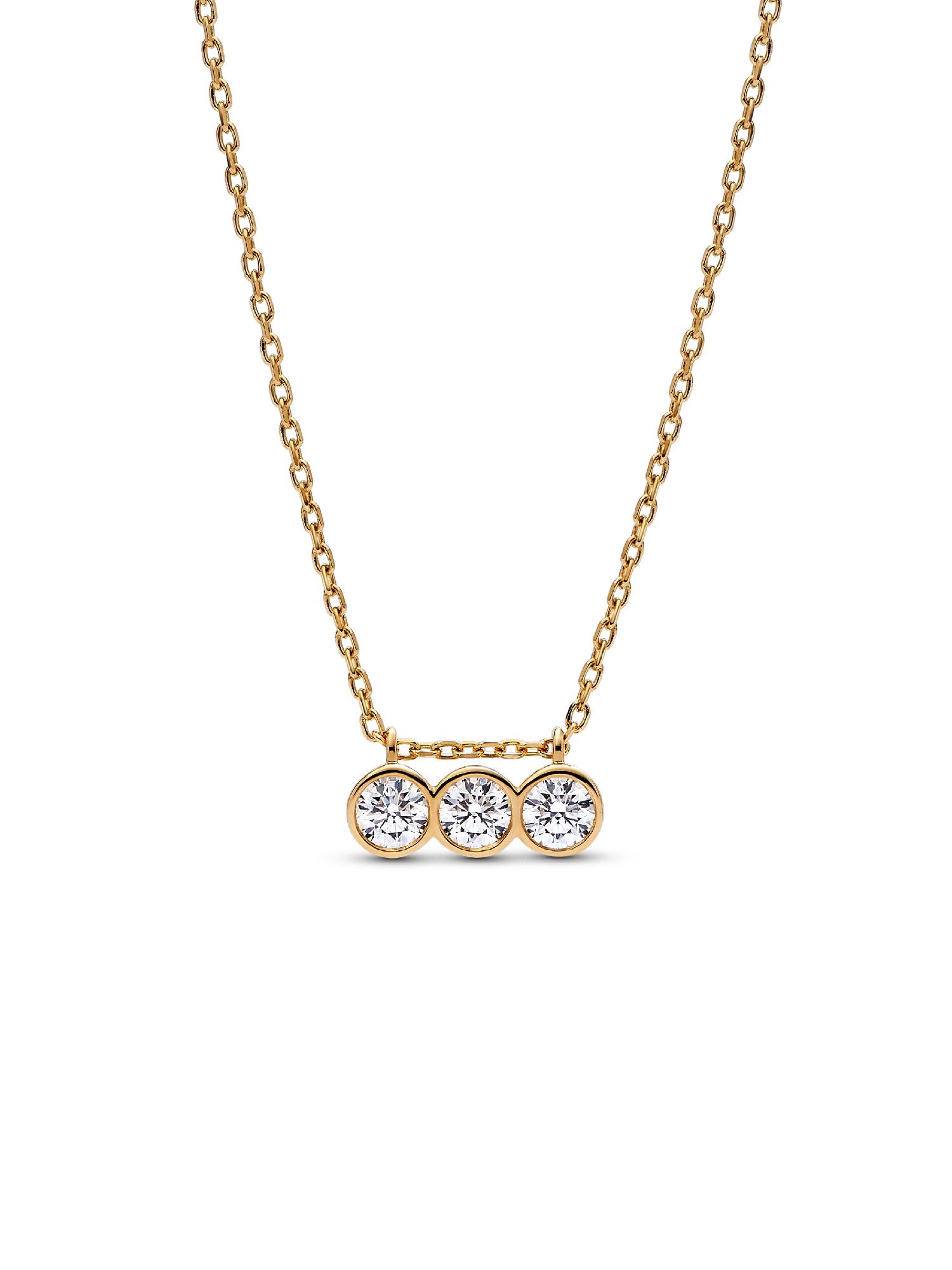 Meet your new essential lab-grown diamond necklace. The Pandora Era Bezel 14k Gold Triple Lab-grown Diamond Pendant Necklace features a row of three 0.15 carat lab-grown diamonds in a triple bezel setting, with a total carat weight of 0.45. The three stone settings are connected to form a single pendant that slides freely along the chain. Cut-outs on the back and sides of the bezel settings let in the light for ultimate sparkle. The 14k gold necklace is made with a diamond-cut cable chain with faceted links that reflect the light, lending it a subtle shimmer. Adjustable to two lengths, it's the perfect elevated staple with a classic yet contemporary aesthetic. Each Pandora Lab-grown diamond is treated with a post-growth color enhancement called annealing.