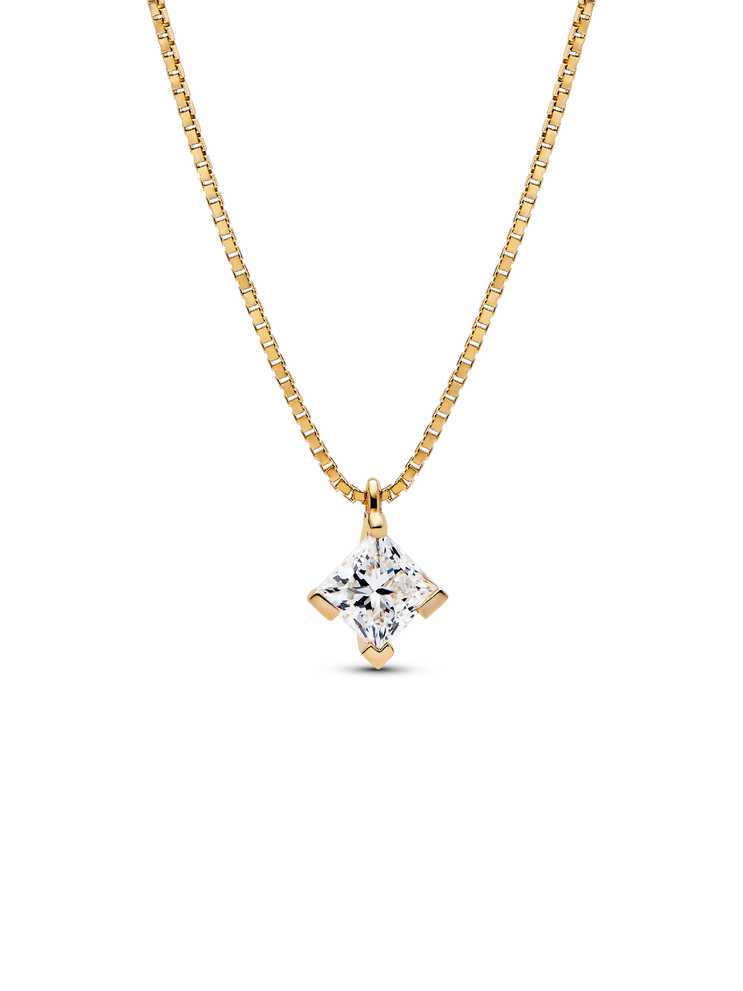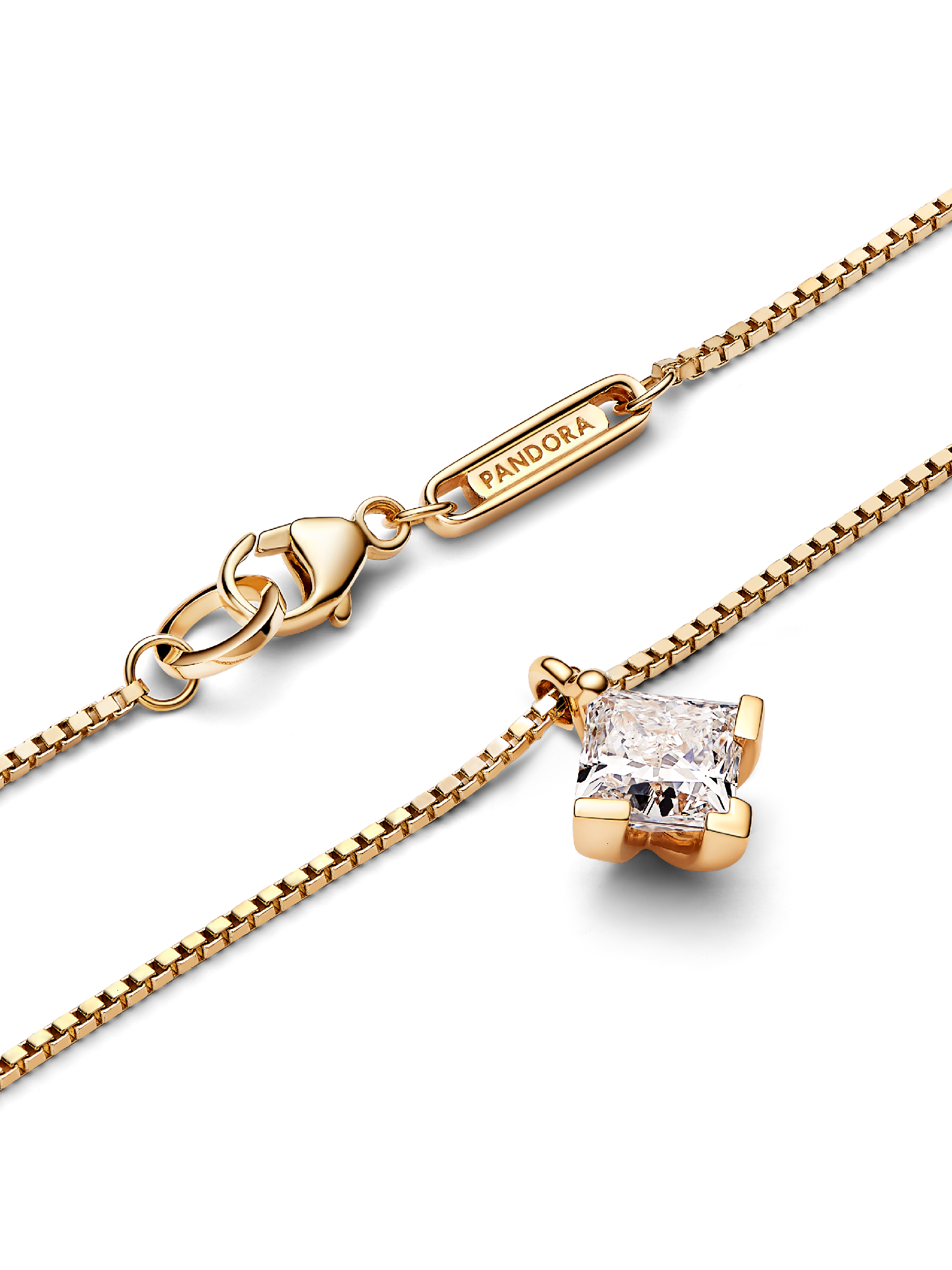 Shine in the Pandora Nova 14k Gold Lab-grown Diamond Pendant Necklace. Inspired by the illusion of capturing and holding a precious fragment of light, this luminous lab-grown diamond necklace features a 1.00 carat square princess excellent cut lab-grown diamond set in 14k gold. An asymmetrical prong setting frames the stone and is attached to the chain with a hidden jump ring, making the pendant appear to float on the neckline. The 14k gold necklace chain is adjustable to two lengths. Wear it as a symbol of the unique light within all of us. Each Pandora Lab-grown diamond is treated with a post-growth color enhancement called annealing.