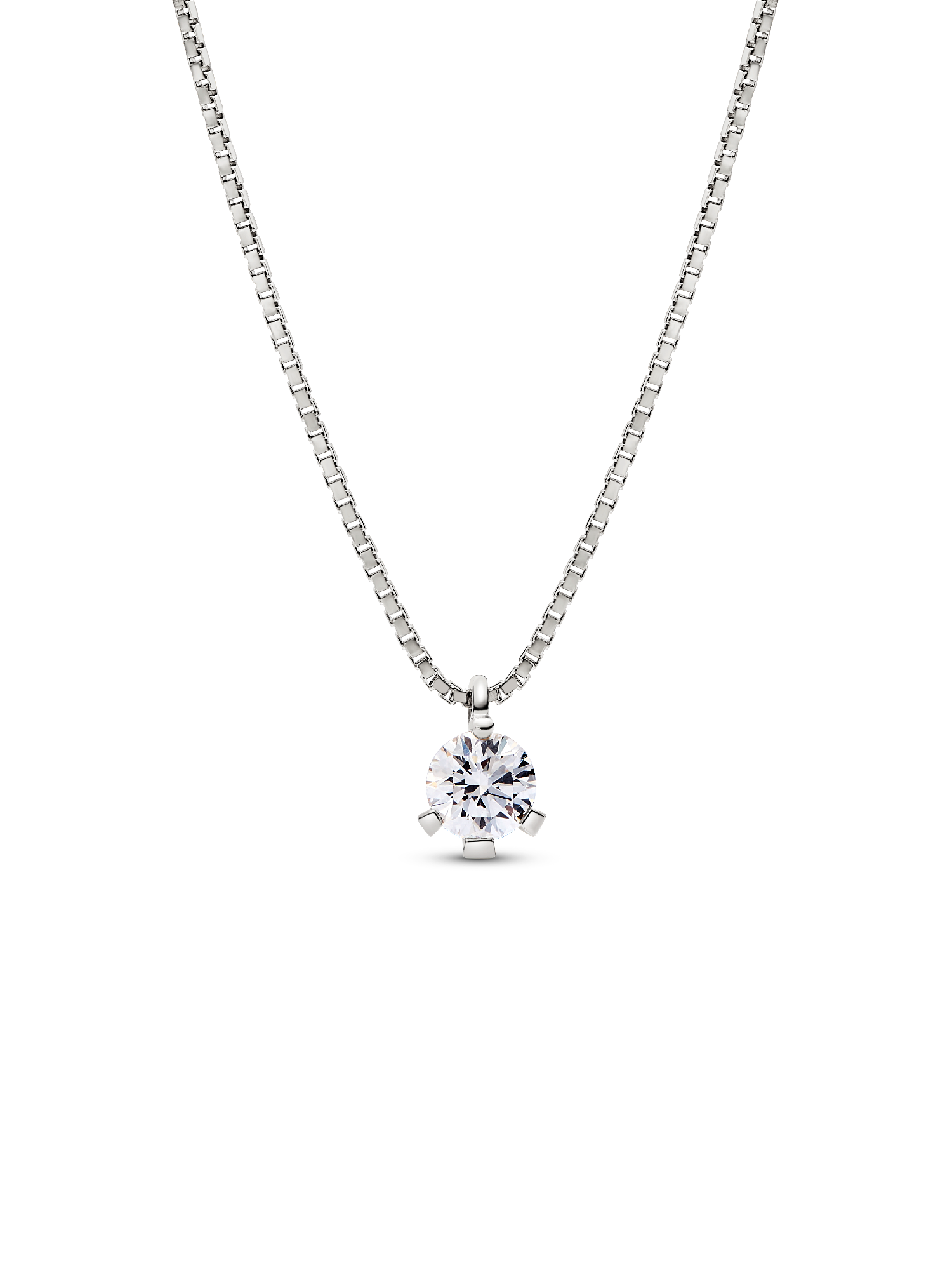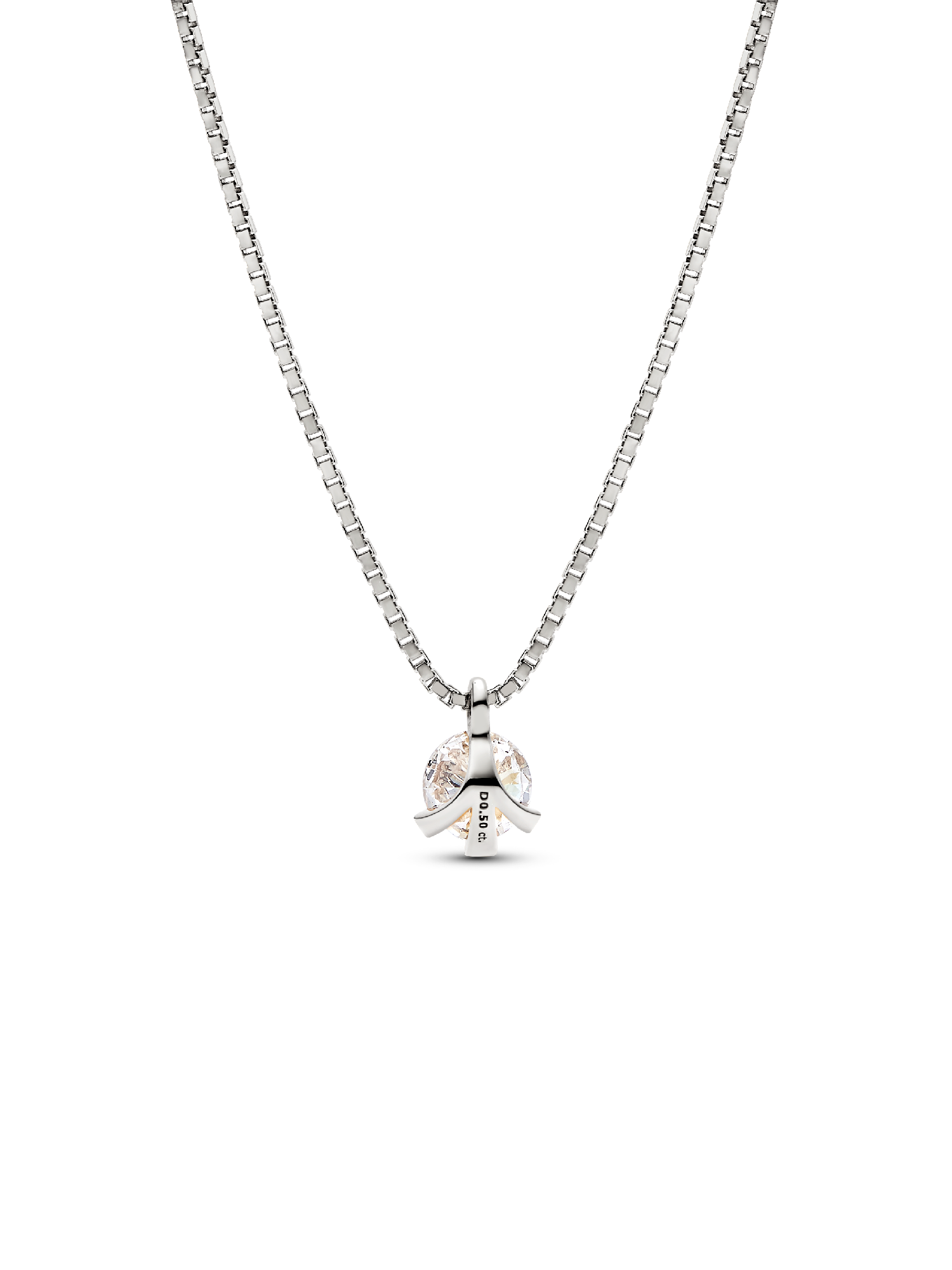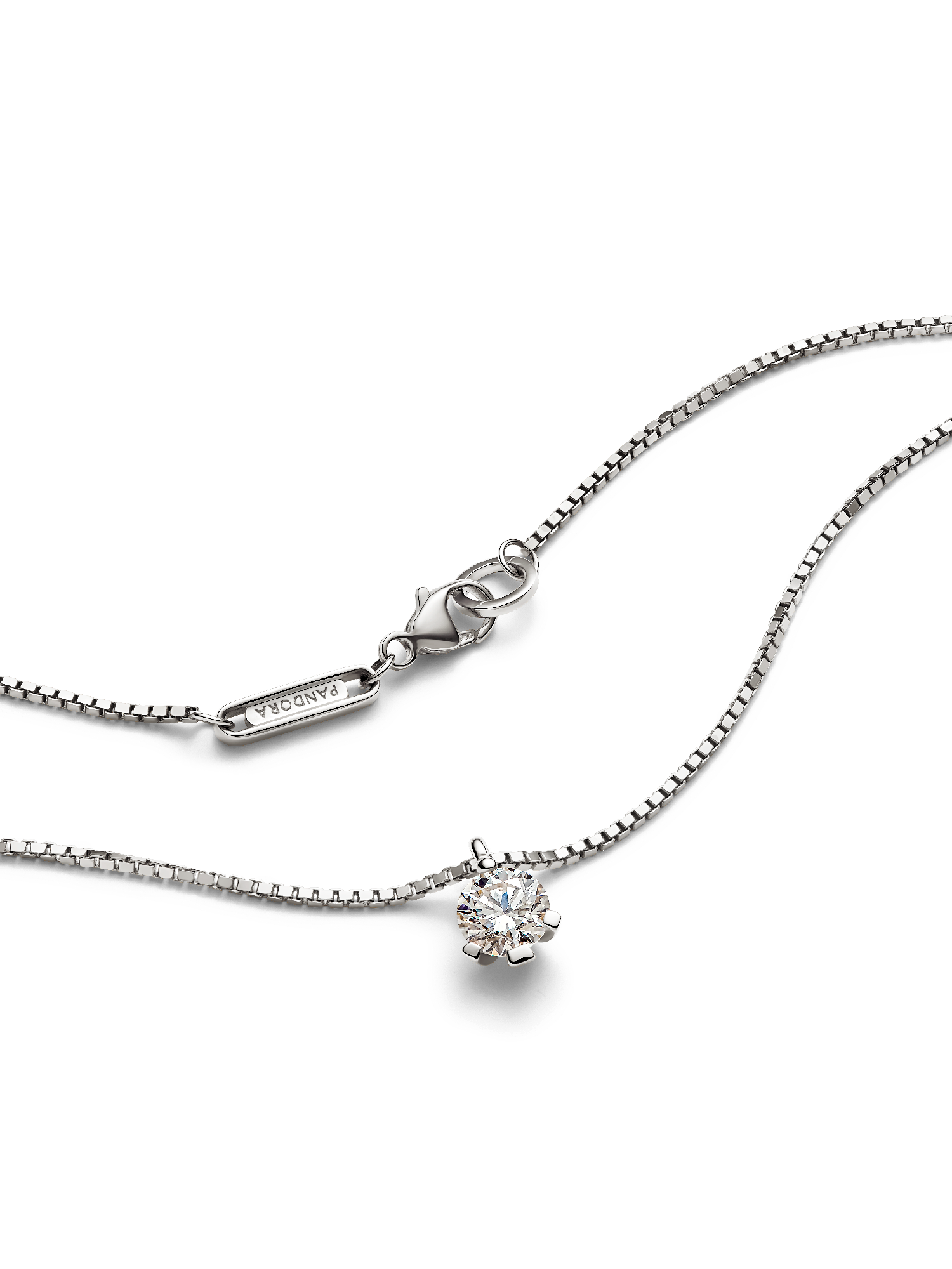 Shine in the Pandora Nova 14k White Gold Lab-grown Diamond Pendant Necklace. Inspired by the illusion of capturing and holding a precious fragment of light, this luminous lab-grown diamond necklace features a 0.50 carat round brilliant excellent cut lab-grown diamond set in 14k white gold. An asymmetrical prong setting frames the stone and is attached to the chain with a hidden jump ring, making the pendant appear to float on the neckline. The 14k white gold necklace chain is adjustable to two lengths. Wear it as a symbol of the unique light within all of us. Each Pandora Lab-grown diamond is treated with a post-growth color enhancement called annealing.