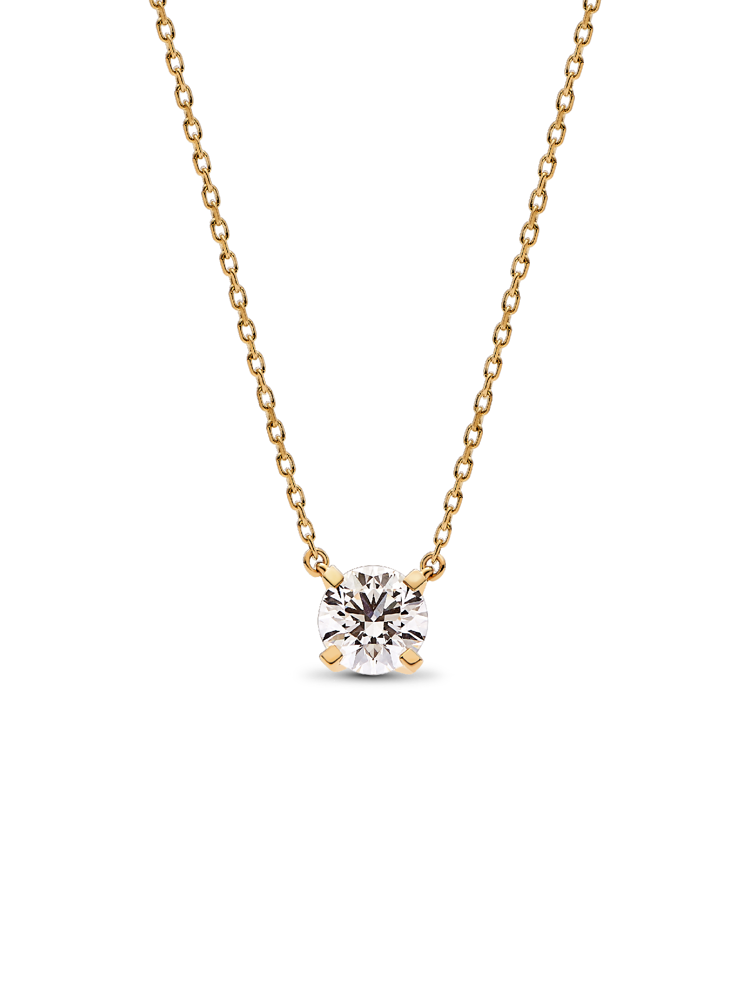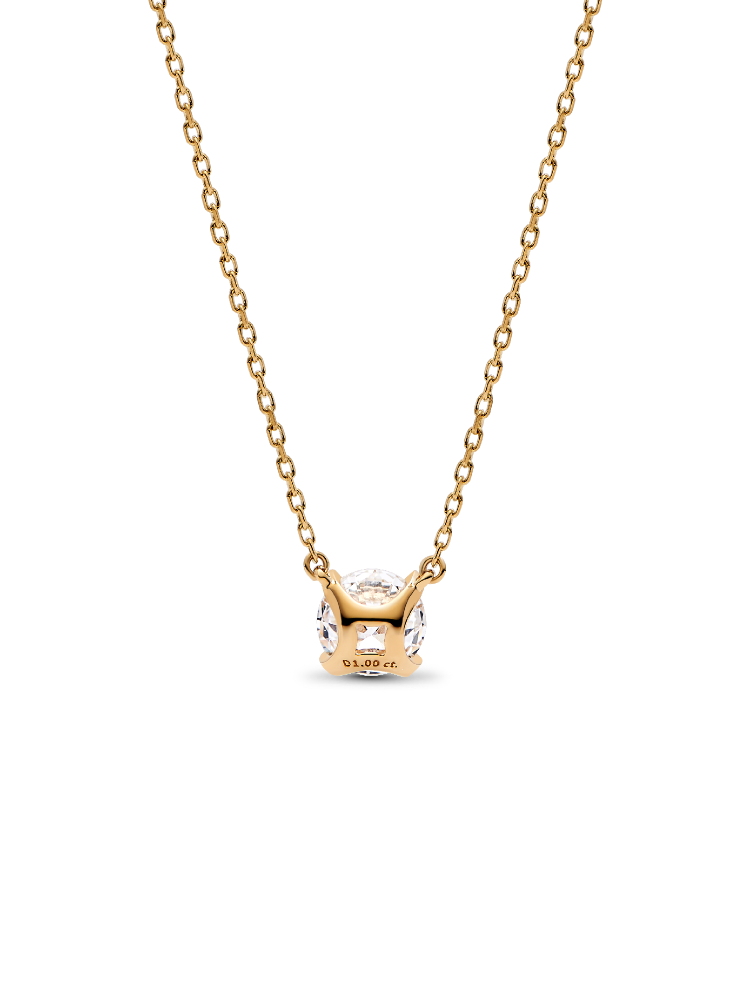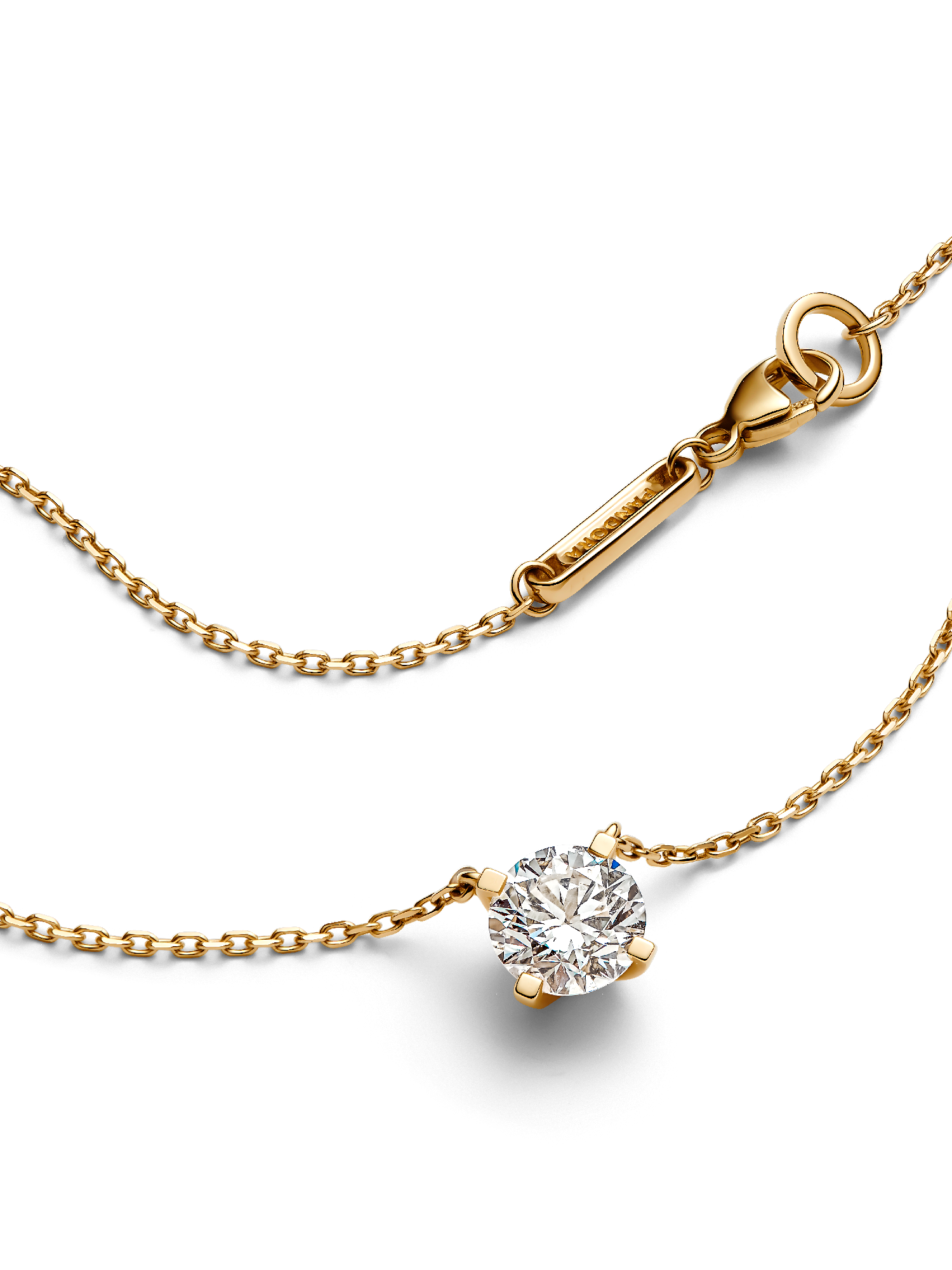A fresh twist on a classic. The Pandora Era 14k Gold Lab-grown Diamond Pendant Necklace showcases a 1.00 carat round brilliant excellent cut lab-created diamond in a four-prong setting that combines round and flat profiles, creating a modern aesthetic and opening the stone to the light for amplified sparkle. The 14k gold pendant is fixed to a matching diamond-cut cable chain, adjustable to two lengths. This lab-grown diamond necklace is a universally wearable piece that will elevate your looks day and night for years to come. Each Pandora Lab-grown diamond is treated with a post-growth color enhancement called annealing.