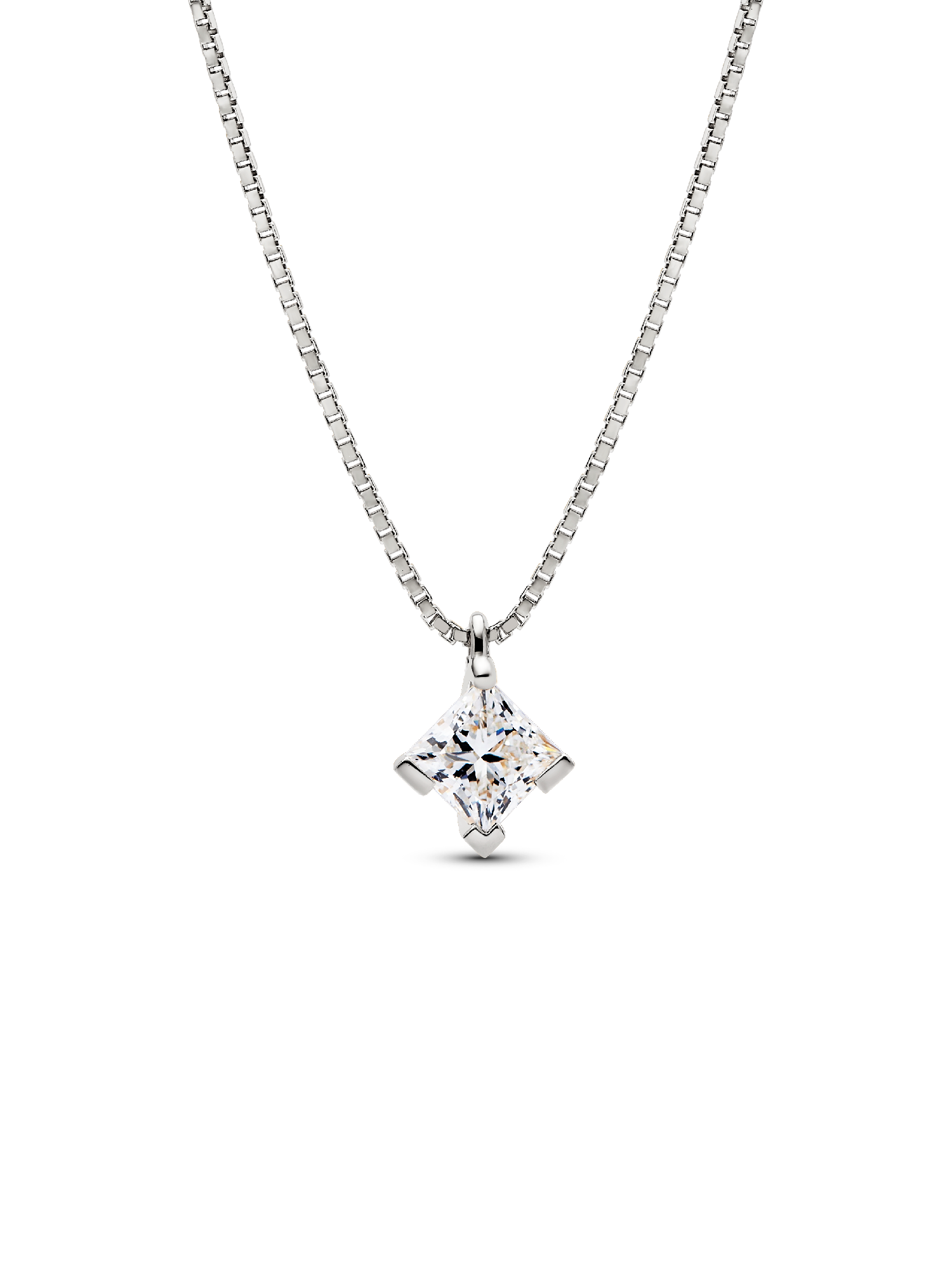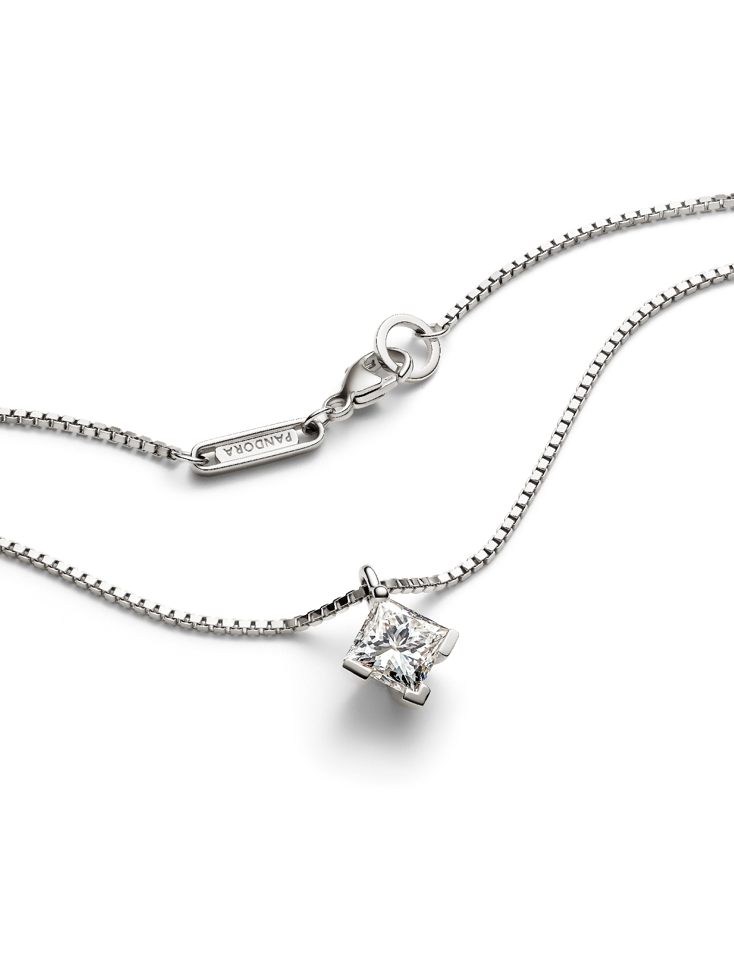 Shine in the Pandora Nova 14k White Gold Lab-grown Diamond Pendant Necklace. Inspired by the illusion of capturing and holding a precious fragment of light, this luminous lab-grown diamond necklace features a 1.00 carat square princess excellent cut lab-grown diamond set in 14k white gold. An asymmetrical prong setting frames the stone and is attached to the chain with a hidden jump ring, making the pendant appear to float on the neckline. The 14k white gold necklace chain is adjustable to two lengths. Wear it as a symbol of the unique light within all of us. Each Pandora Lab-grown diamond is treated with a post-growth color enhancement called annealing.