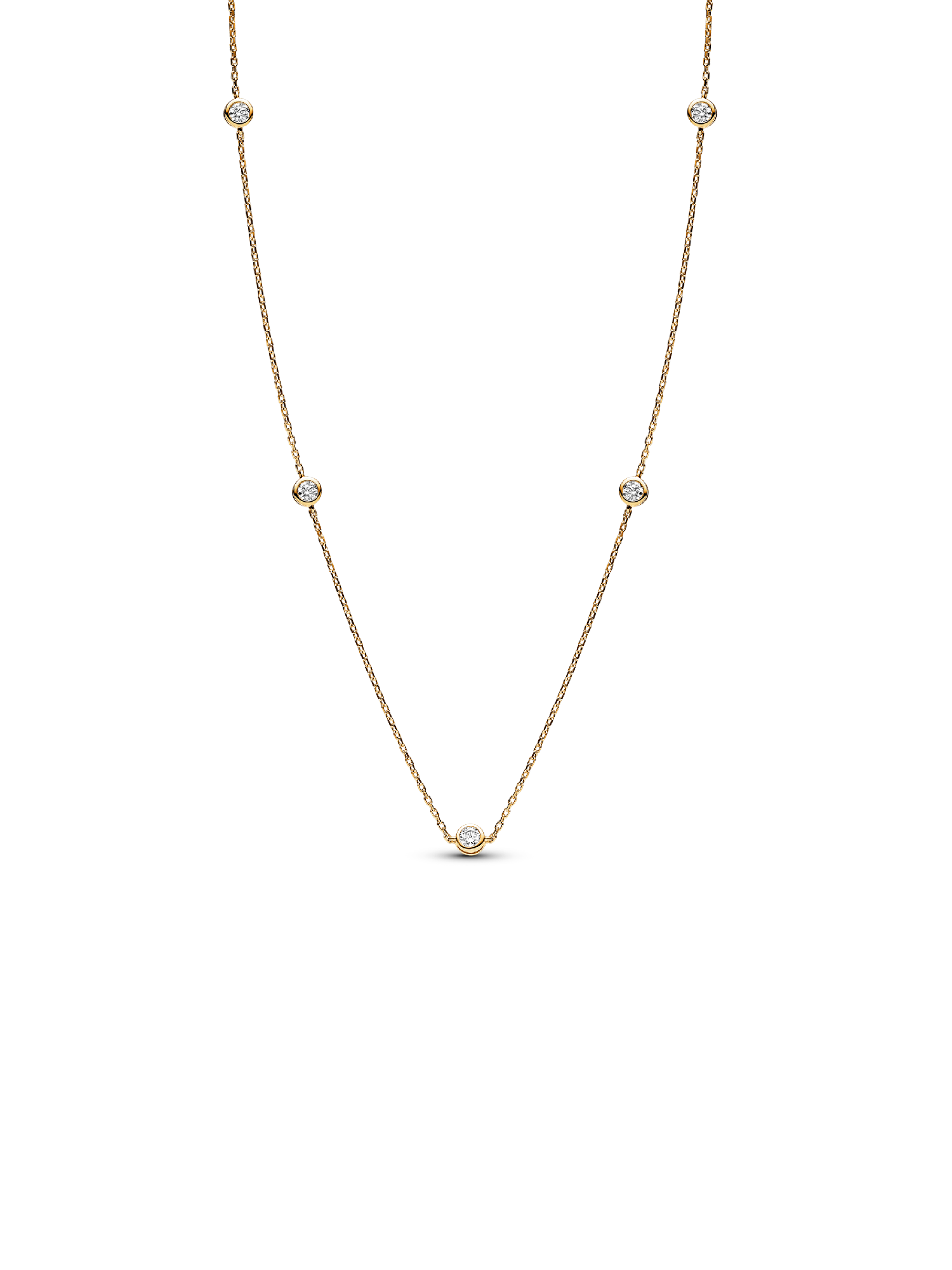 Meet your new essential lab-grown diamond necklace. The Pandora Era Bezel 14k Gold Lab-grown Diamond Station Necklace features five bezel-set 0.10 carat lab-grown diamonds, with a total carat weight of 0.50. Cut-outs on the back and sides of the bezel setting let in the light for ultimate sparkle. The lab-grown diamonds are fixed along a 14k gold diamond-cut cable chain with faceted links that reflect the light, lending the necklace a subtle shimmer. Adjustable to two lengths, it's the perfect elevated staple for your everyday looks.