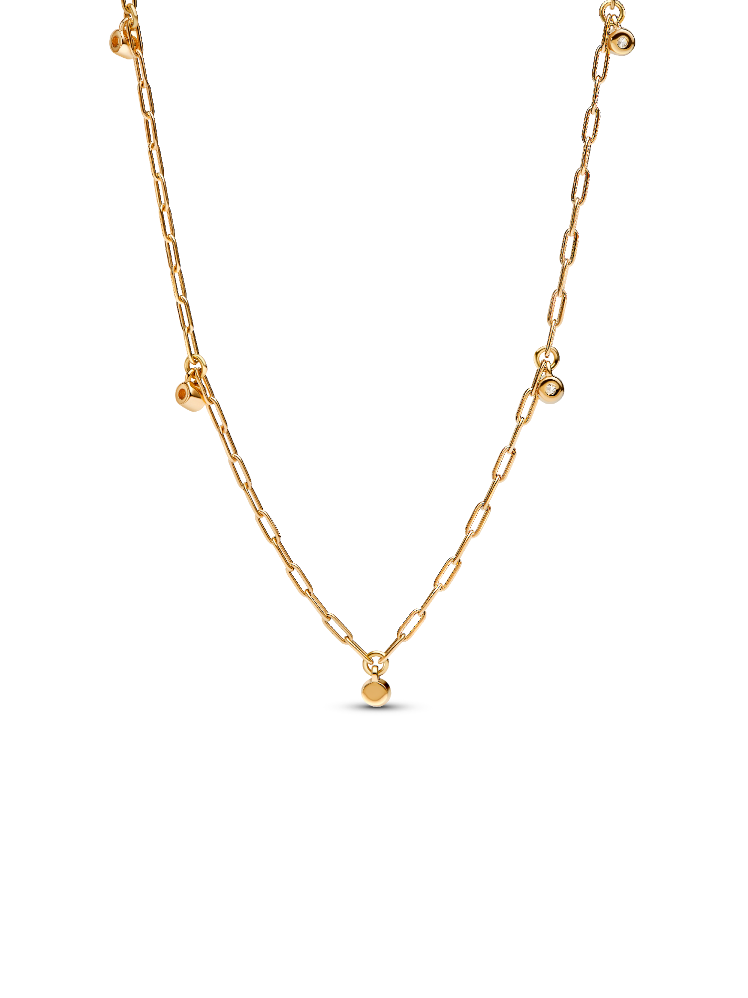 Elevate your everyday with sparkling lab-grown diamonds. Crafted in 14k gold, this necklace features five round brilliant, bezel-set lab-grown diamonds. The elegant paperclip chain adds a contemporary touch, making it perfect for layering or wearing alone. Adjust the length to suit your style. This piece embodies a refined, delicate aesthetic—perfect for any occasion.