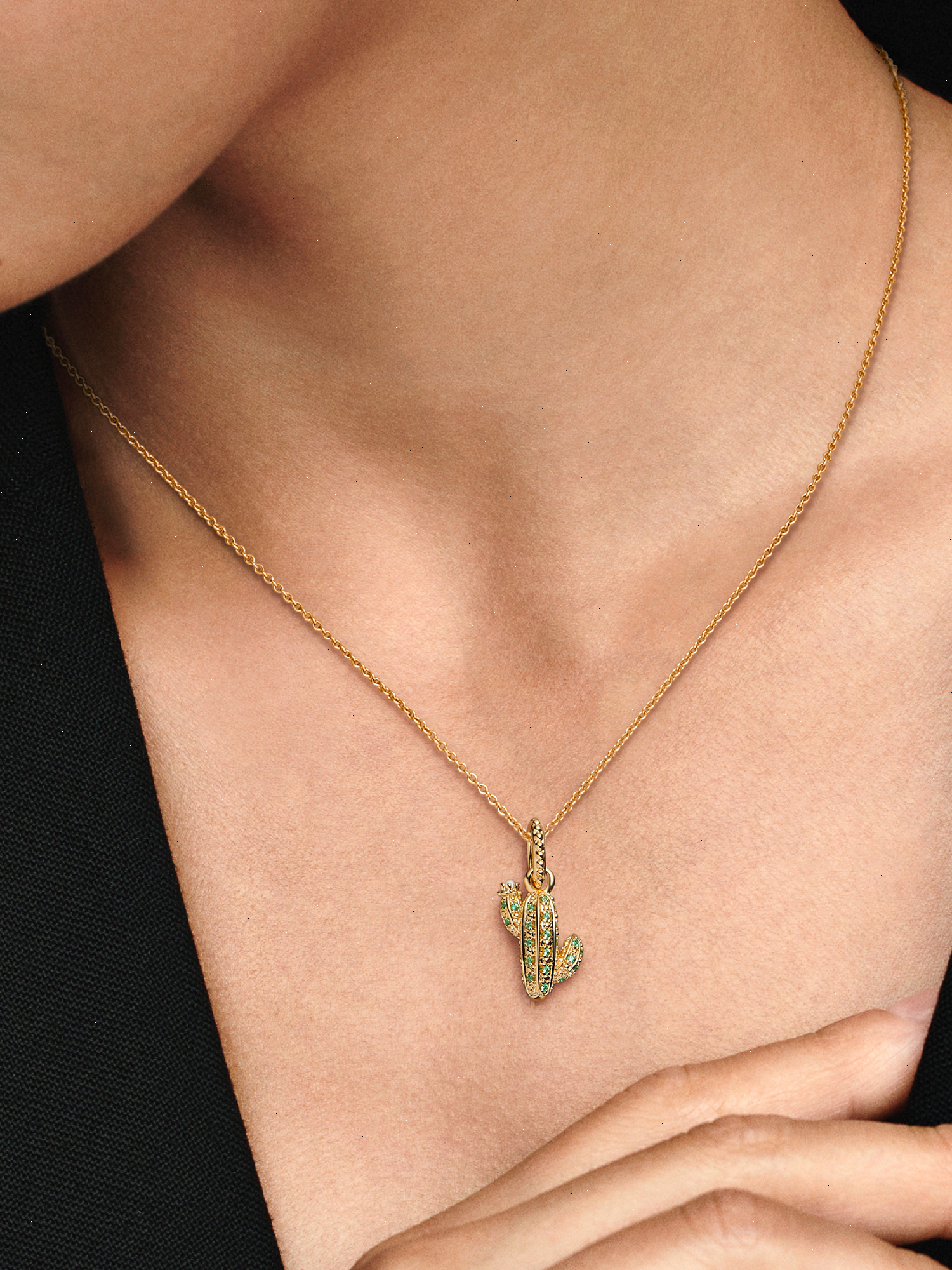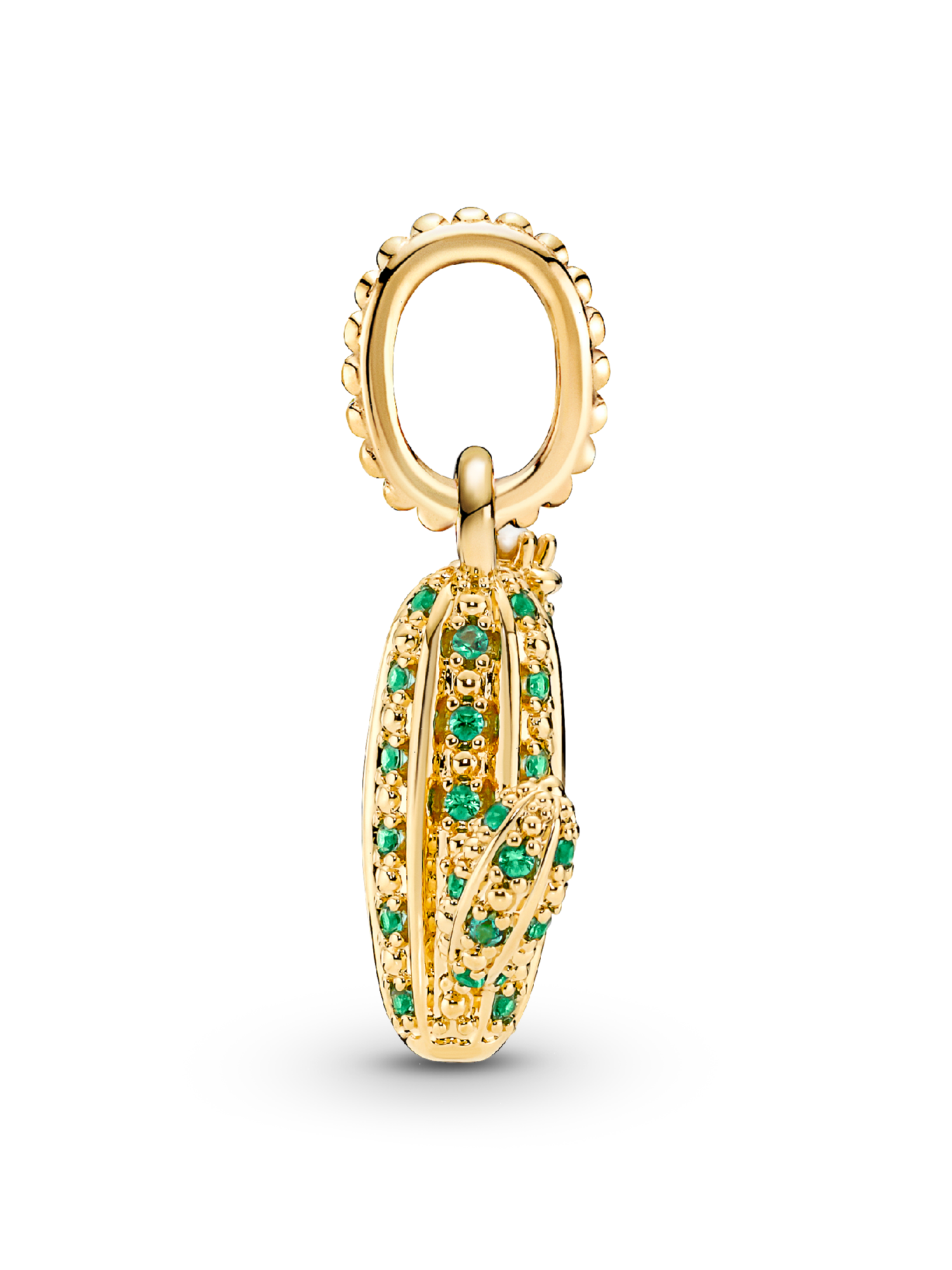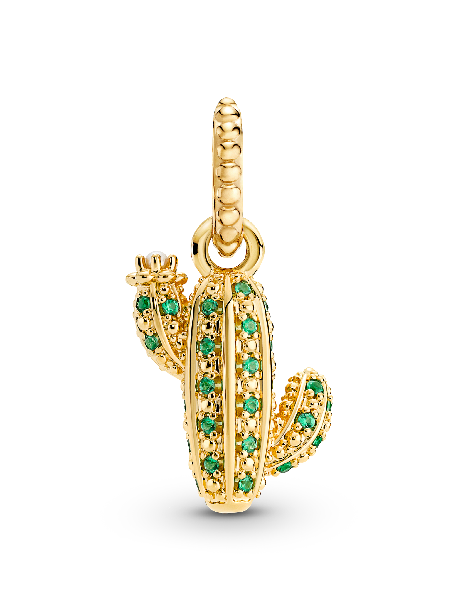 Soak up the sun with this vibrant cactus pendant. The cactus is a plant that thrives in the desert heat, symbolizing the resilience and beauty of nature, blooming with vitality. The 14k gold-plated pendant features rows of green man-made crystals and a lacquered artificial pearl as a flower blooming on one branch of the cactus. Style it on your Pandora bracelet, necklace or hoops and bask in a golden glow.