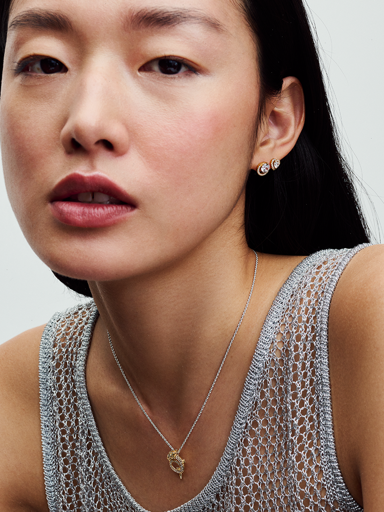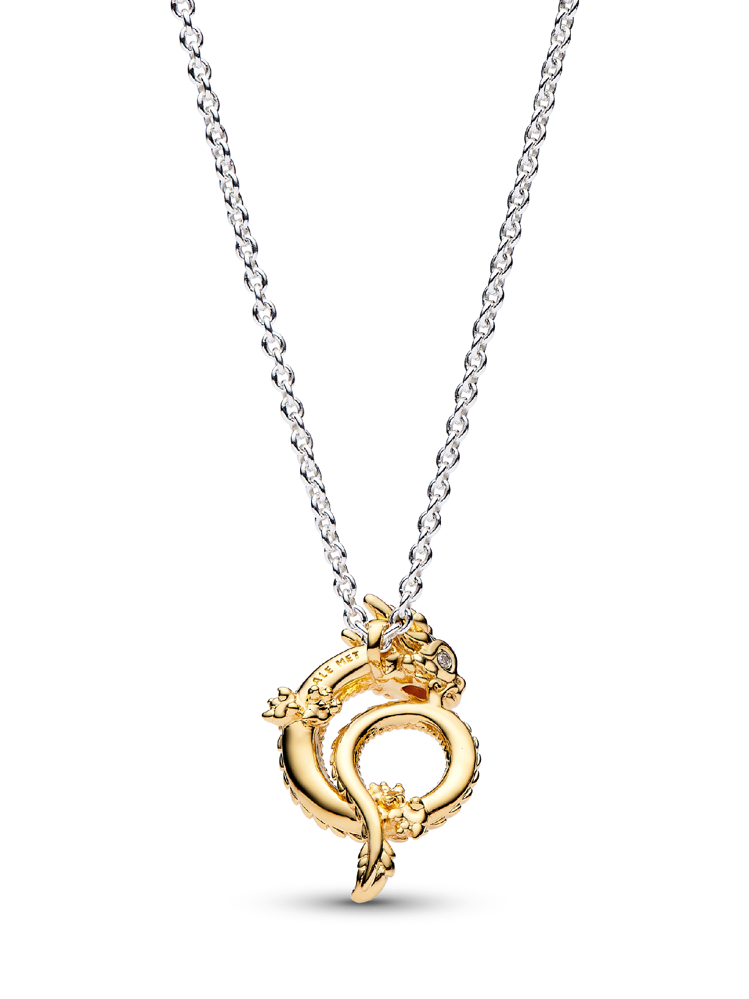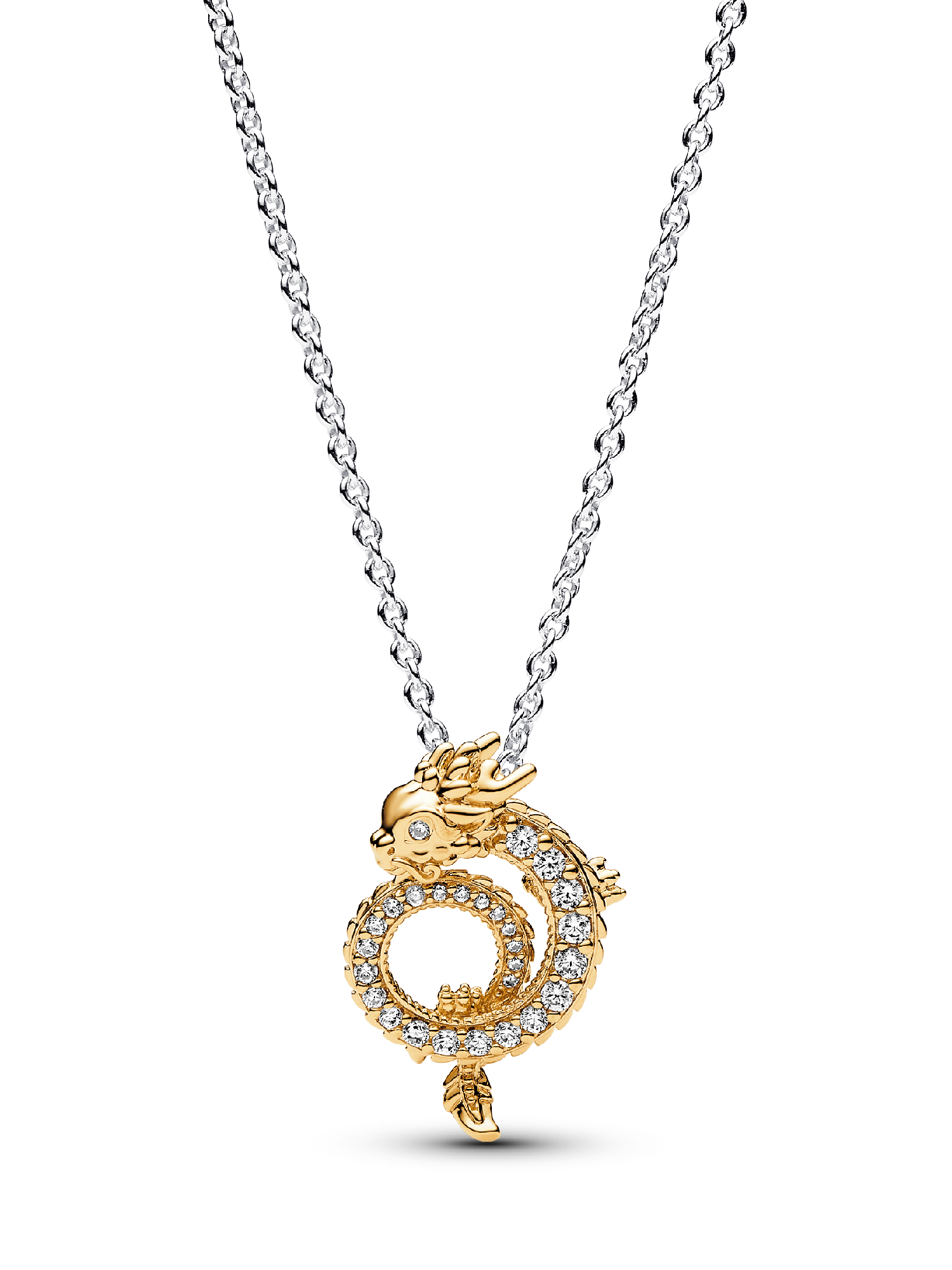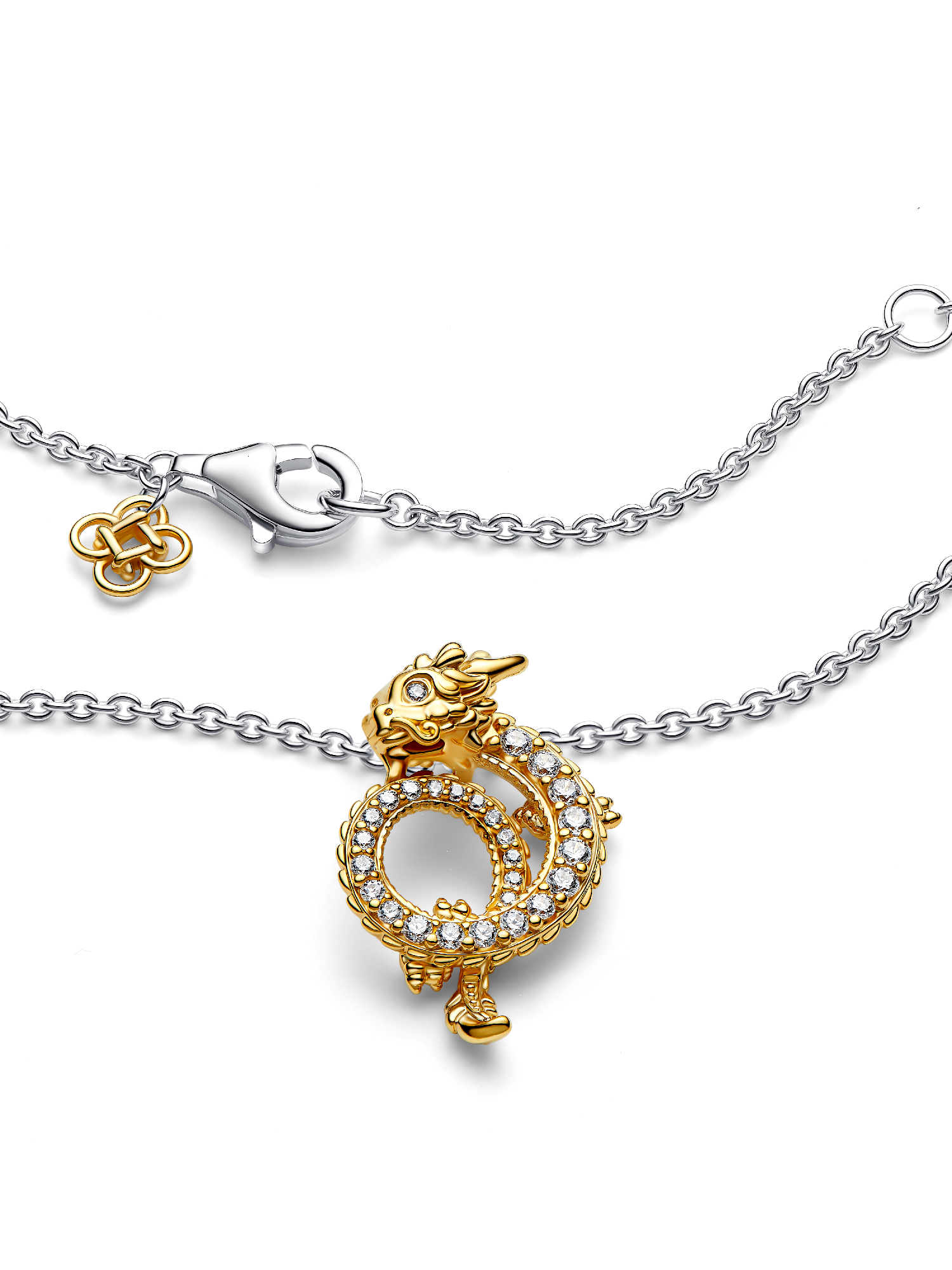 Invite good fortune in the coming year with the Two-tone Dragon Collier Necklace. 2024 is the Year of the Dragon - the 5th animal in the Chinese zodiac, this mythical creature represents good fortune, strength, power, wisdom and health. This sterling silver necklace features a curled dragon pendant in 14k gold plating with intricate details and a row of sparkling pavé along the dragon's body. The pendant is not detachable and slides freely along the sterling silver chain, which is adjustable in length. A 14k gold-plated peace knot dangles near the clasp. Wear this necklace to invite the qualities of the dragon into your year ahead, or gift it to a loved one who was born in the Year of the Dragon.
