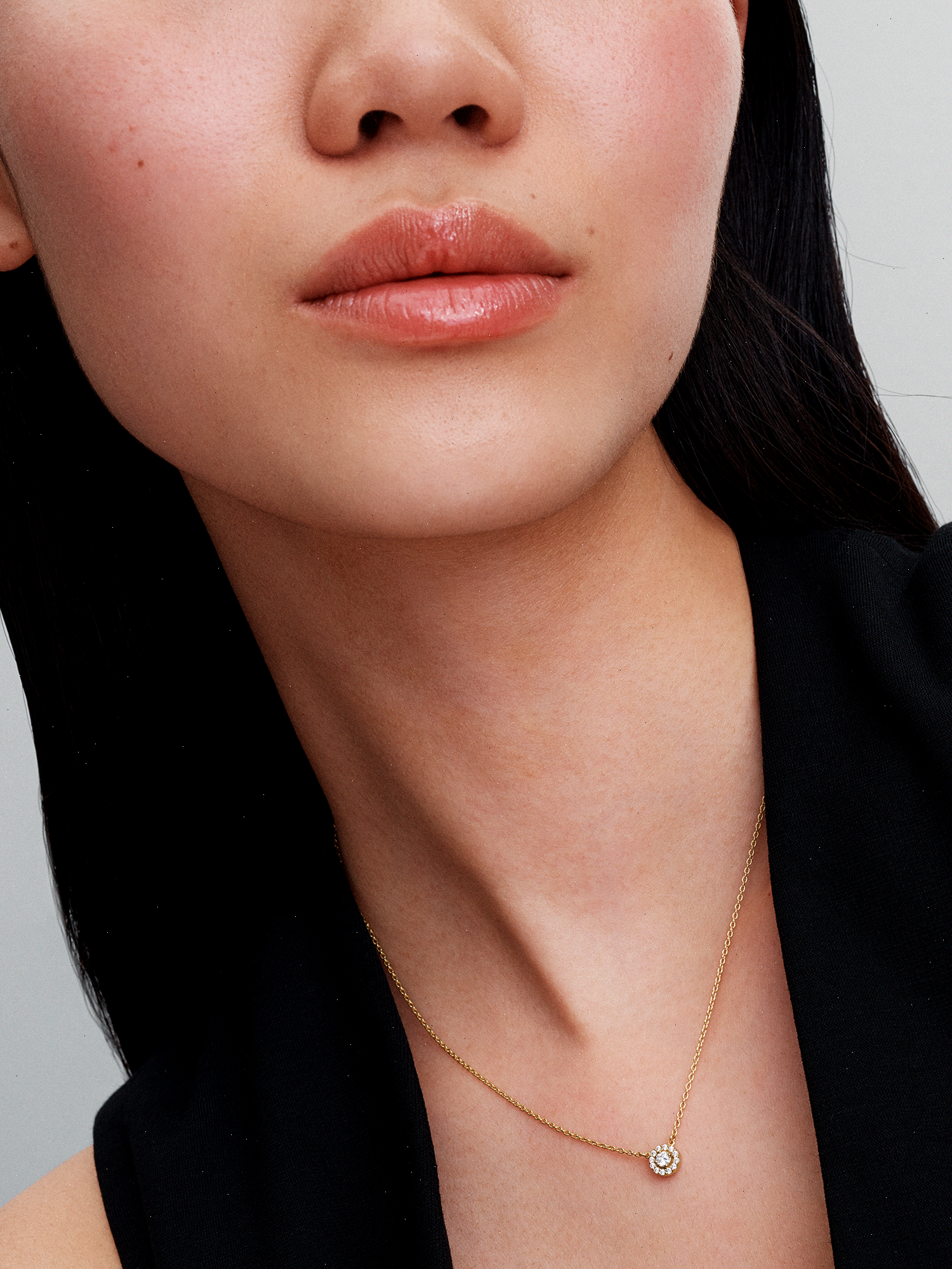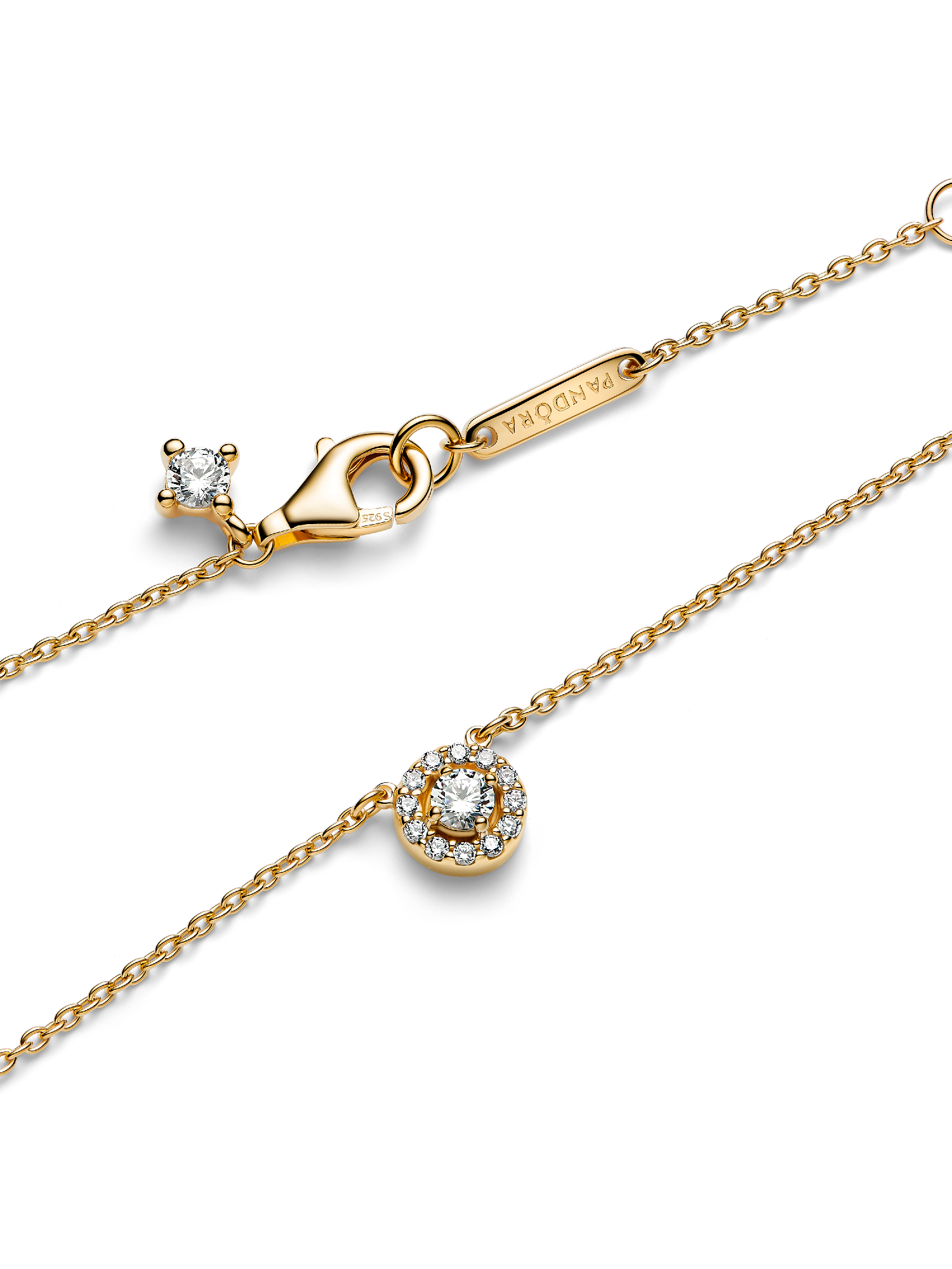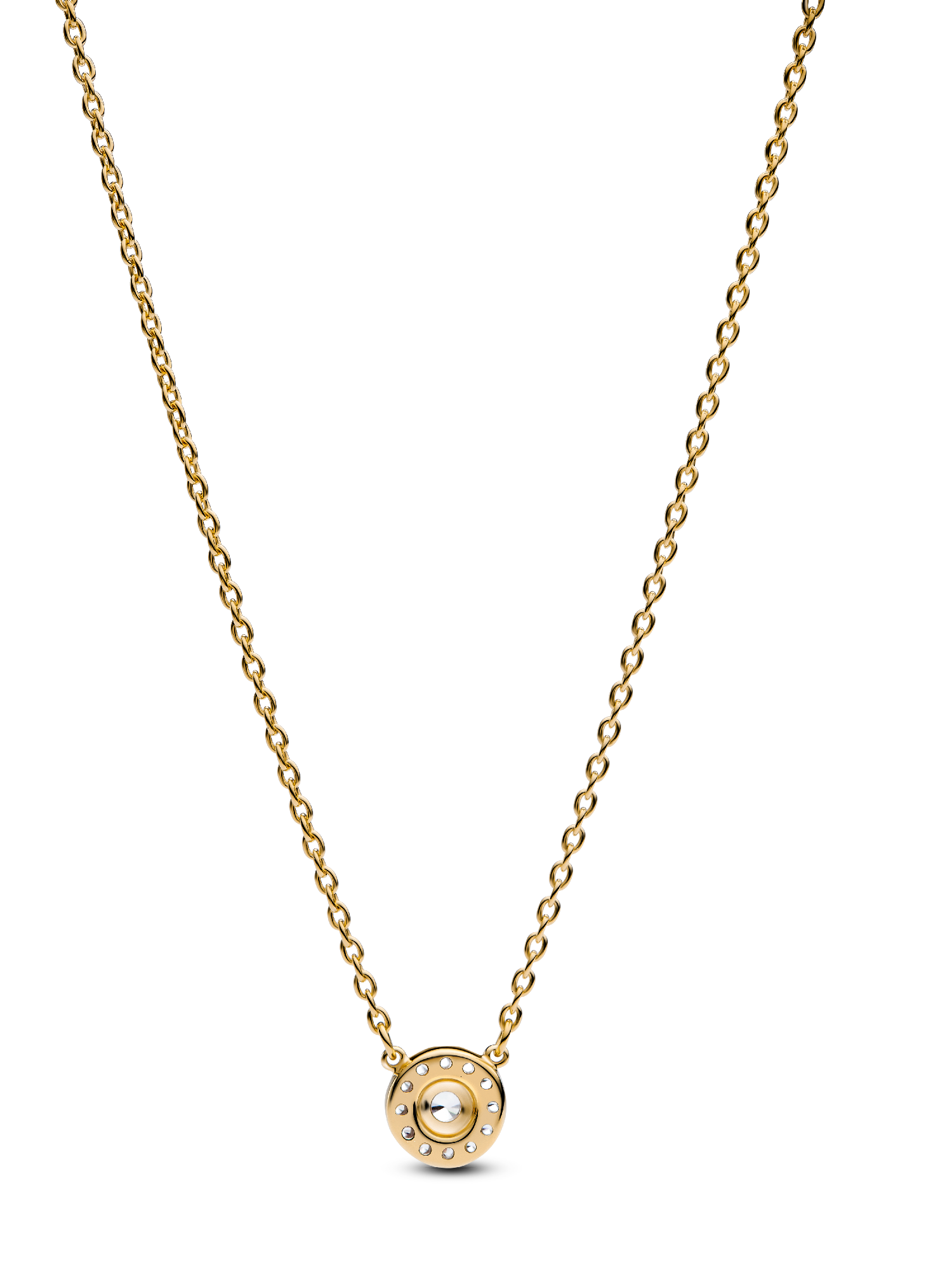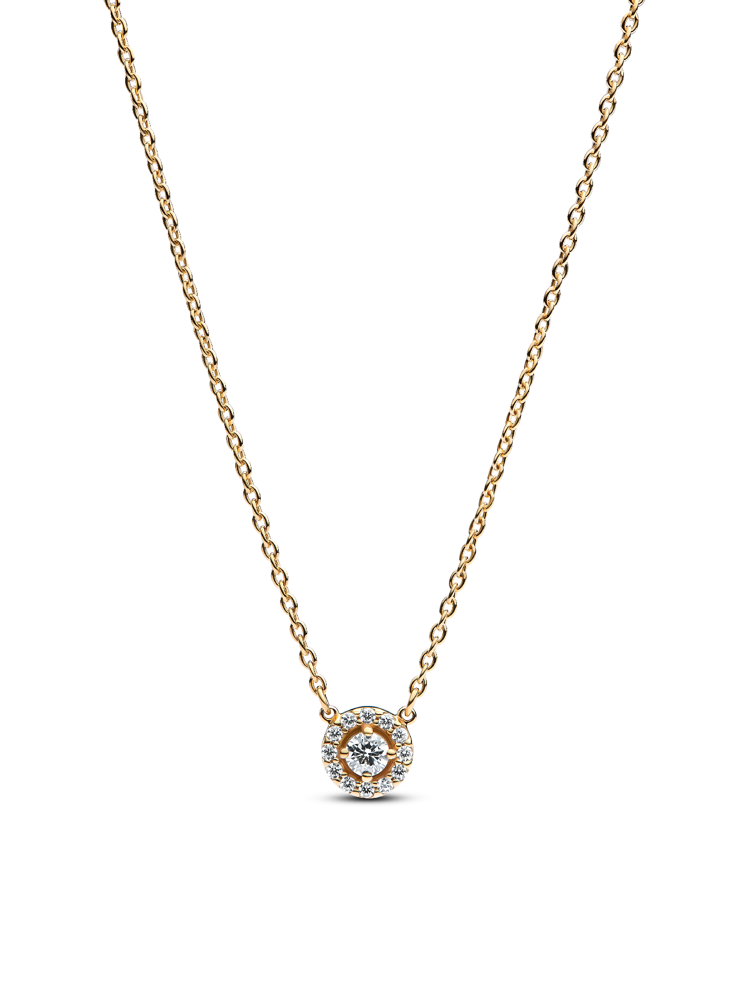 Classic meets contemporary in this Round Pavé Halo Pendant Necklace in 14k gold plating. The necklace features a fixed pendant, where a halo of pavé cubic zirconia surrounds a larger stone, raised for extra dimension. Designed to reflect maximum sparkle, light up your look with this shining pendant, or gift it to your special someone.