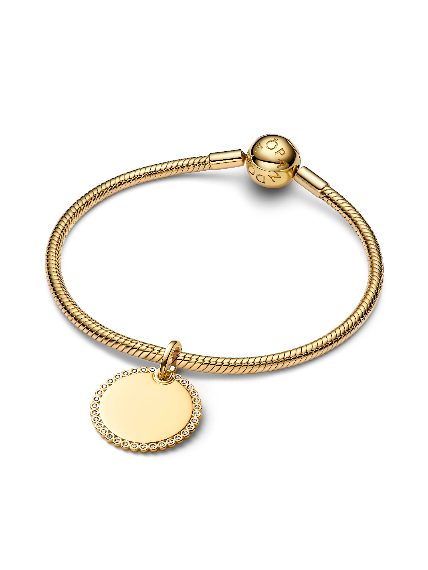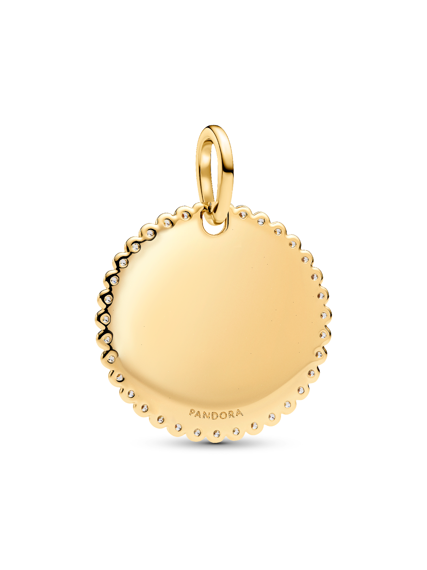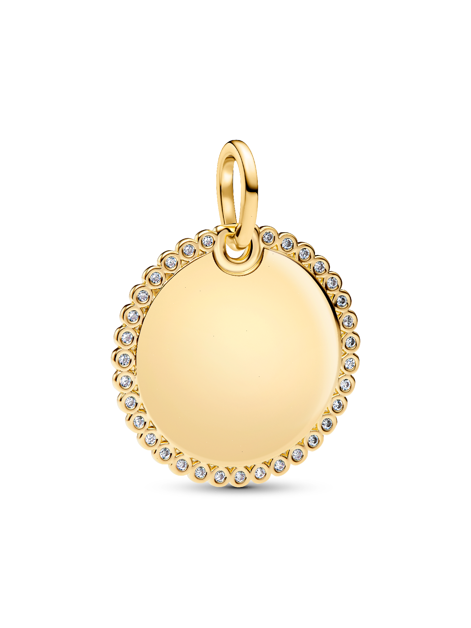 Minimalist style that makes a statement. Add our 14k gold-plated engravable disc pendant, encircled in a halo of sparkling stones, to your collection.