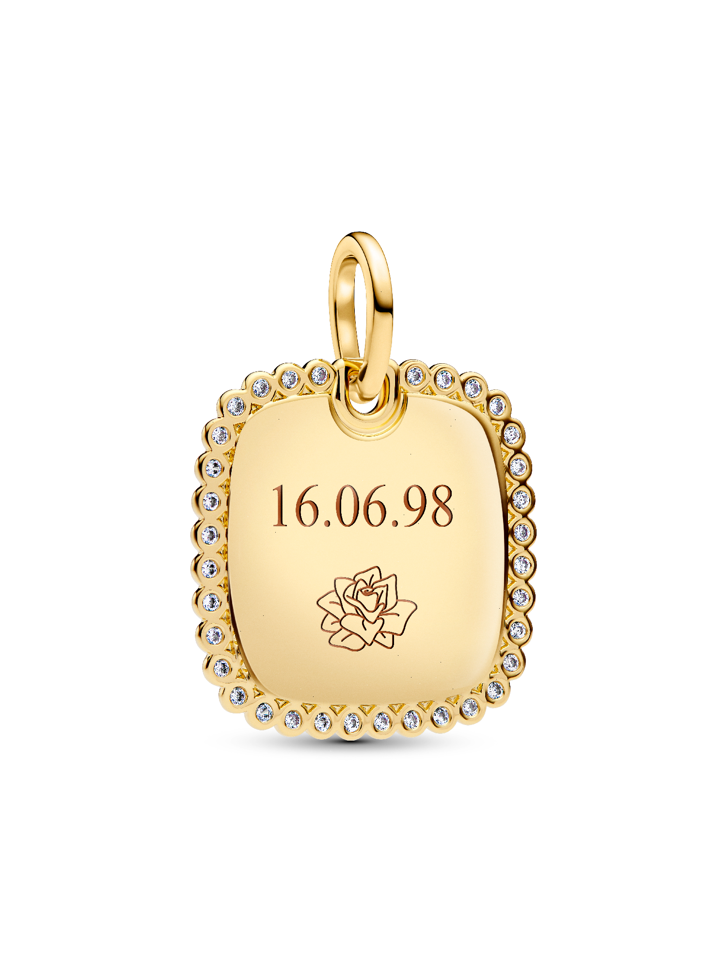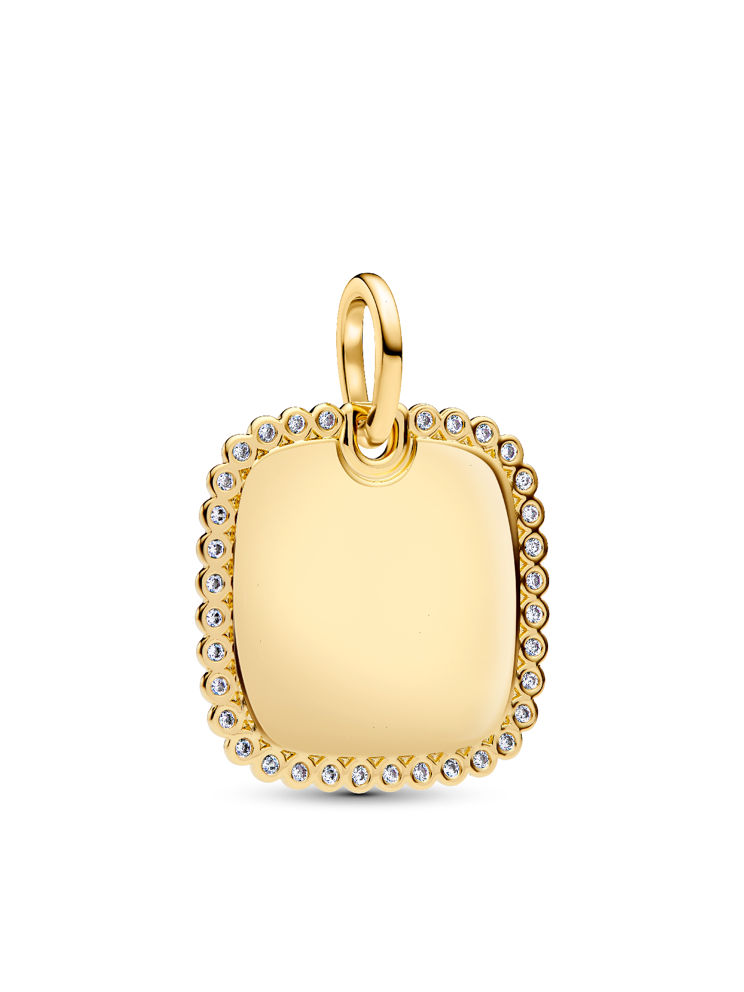 Minimalist style that makes a statement. Add our 14k gold-plated engravable square disc pendant, outlined in a frame of sparkling stones, to your collection.