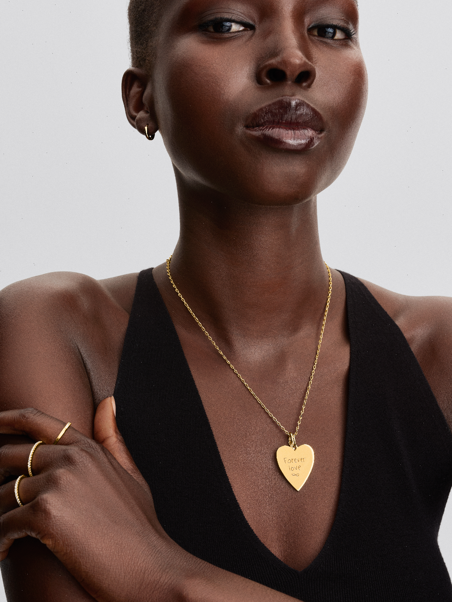 Wear the power of love and connection with our oversized heart pendant. Crafted in 14k gold plating, it features two polished sides ready to engrave with your meaningful message.