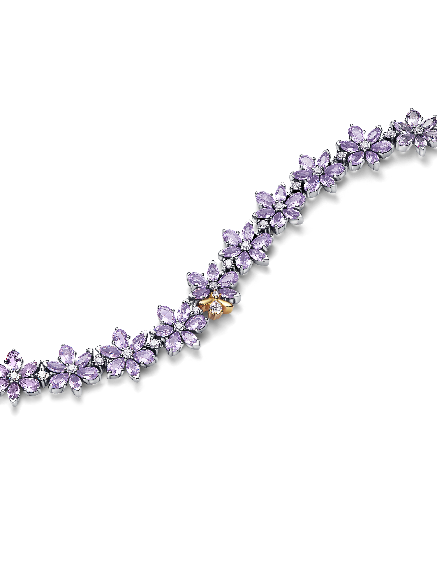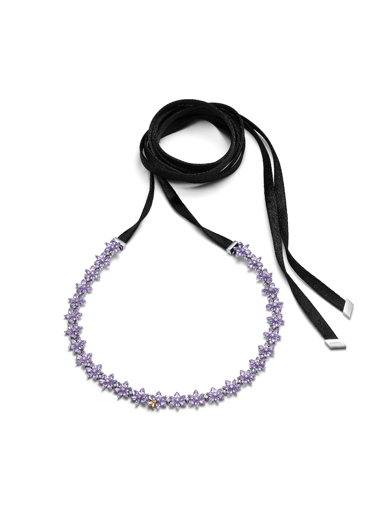 Step into your own garden of delights. Our Bridgerton-inspired choker pairs sterling silver and 14k gold plating with a row of purple herbarium-set crystals along a versatile black cord.
