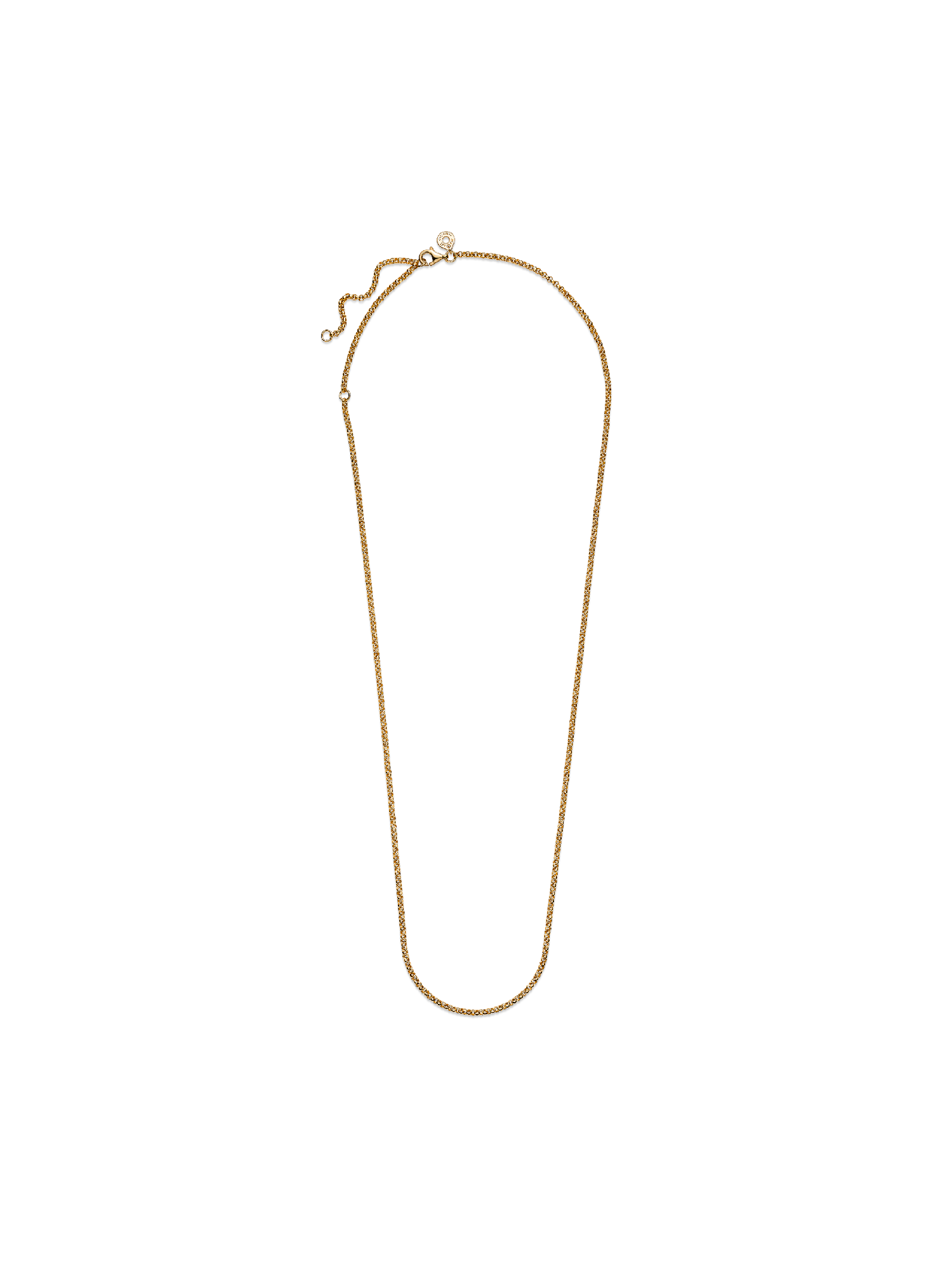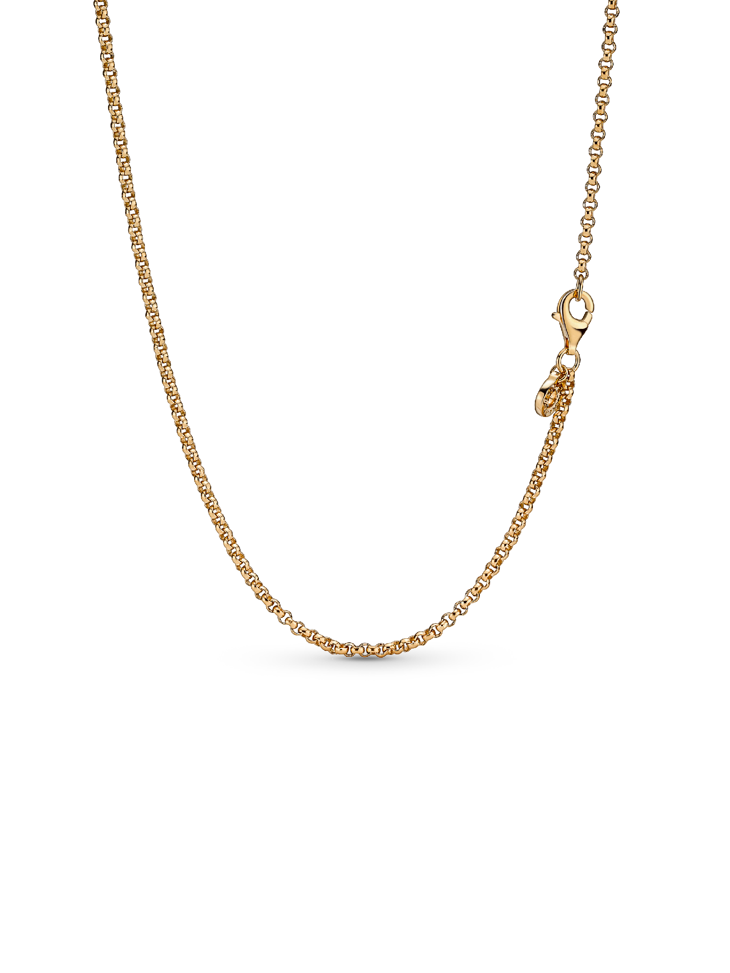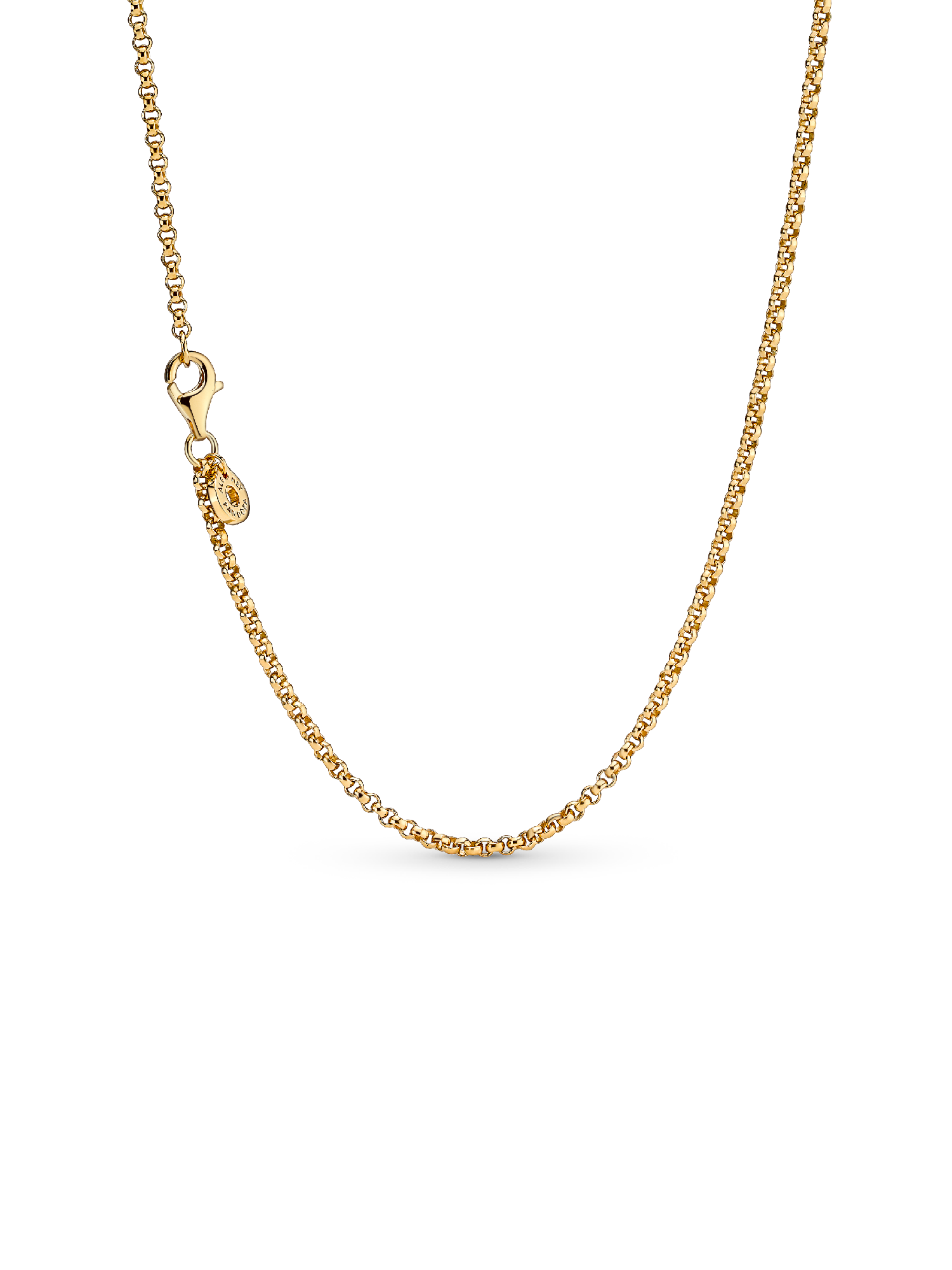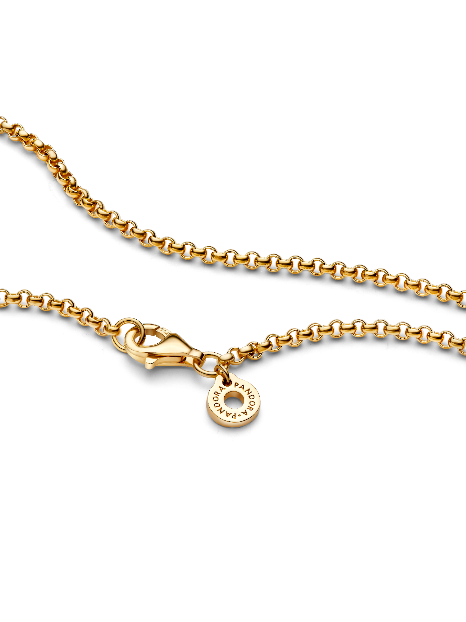 Discover a new way to wear your go-to charms with the Rolo Chain Necklace. Hand-finished and 14k gold-plated, this simple design is adjustable to three different lengths. This piece can only be worn with small and medium-sized Pandora O Pendants. Attach a pendant with a sparkling bail clasp to make a statement. Team with 14k gold-plated earrings decorated with stones for a uniform look with added shine.