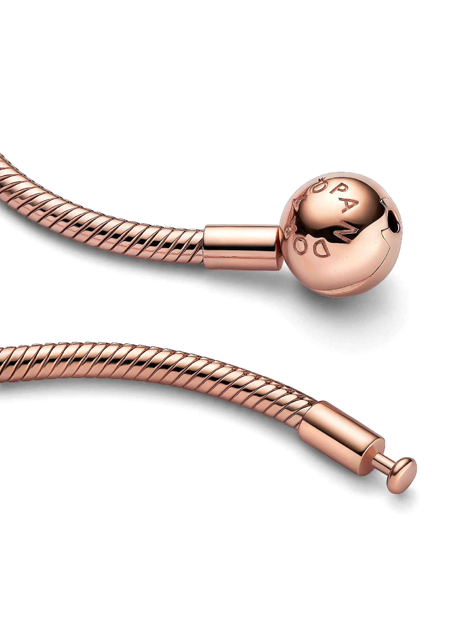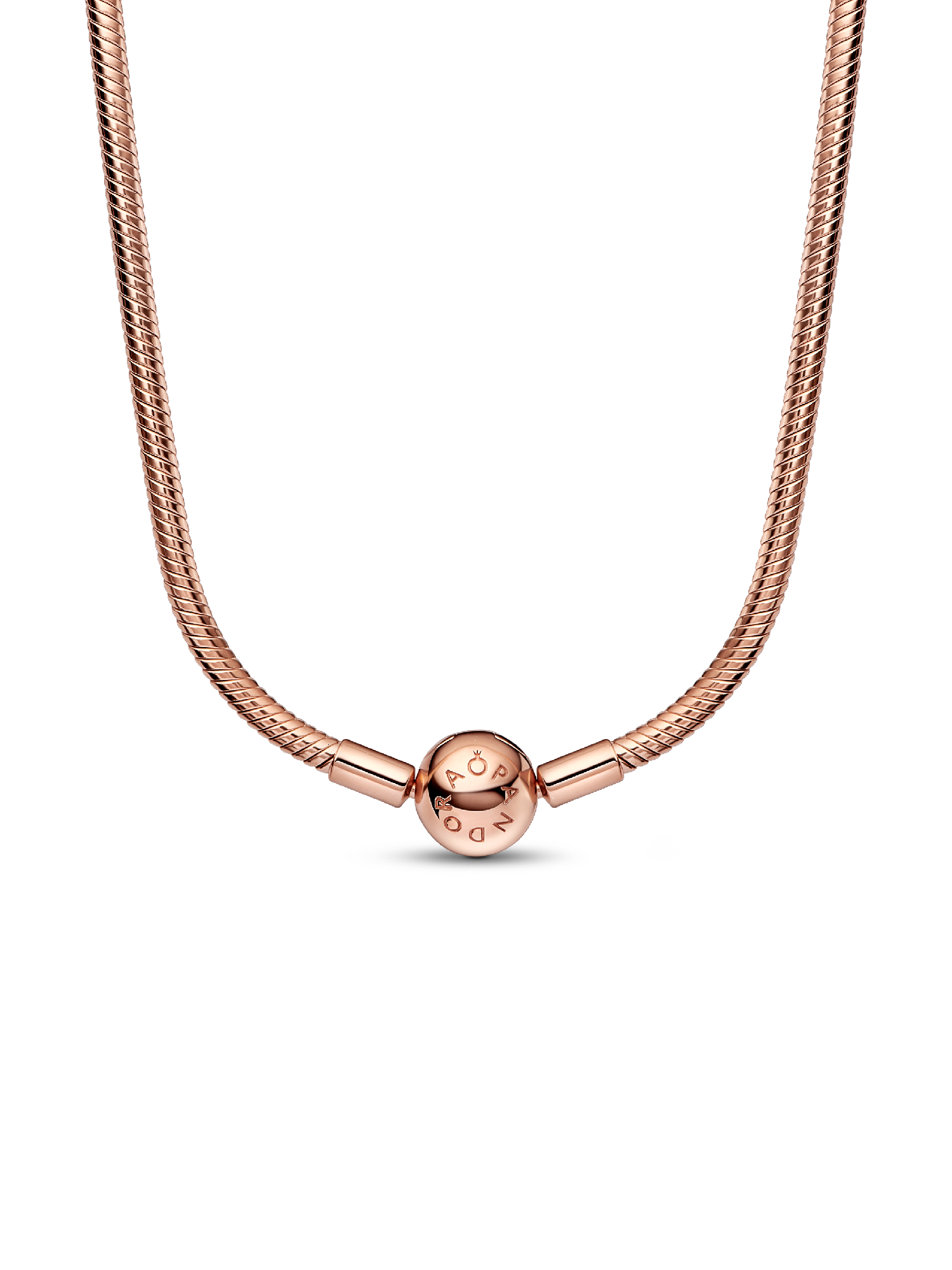 Say hello to your new jewelry box staple with the Pandora Moments Snake Chain Necklace. Hand-finished with 14k rose gold plating, this simple yet elegant design features Pandora’s iconic snake chain pattern and a ball clasp embossed with the Pandora logo. Wear it on its own or style with a Pandora O Pendant and keep your favorite charms close to your heart.