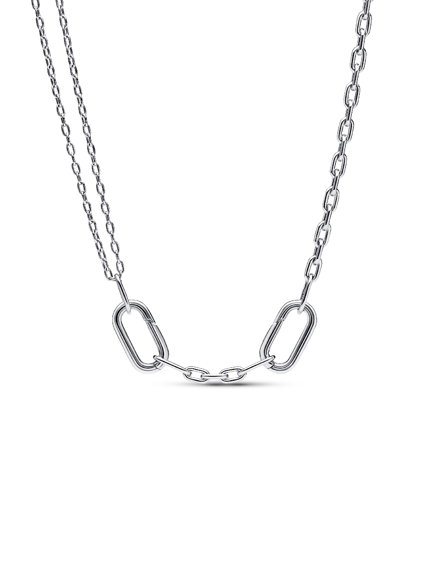 Our sterling silver Pandora ME Double Link Chain Necklace has endless styling possibilities, featuring two openable links - designed with grooved lines to set them apart - five links between each openable link and a small carabiner clasp closure. Half of the necklace links up to a double chain detail, adding an individual edge to the chain. You can keep the original length, make your link chain longer or turn it into a choker, all by adding and taking away links to suit you. Once you’ve customized your link chain, remix it with meaningful medallion charms and mini dangle charms on the openable links to tell your story.