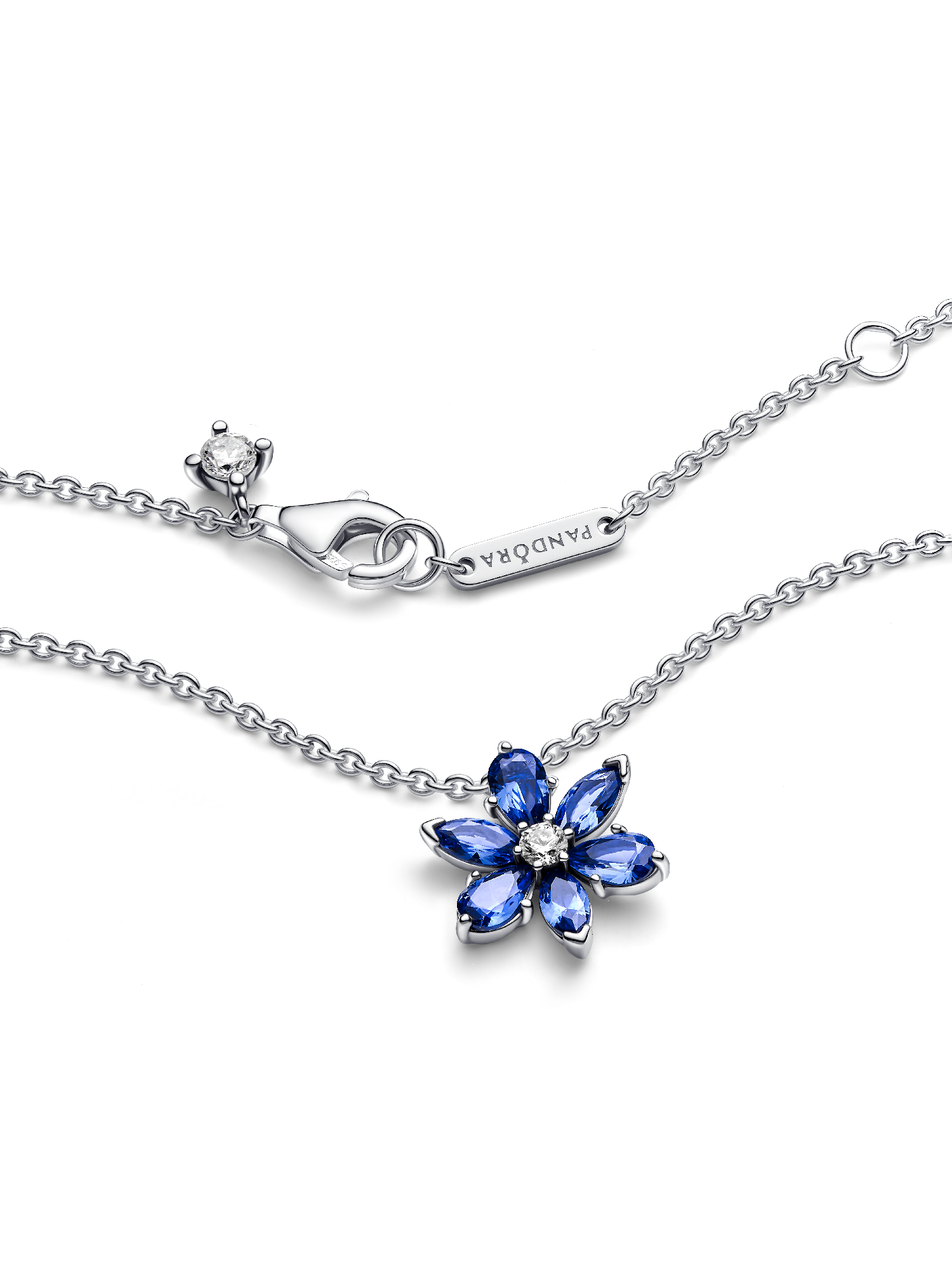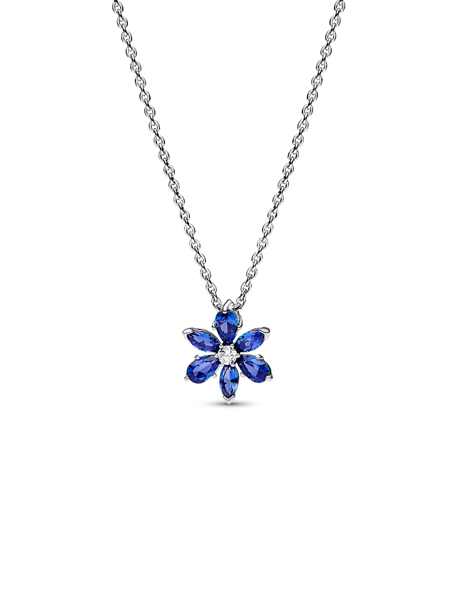 Choose nature-inspired shine with the Sparkling Blue Herbarium Cluster Pendant Necklace. Featuring beautiful blue man-made crystals in the shape of a flower, this sterling silver necklace is inspired by collections of pressed flowers. Featuring marquise, pear and round-cut cubic zirconia, this flower-shaped necklace adds elevated sparkle to every style. Layer and combine different metals (or different coloured stones) together for a look that echoes the vibrant beauty of nature.