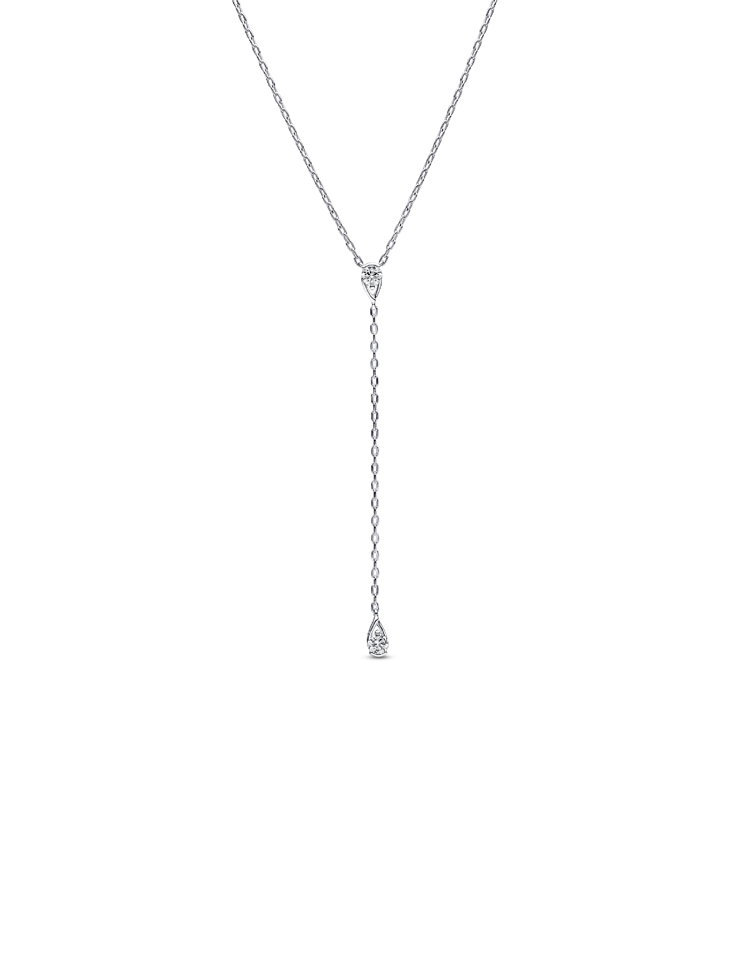 Discover the diamond necklace as unique as you. Our Pandora Infinite Sterling Silver Lab-grown Diamond Drop Necklace features two round brilliant excellent cut lab-grown diamonds, totaling 0.30 carat. One is placed in the centre of the chain, while the other dangles from the drop chain, creating a dramatic Y-shaped design. A prong-and-partial-bezel setting creates a floating effect for each diamond. Inspired by infinite connections, the modern infinity shape flows seamlessly around the stones and represents your eternal bonds. Each Pandora Lab-grown diamond is treated with a post-growth color enhancement called annealing.