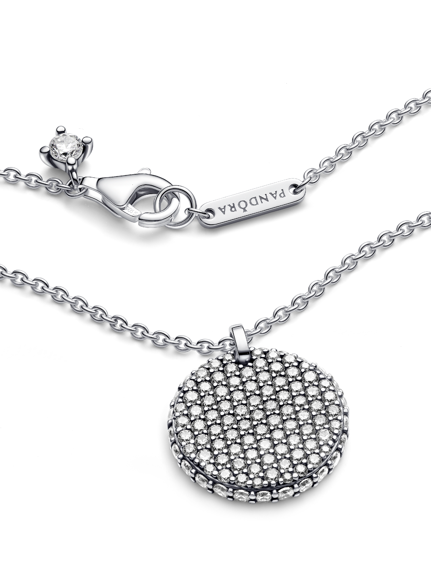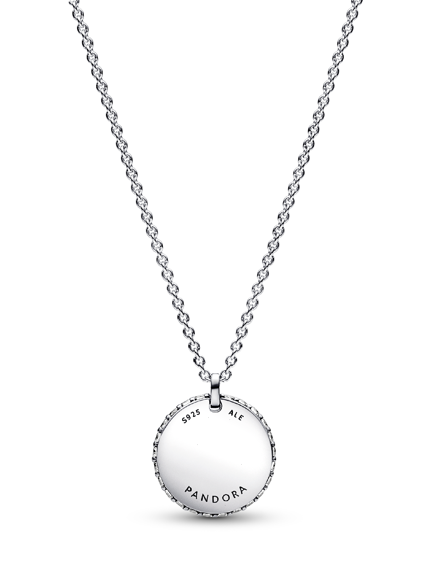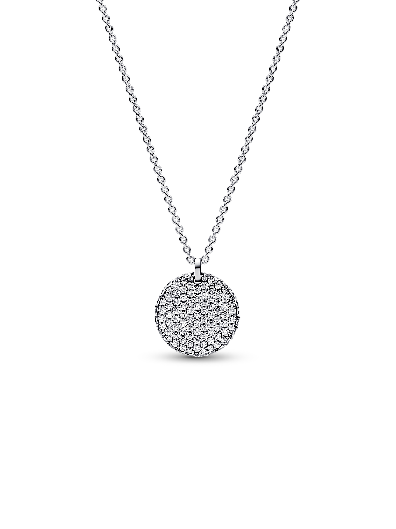 Let your sparkle do the talking with our Pandora Timeless Pavé Round Pendant Necklace. Featuring a medallion-inspired disc covered with 89 clear cubic zirconia, this sterling silver necklace is perfect for all those that love to shine bright. All of the stones face outward and even the edge of the medallion is encrusted for a three-dimensional effect. The back of the disc features an engraving of the Pandora logo. Let your love for sparkle shine with this unique piece or gift it to the person that lights up your life.