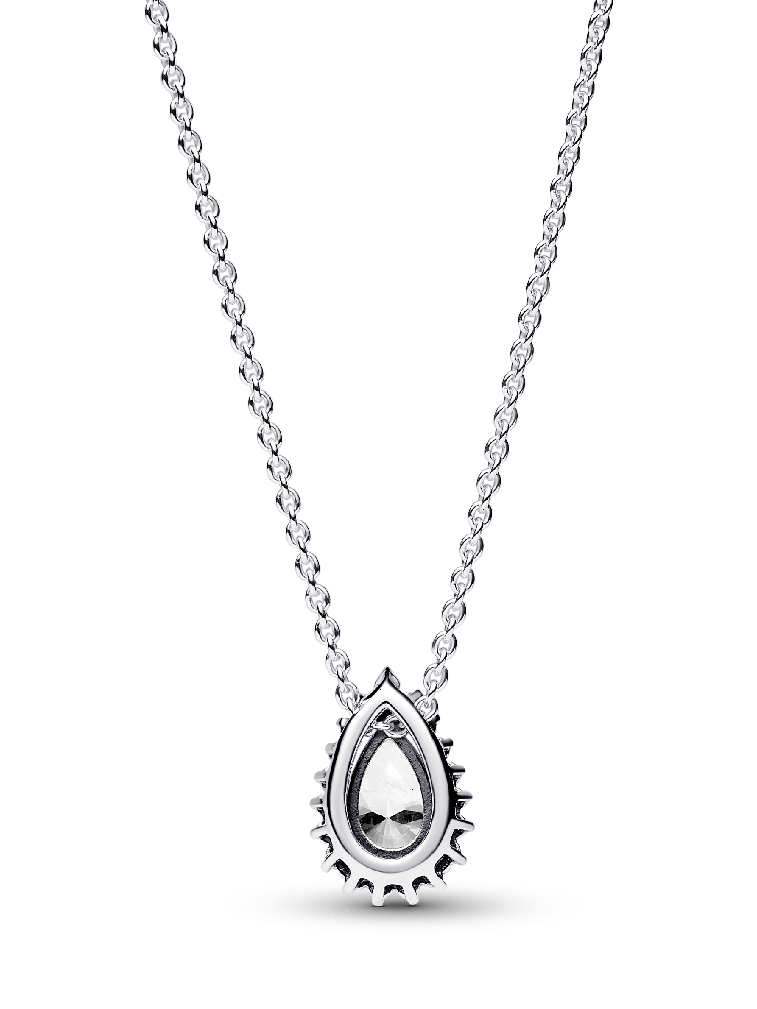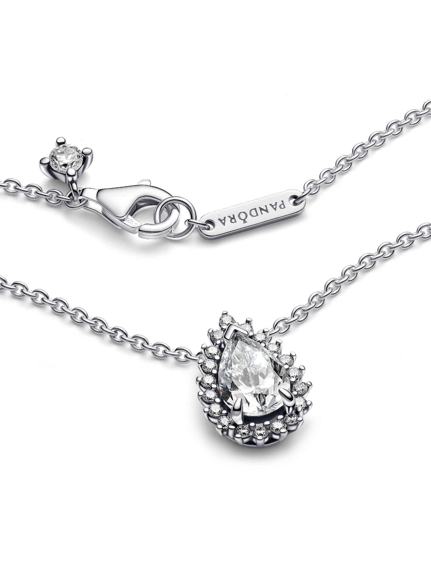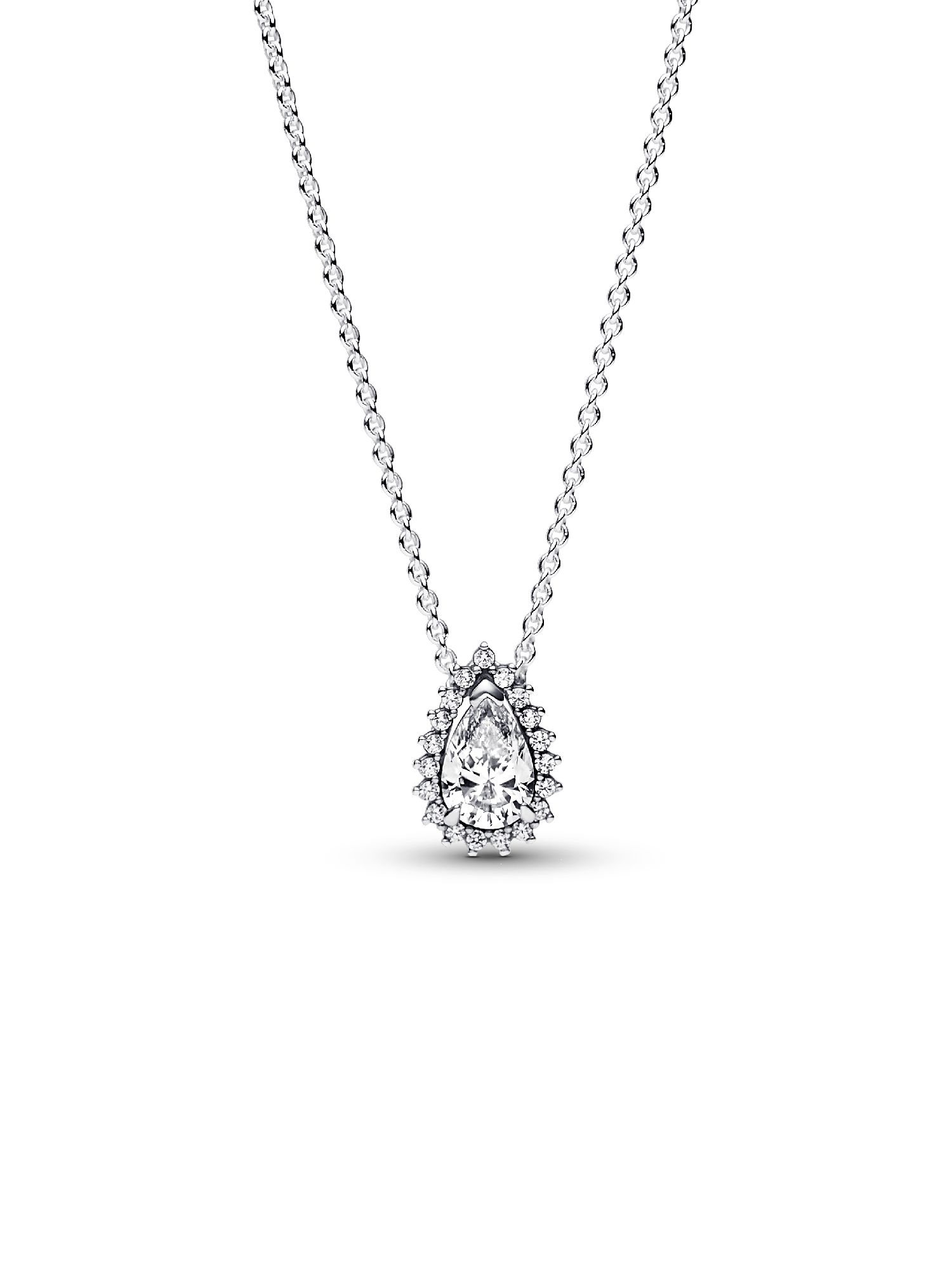 Shine bright every day with the Sparkling Pear Halo Collier Necklace. This sterling silver necklace combines the reimagined pear shape with an iconic element of the Pandora Timeless collection: the pavé halo. The stone of the pendant is set with one V-shaped and two elongated prongs to emphasize the shape, offering a beautiful play on dimension. The pear-shaped pendant slides freely on the chain and can be adjusted in length. A shining statement on its own or beautiful layered with other chains, this pendant effortlessly combines sparkling stones with timeless design.