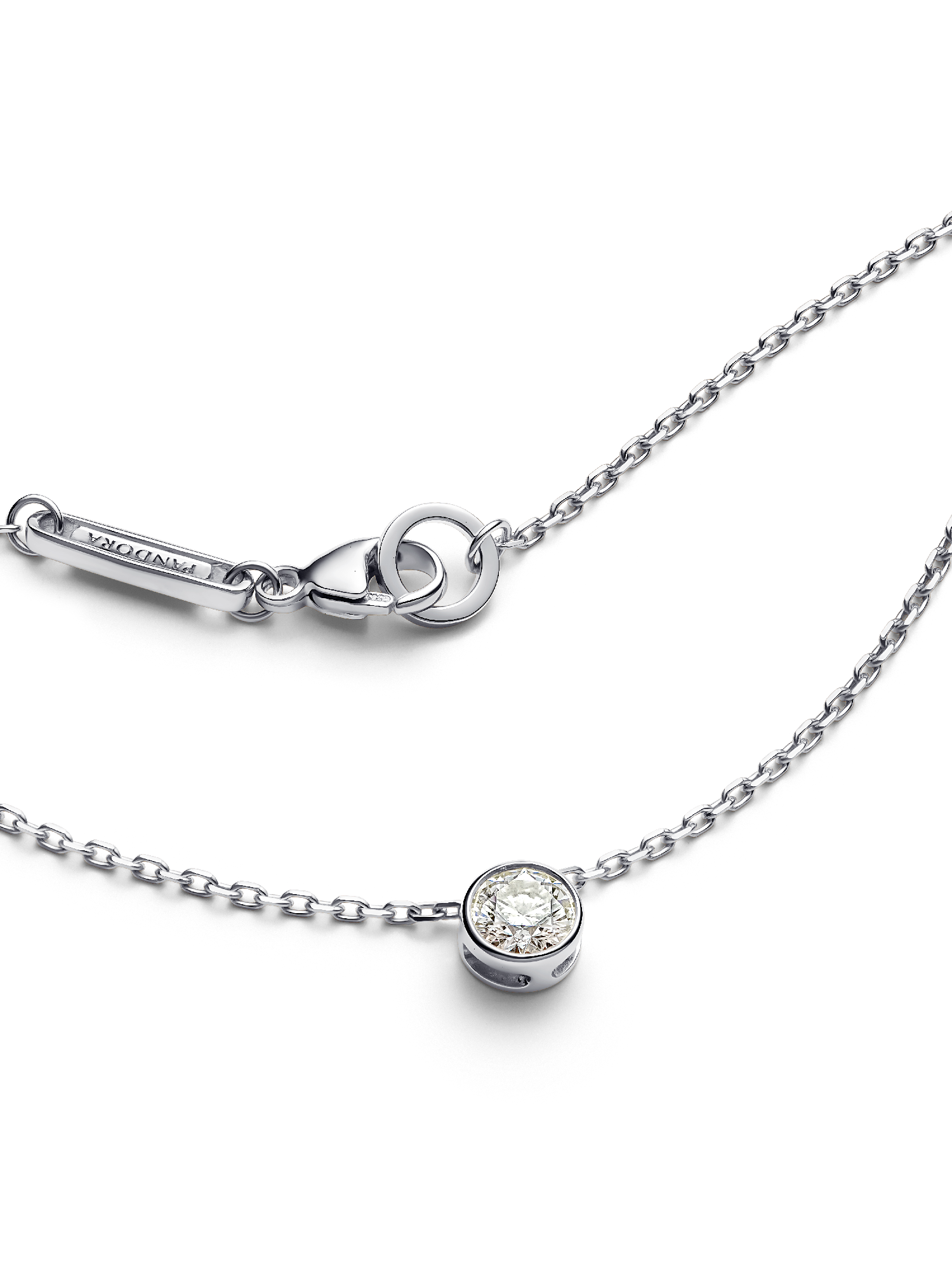 Meet your new essential necklace: the Pandora Era Bezel Sterling Silver Lab-grown Diamond Pendant Necklace. This sterling silver pendant necklace features a 0.25 carat lab-grown diamond in a bezel setting with a sleek, contemporary aesthetic. Cut-outs on the back and sides of the bezel setting let in the light for ultimate sparkle. The pendant moves freely along a diamond-cut cable chain, adjustable to two lengths. A classic that brilliantly rises above time, it's the perfect elevated staple for your everyday looks. Each Pandora Lab-grown diamond is treated with a post-growth color enhancement called annealing.