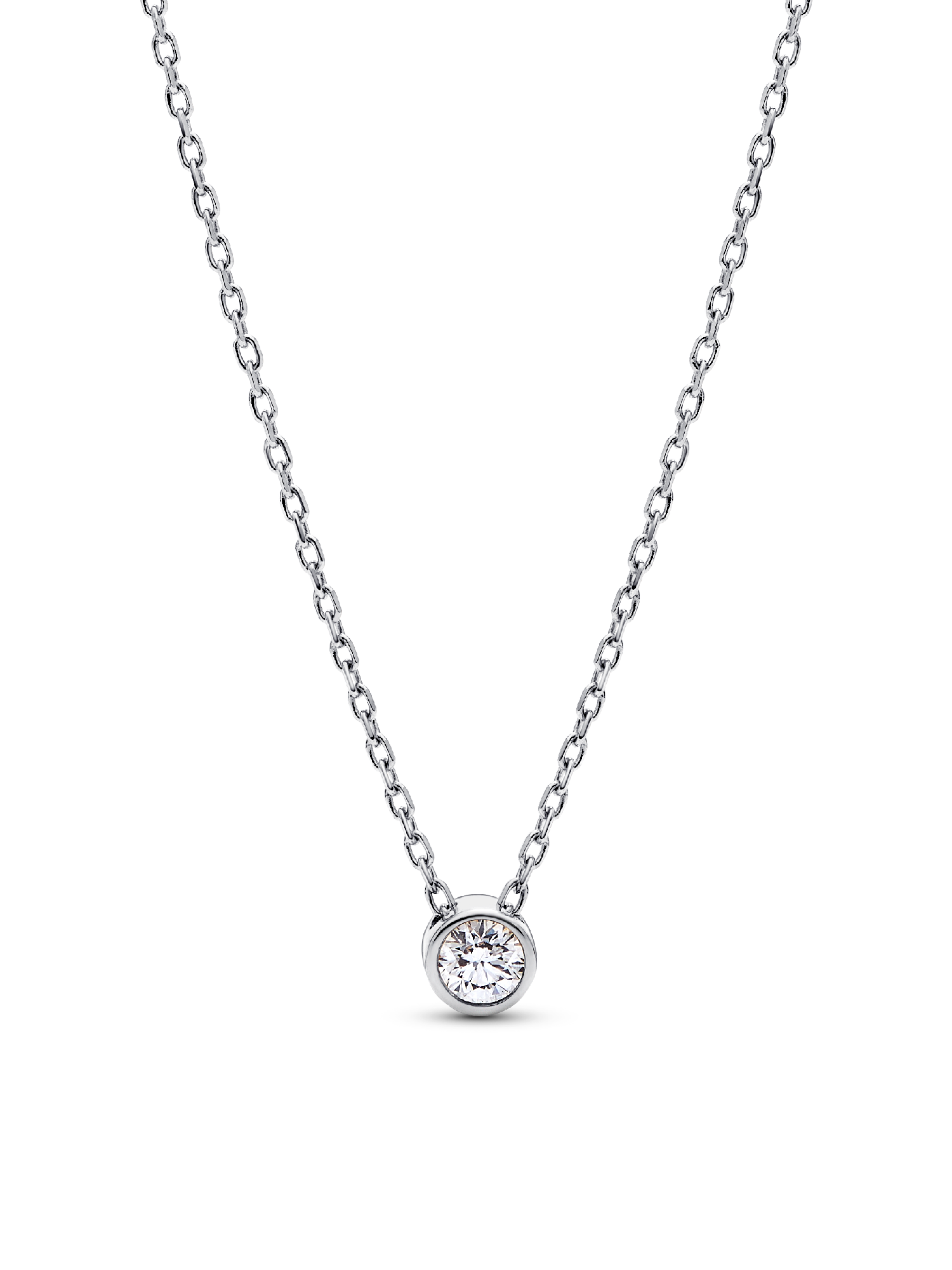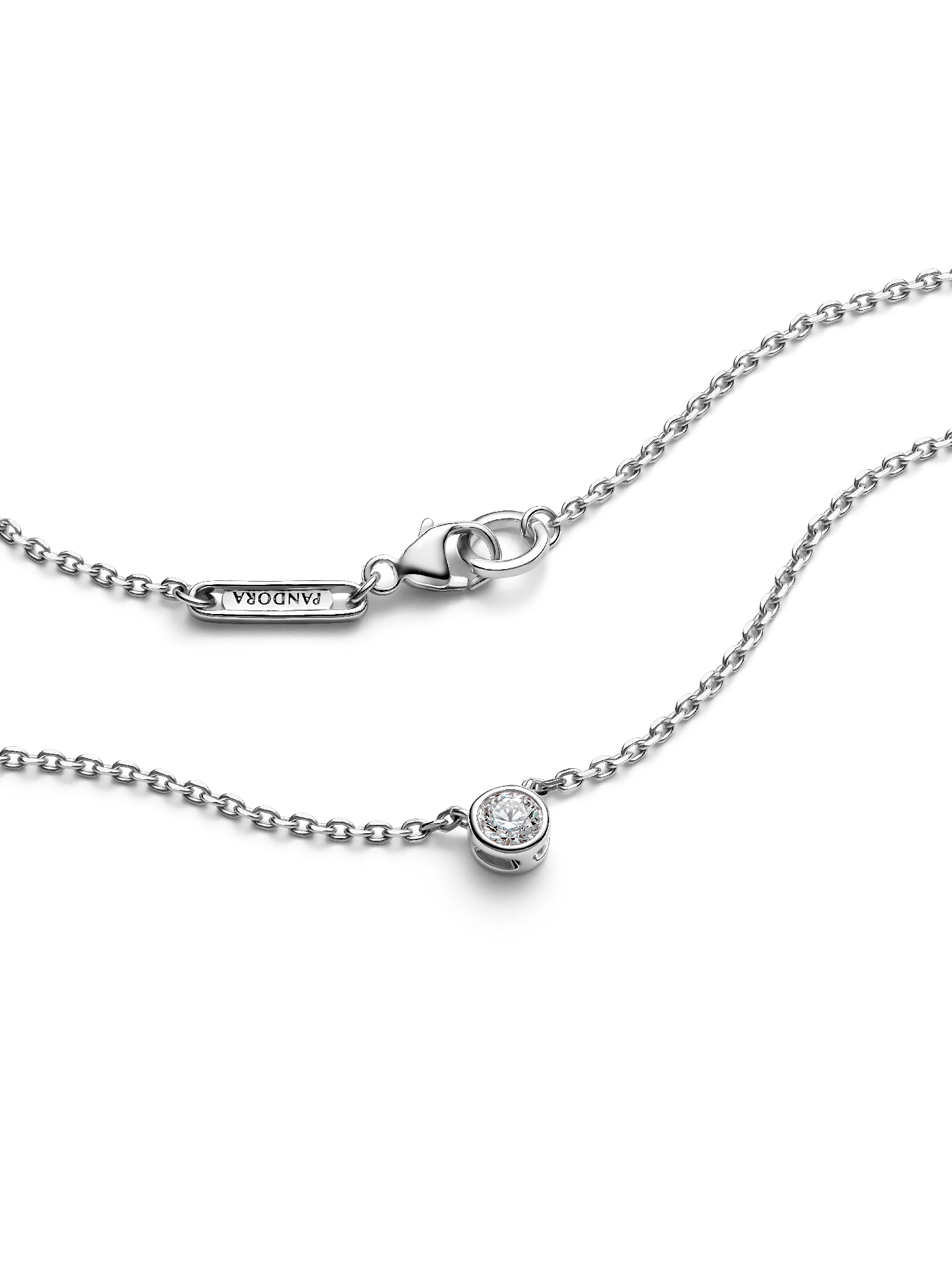 Meet your new essential necklace: the Pandora Era Bezel Sterling Silver Lab-grown Diamond Pendant Necklace. This sterling silver pendant necklace features a 0.15 carat lab-grown diamond in a bezel setting with a sleek, contemporary aesthetic. Cut-outs on the back and sides of the bezel setting let in the light for ultimate sparkle. The pendant moves freely along a diamond-cut cable chain, adjustable to two lengths. A classic that brilliantly rises above time, it's the perfect elevated staple for your everyday looks. Each Pandora Lab-grown diamond is treated with a post-growth color enhancement called annealing.