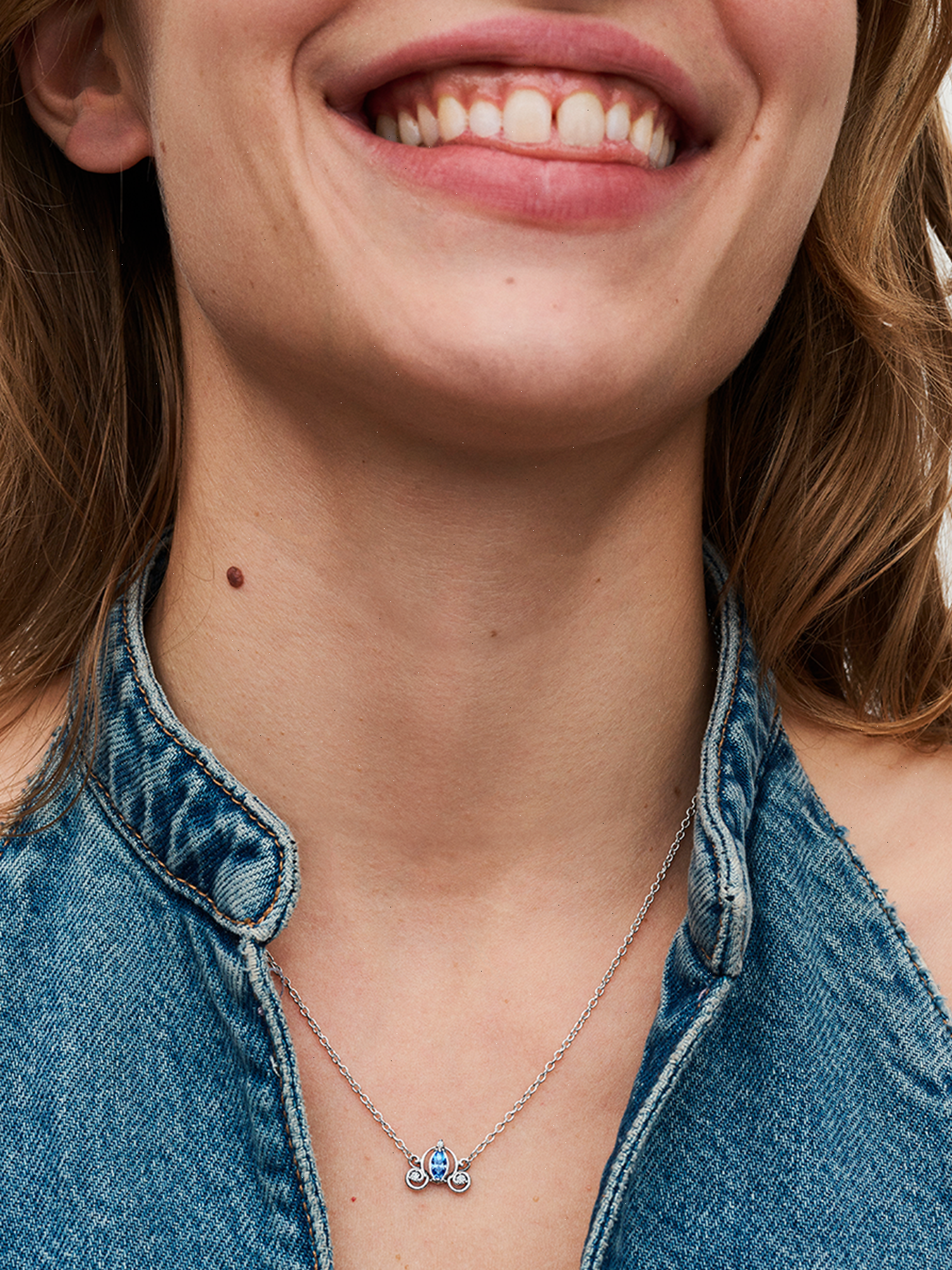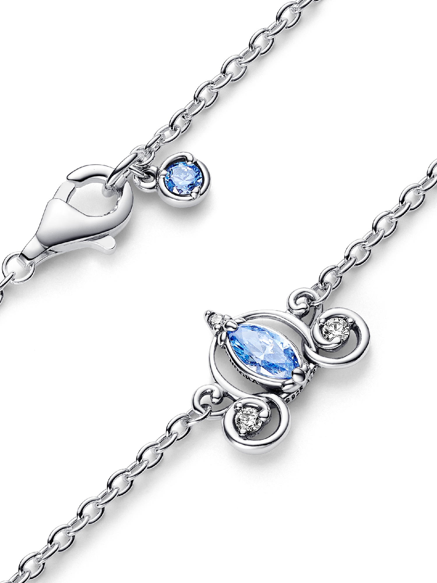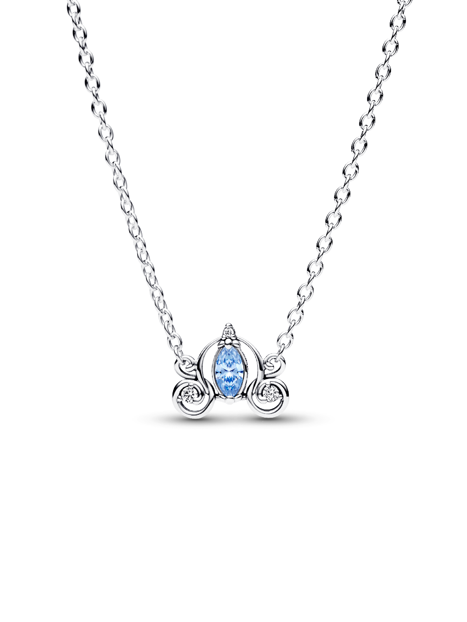 Follow the call of the ball with the Disney Cinderella's Carriage Collier Necklace from Disney x Pandora. This sterling silver necklace features an intricate pendant inspired by Cinderella's enchanted pumpkin carriage, with a blue marquise-shaped stone surrounded by swirling openwork details. Small cubic zirconia stones sparkle on the wheels and pumpkin stem. The pendant is fixed to the chain, and the necklace is adjustable to three lengths. Style it together with the matching stud earrings for an elevated Cinderella-inspired look.