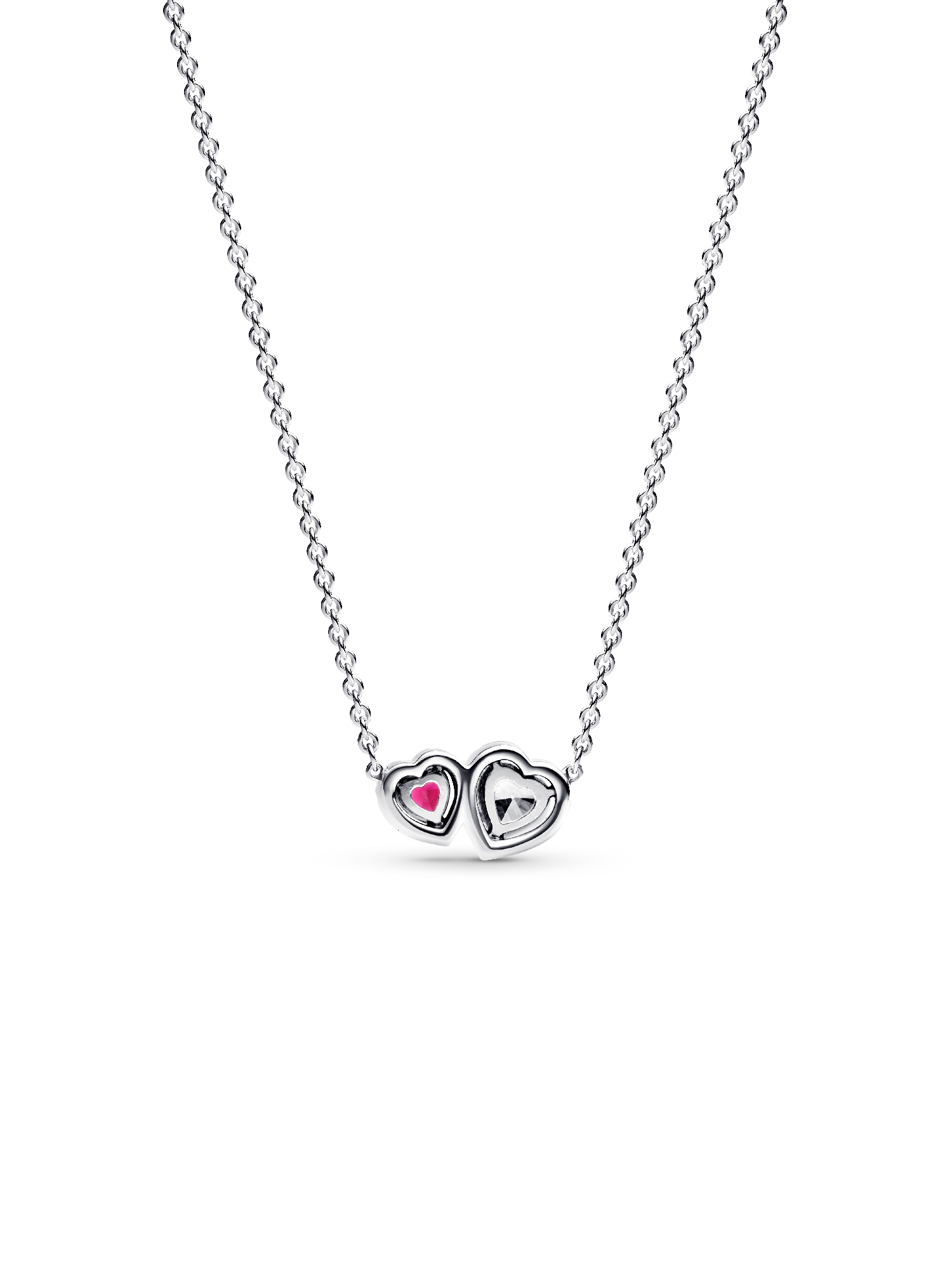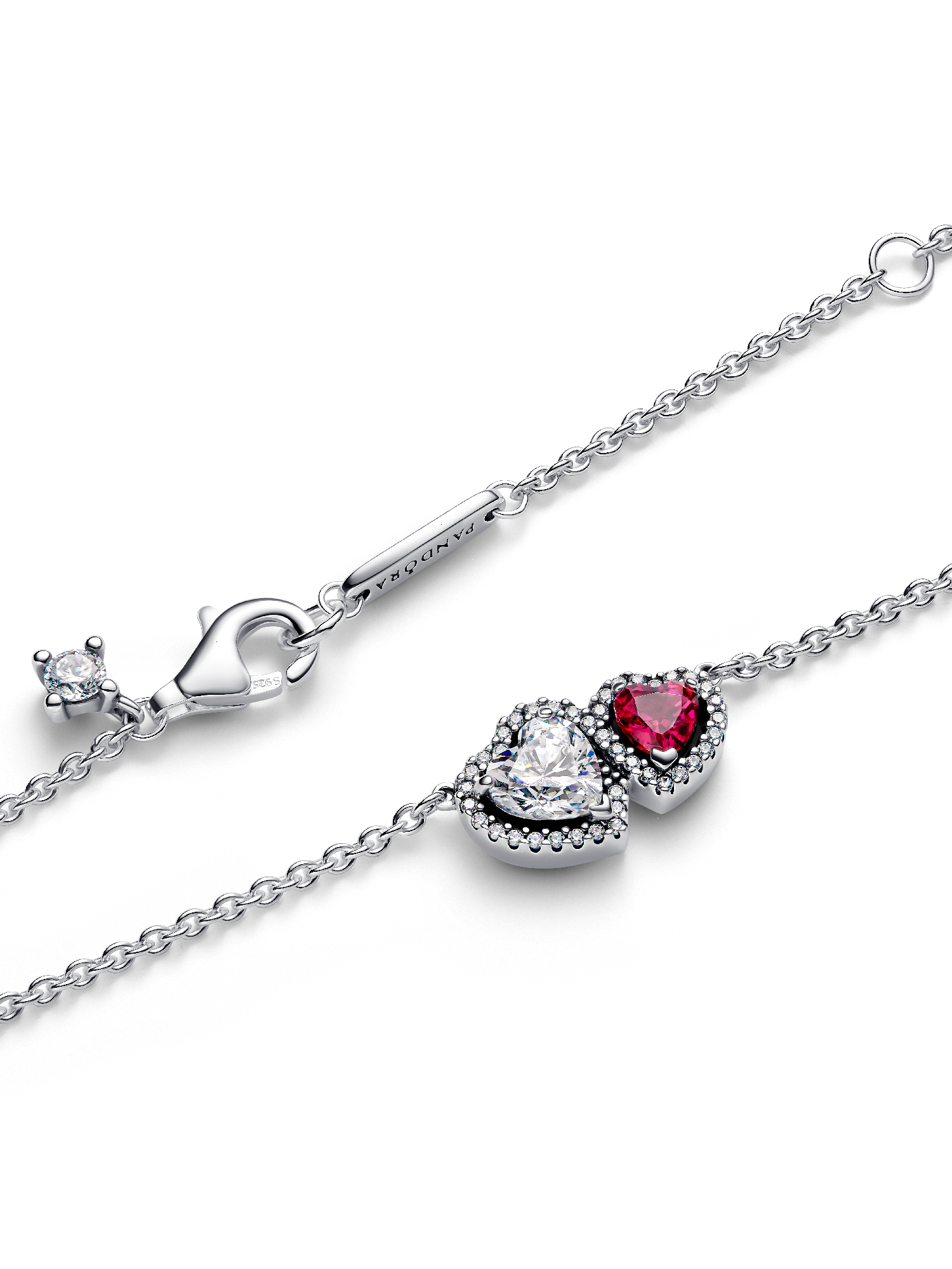 What the heart wants. The Halo Hearts Pendant Necklace features two connected hearts that symbolize profound love. Crafted in sterling silver, this piece showcases a heart-cut red man-made crystal and a heart-cut clear cubic zirconia, surrounded by sparkling pavé stones. With an adjustable cable chain (45 cm, 41.5 cm, and 38 cm), it's perfect for layering or wearing solo to add a touch of romance to your look.