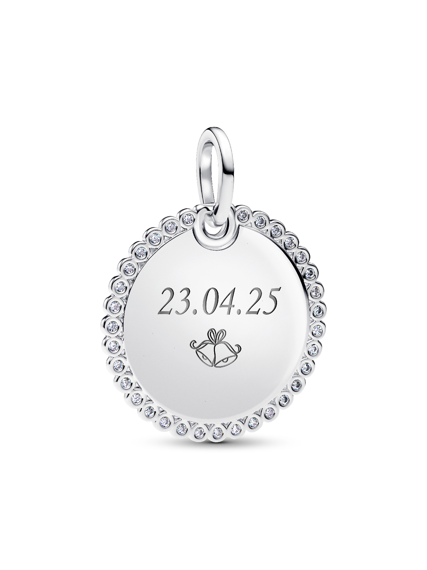 Minimalist style that makes a statement. Add our sterling silver engravable disc pendant, encircled in a halo of sparkling stones, to your collection.