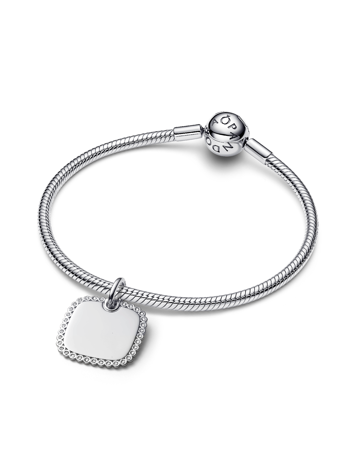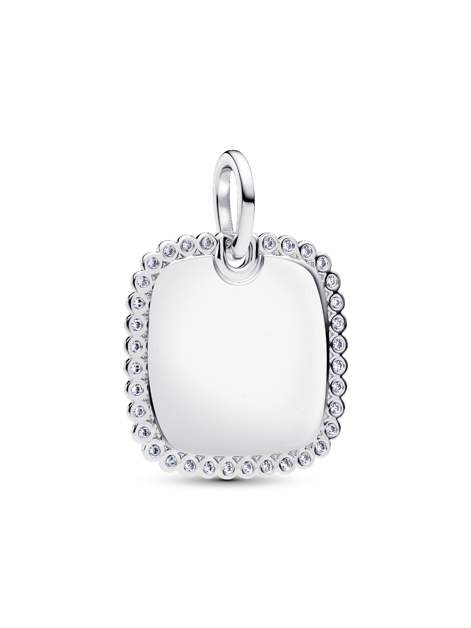 Minimalist style that makes a statement. Add our sterling silver engravable square disc pendant, outlined in a frame of sparkling stones, to your collection.