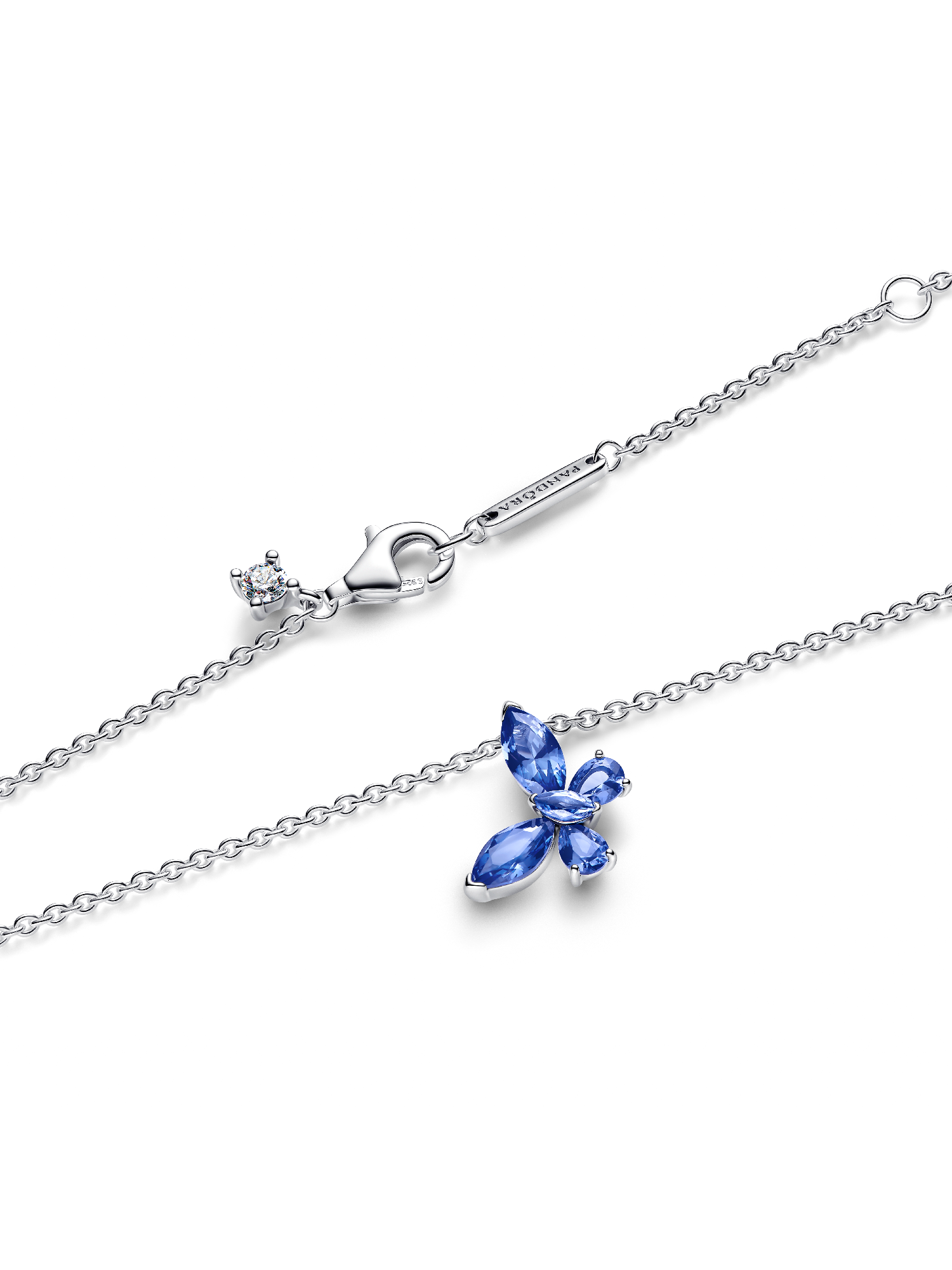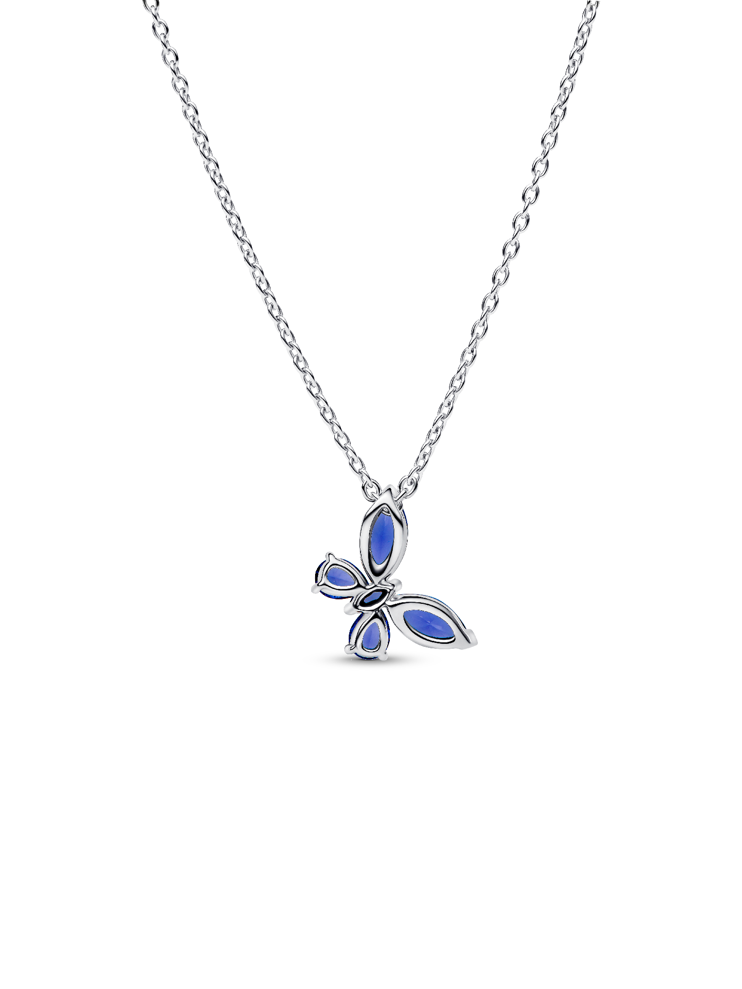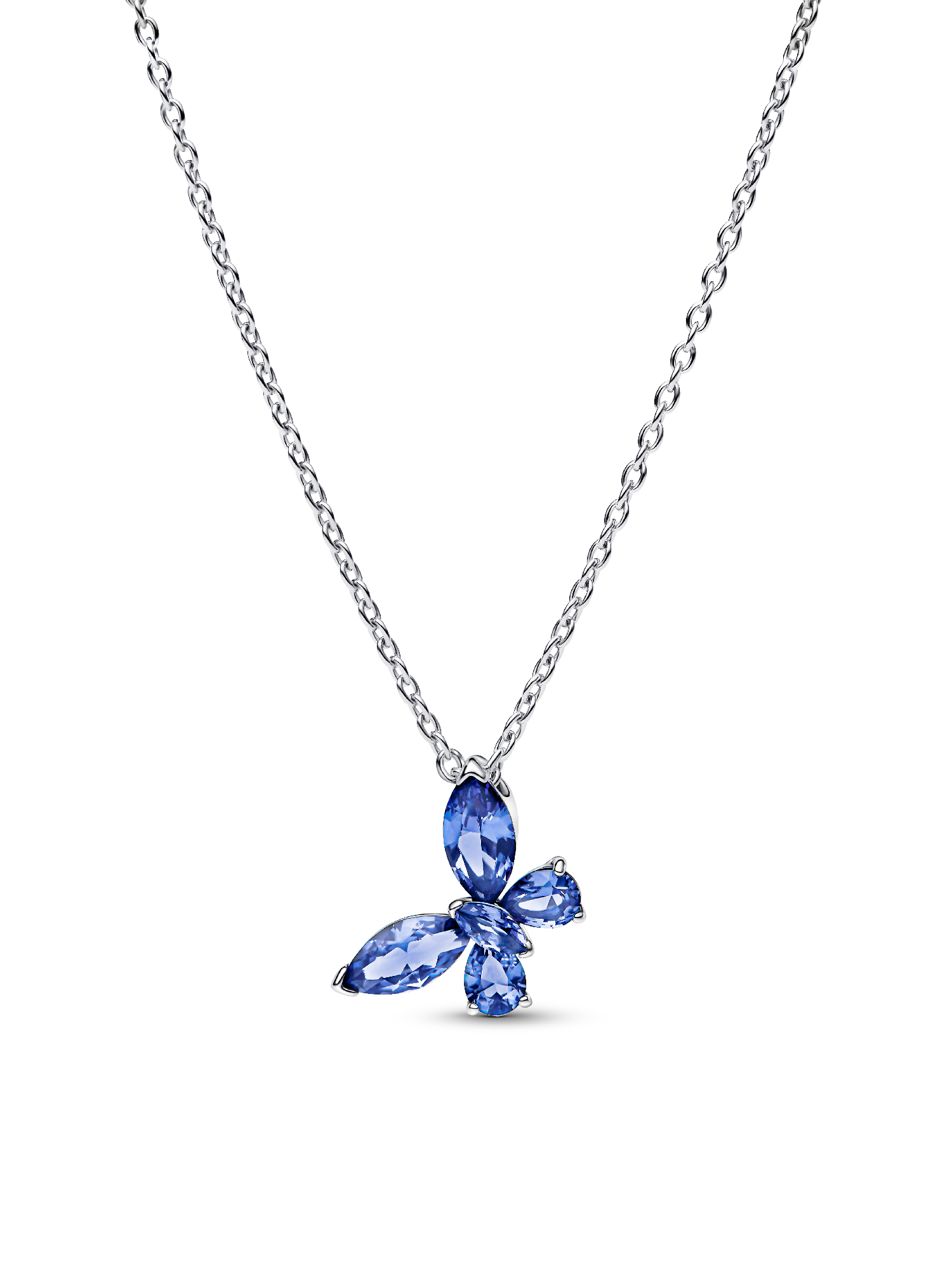 Spread your wings and transform your look with this sterling silver necklace. Set with blue marquise-cut and pear-shaped man-made crystals, a butterfly gracefully dangles from its chain.