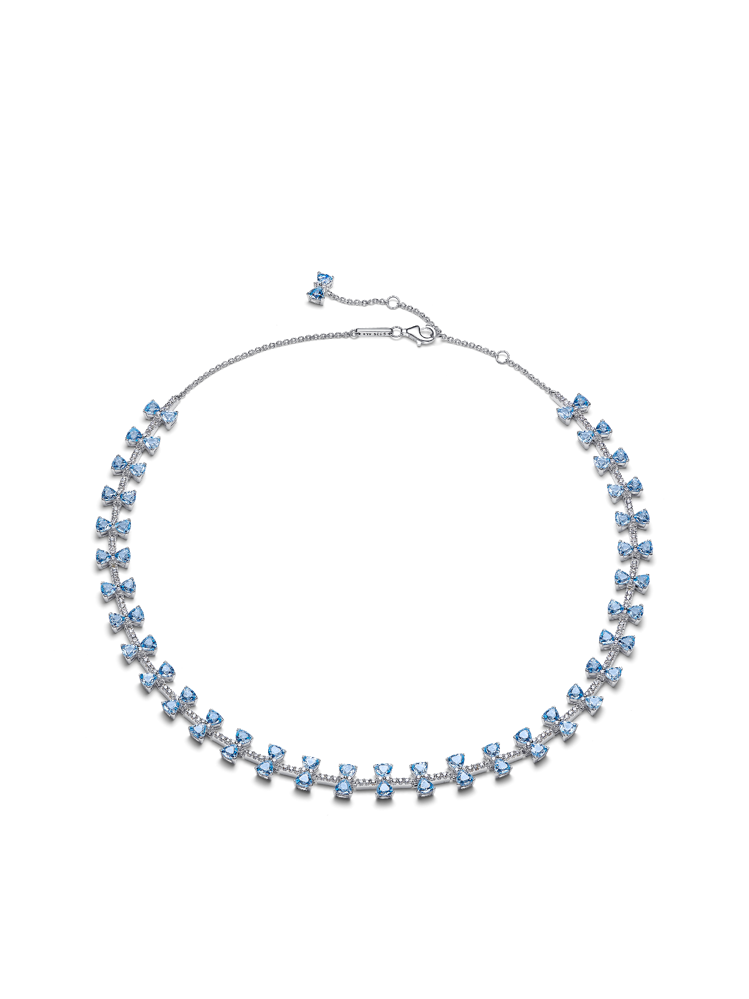 Be the talk of the Ton. Crafted in sterling silver, this Bridgerton-inspired necklace features a row of blue bow-set crystals accented by cubic zirconia. Elegantly spaced, it adds Regency charm to any look.