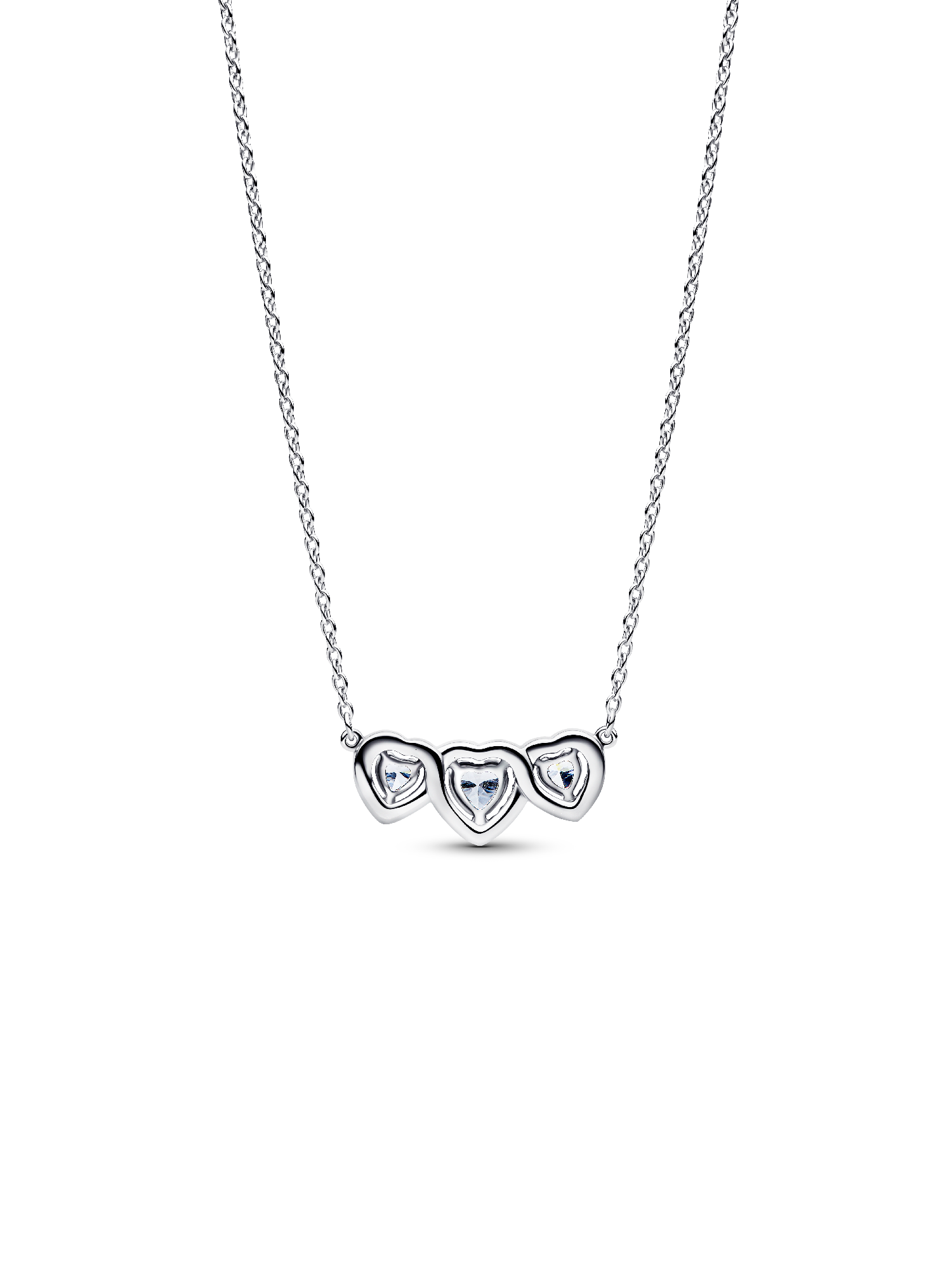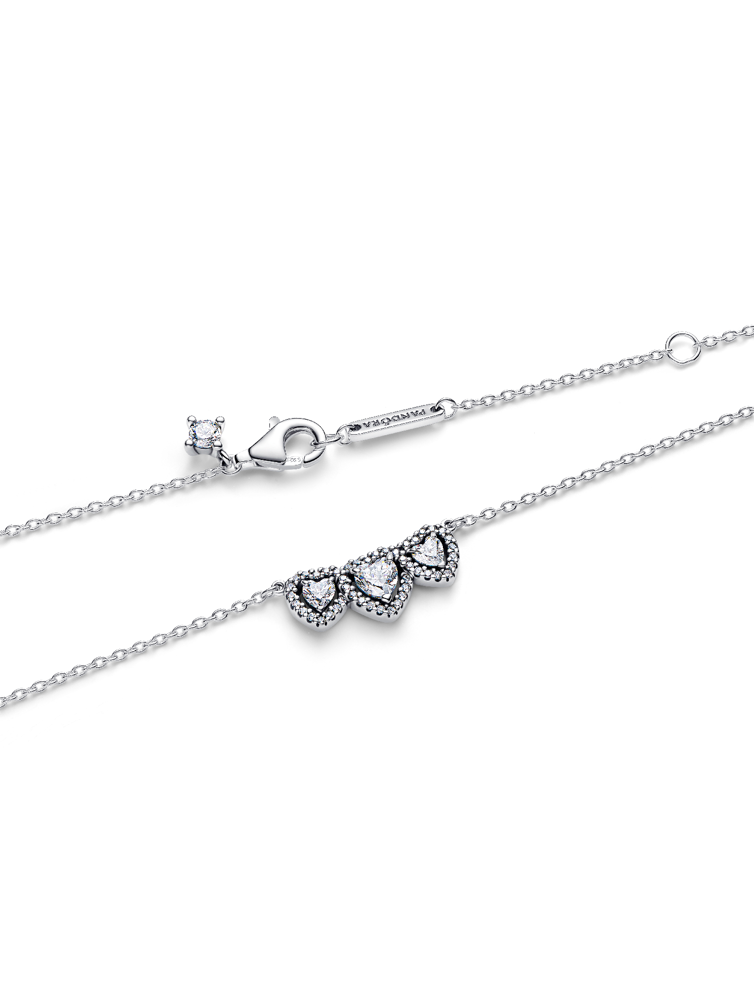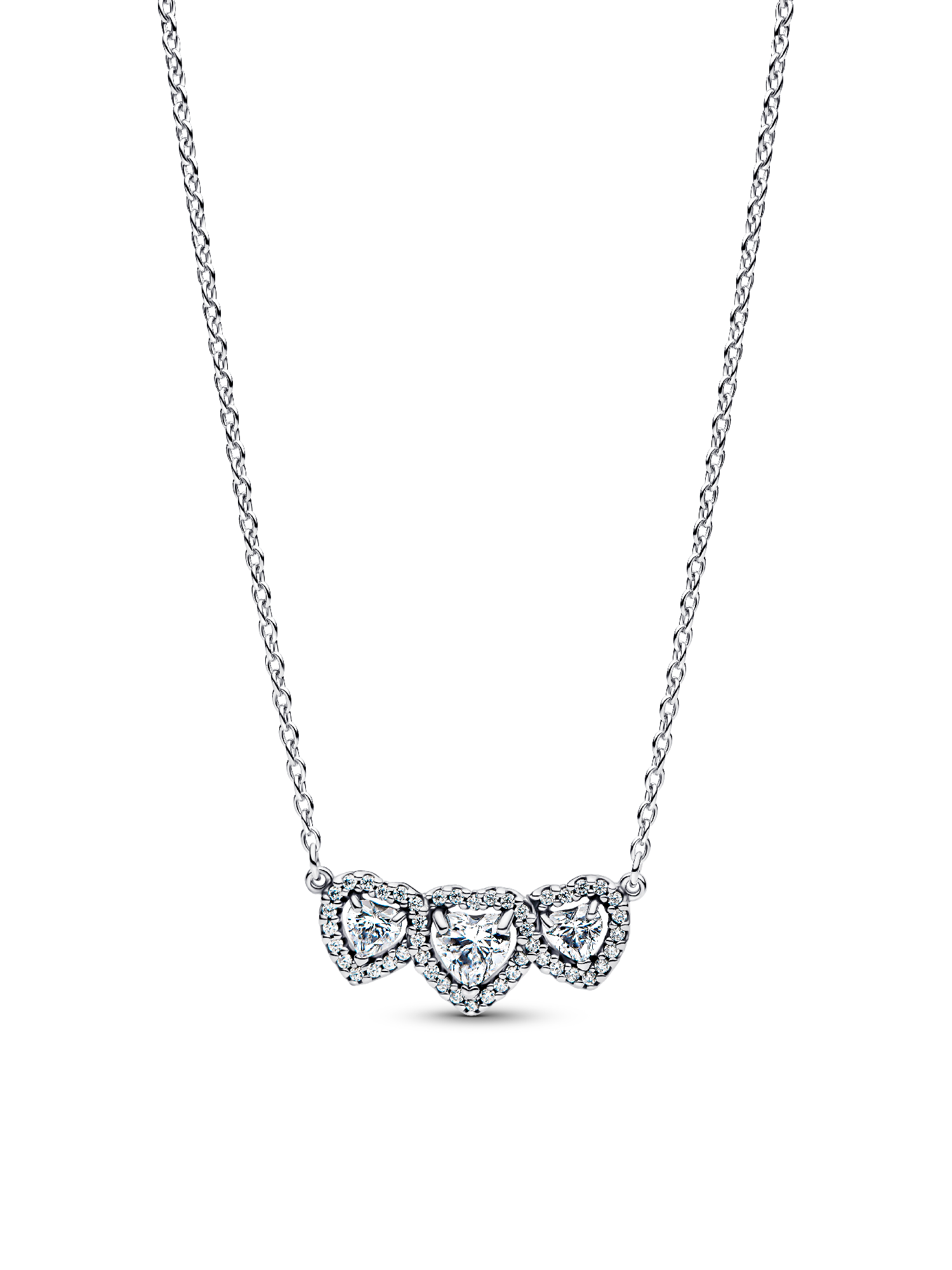 Shine with love. Our sterling silver collier features three heart-shaped cubic zirconia, framed in a radiant halo and joined in perfect harmony. With a fixed pendant and a delicate dangling stone near the clasp