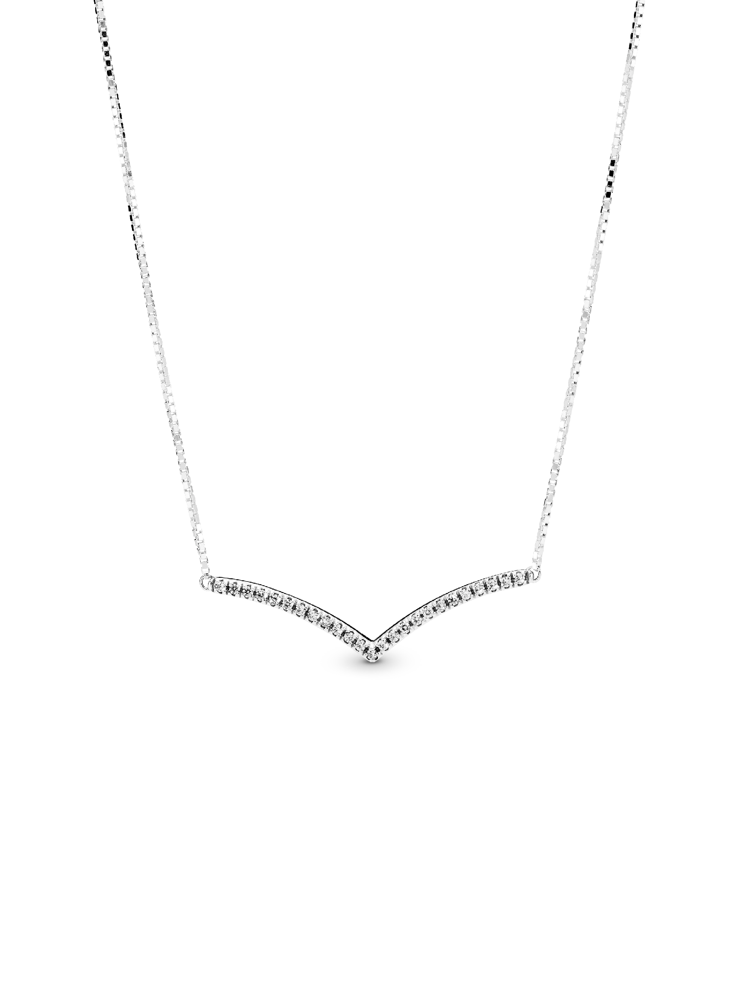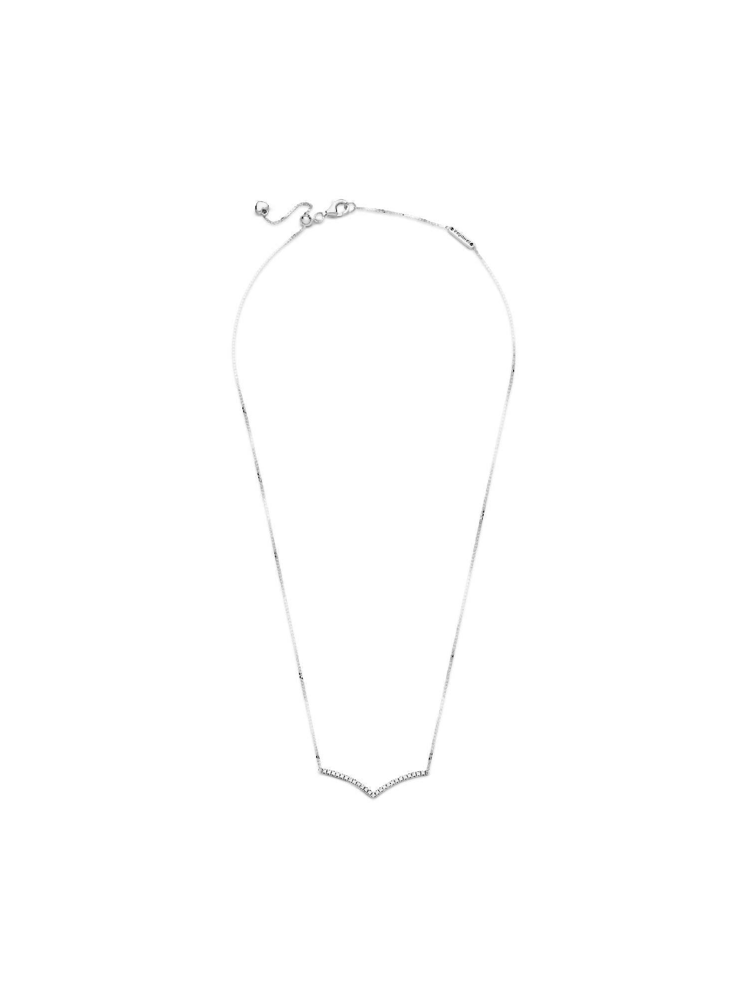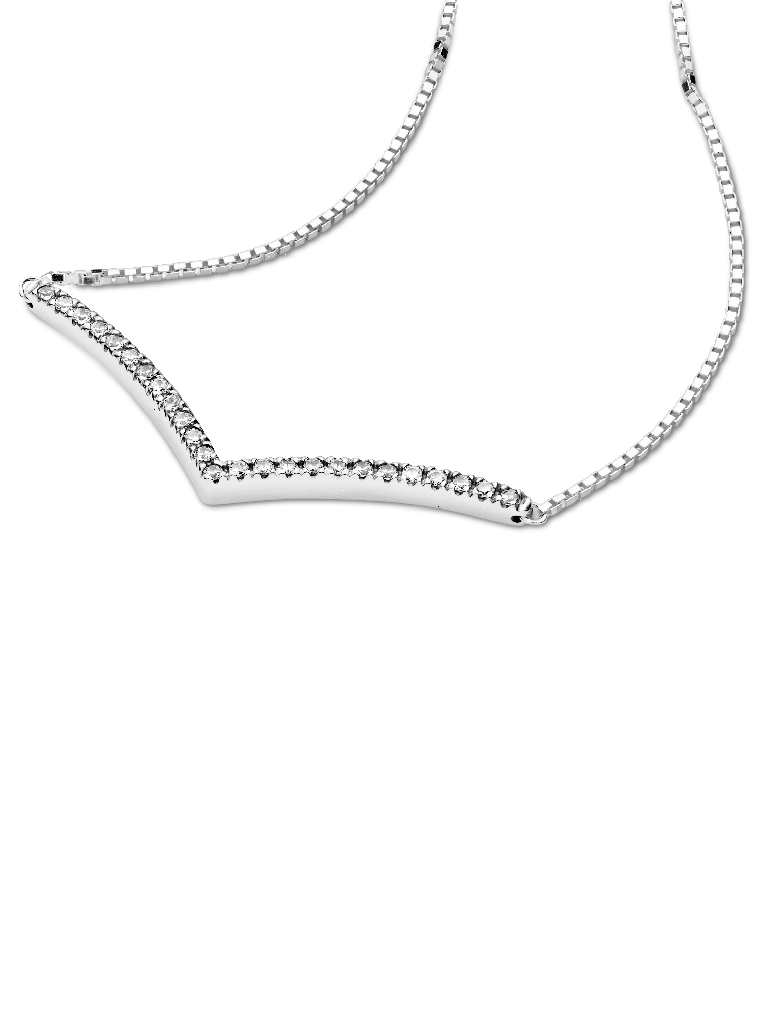 A classic sterling silver design you'll reach for again and again, our wishbone necklace is hand-finished with a chevron-shaped bar set with sparkling cubic zirconia. The necklace chain is fitted with a slider clasp that lets you adjust the drop to suit any neckline. Wear it as a glittering addition to a layered look or alone as an understated statement.