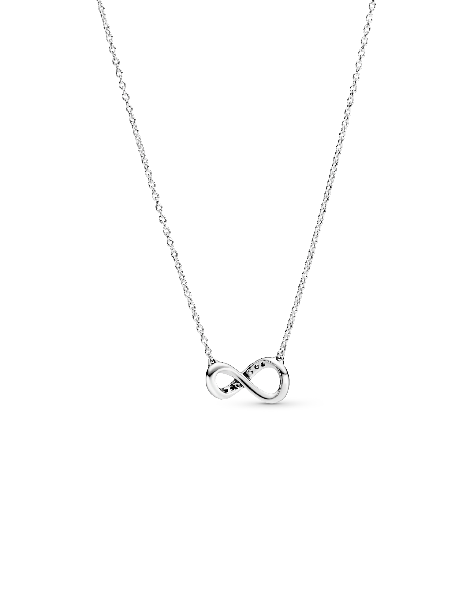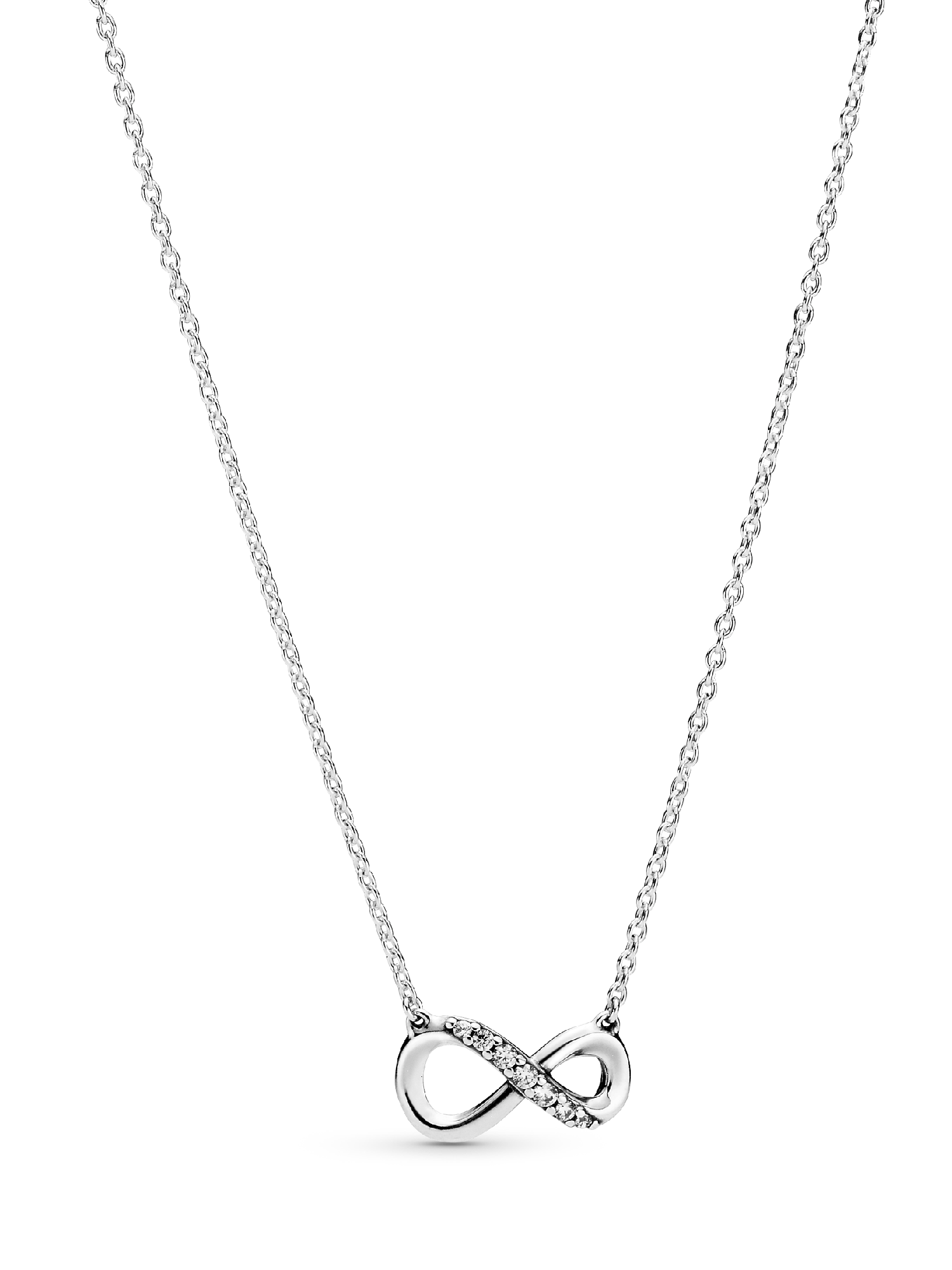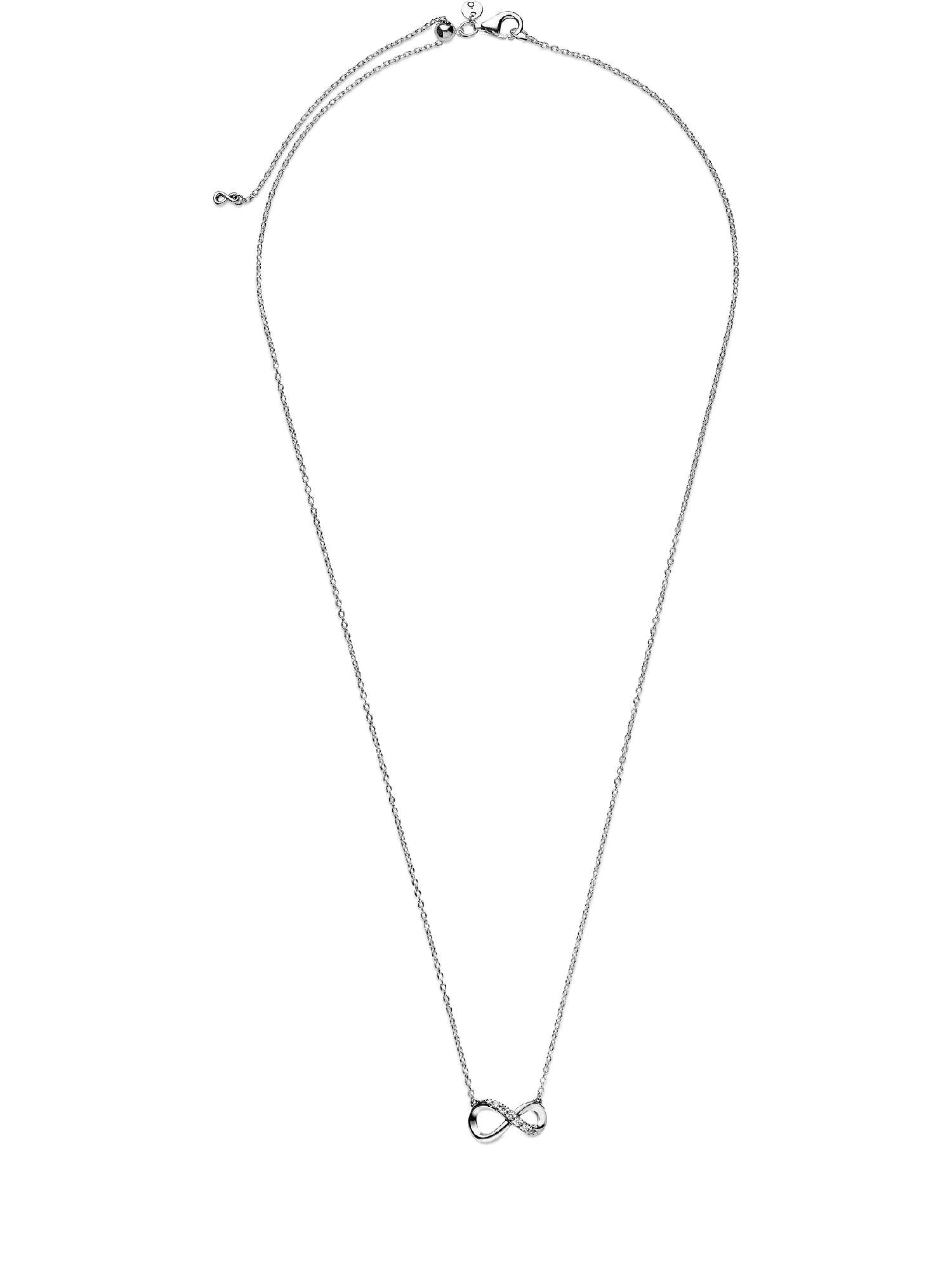 Wear the ultimate symbol of eternal love, the infinity symbol close to your heart with this necklace. A curved design means the infinity symbol rises in the center, creating an eye-catching three-dimensional look while the slider clasp of the collier necklace allows you to adjust the length to suit your style. Crafted in sterling silver and featuring seven bead-set round brilliant-cut clear cubic zirconia, this is a subtle design and delicate form with unique deeper detailing.