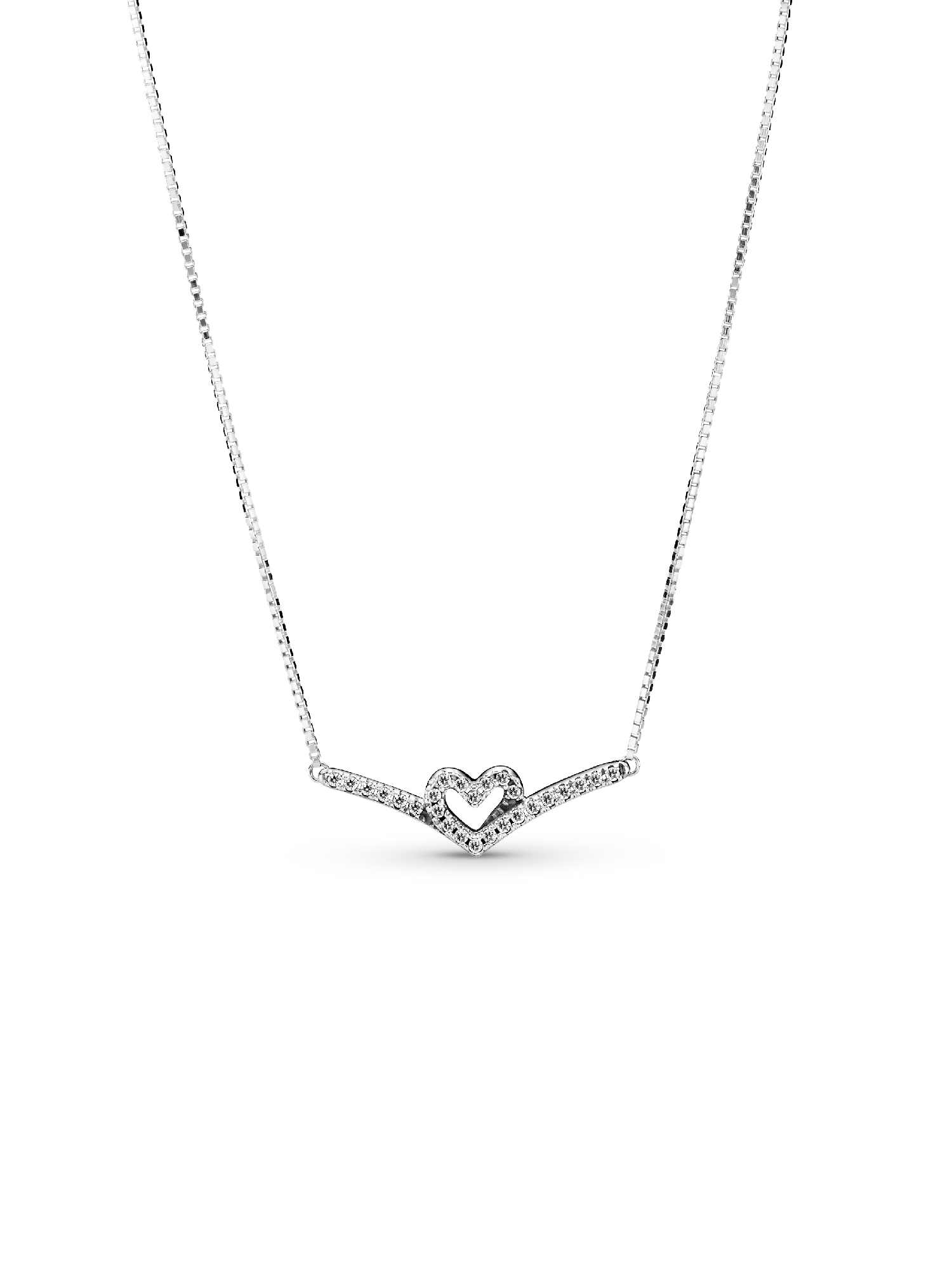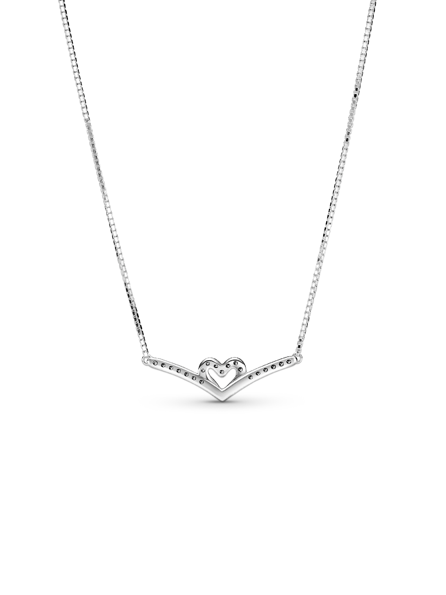 Express your love with the Sparkling Wishbone Heart Collier Necklace. Inspired by design elements from the Pandora Wish collection, this style is hand-finished in sterling silver. The iconic V-shape has been incorporated into the pendant’s sparkling heart detail to create a fluid design. Including a slider clasp for an adjustable fit, the design includes a small polished heart at the end of the chain. Gift to someone special to show you care.