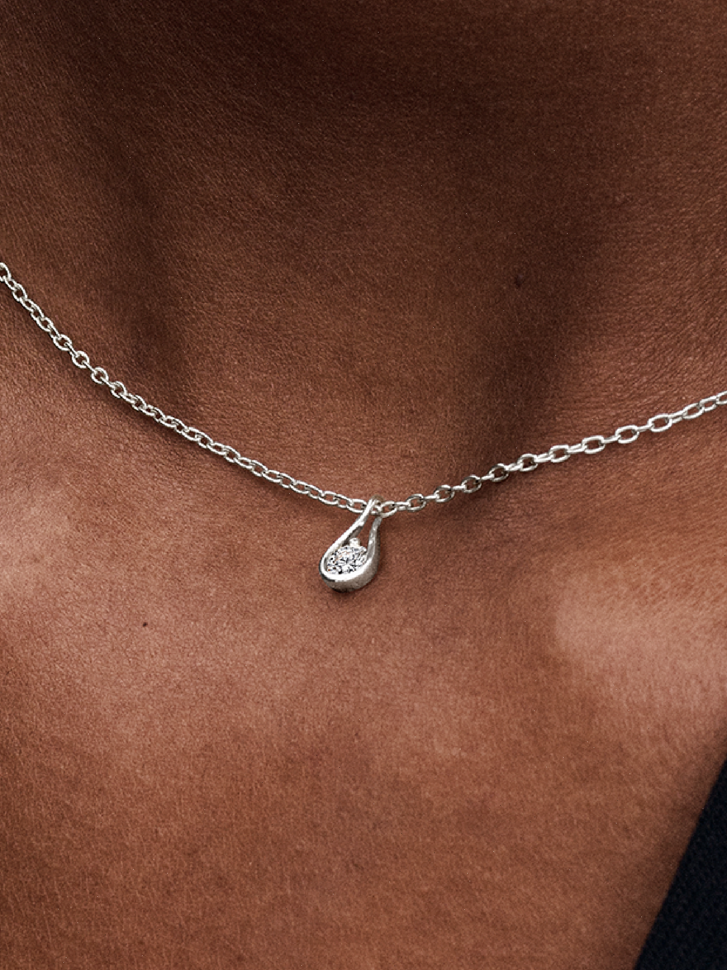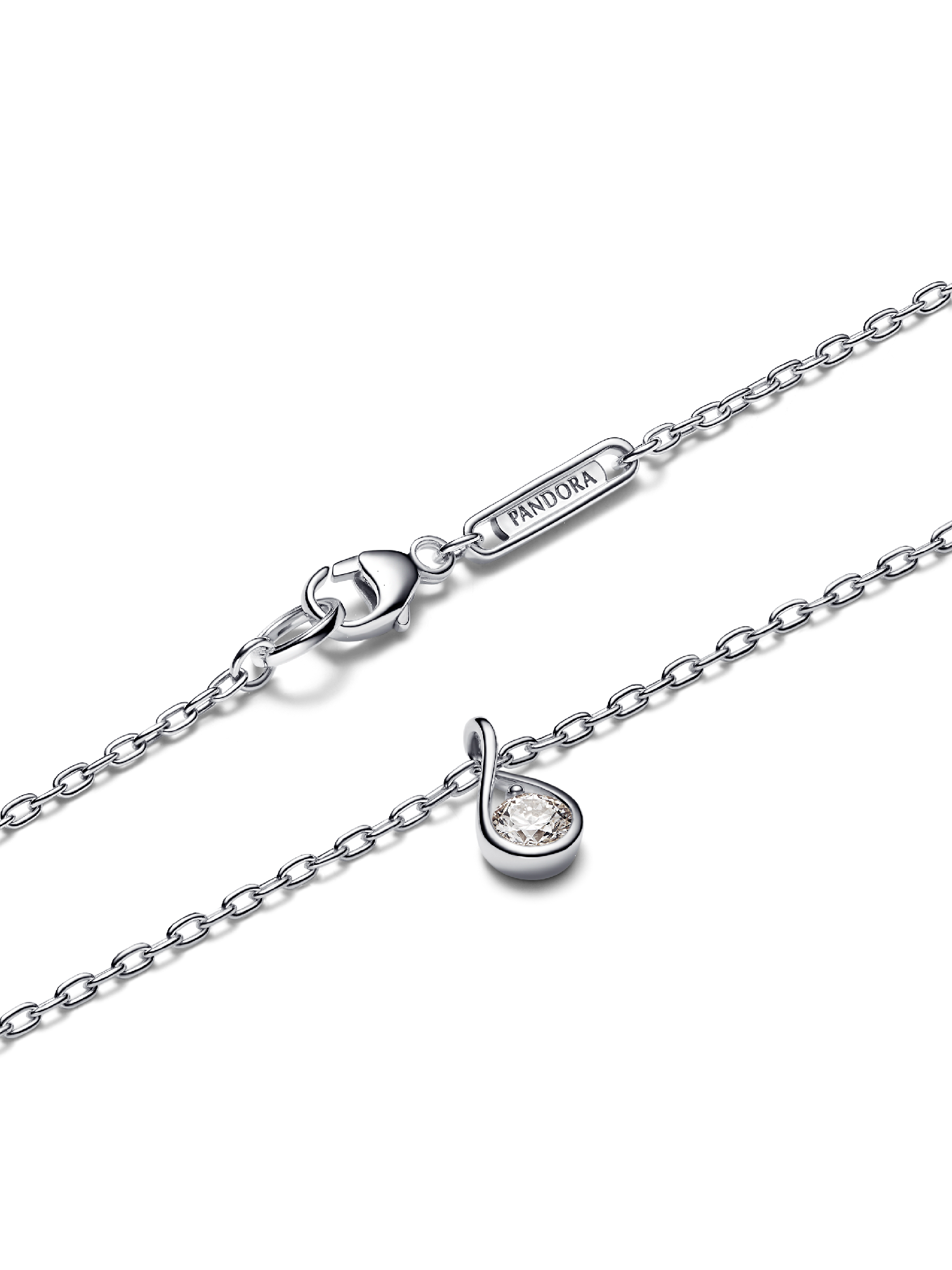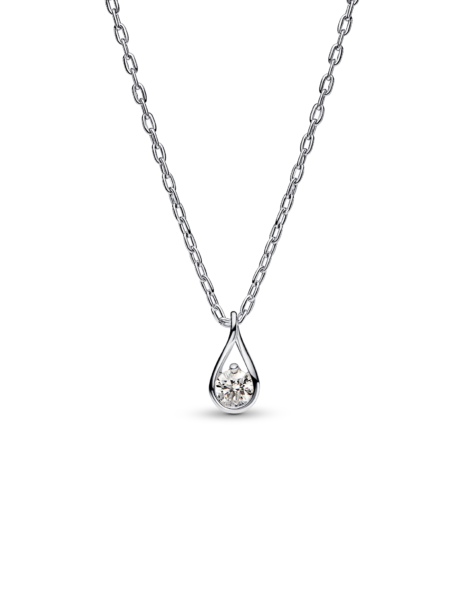 A solid sterling silver pendant hand set with a 0.15 carat lab-grown diamond on a matching sterling silver necklace. A powerful reminder of all we are, all we can be, and the infinite possibility the future holds. This pendant features a fiery round brilliant excellent cut lab-grown diamond in a modern infinity setting that flows around the stone and suspends it in mid-air. The chain is easily adjustable to two lengths. Each Pandora Lab-grown diamond is treated with a post-growth color enhancement called annealing.